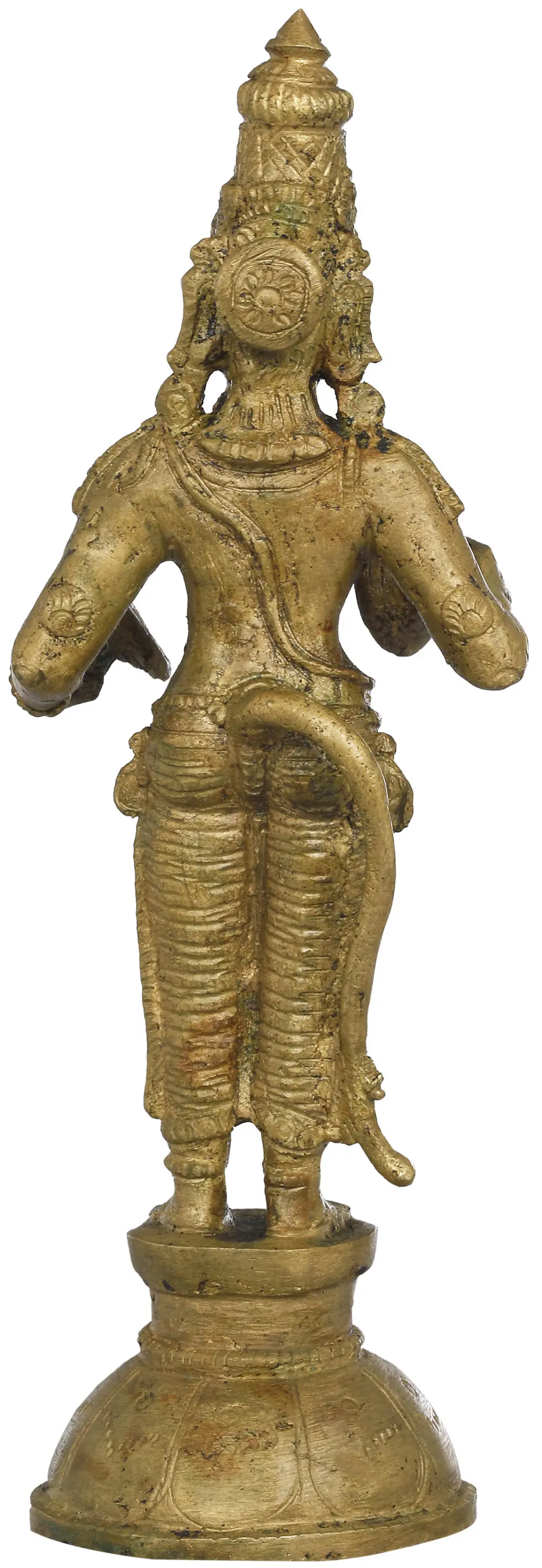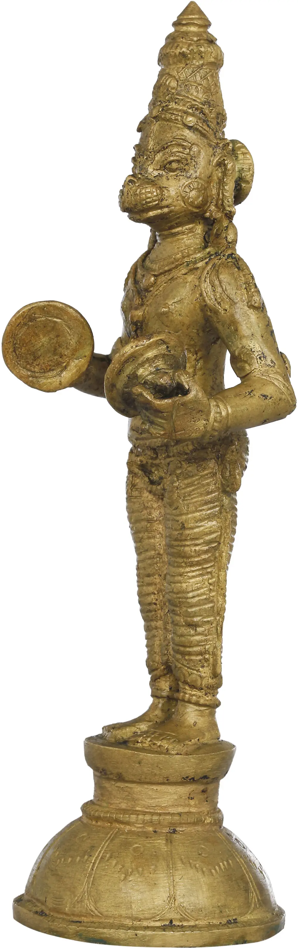 This exquisite bronze statue captures the essence of unwavering devotion. Lord Hanuman, the mighty Vanara and ardent devotee of Lord Rama, is depicted here in a moment of spiritual fervor, his hands holding cymbals ready to strike a resonant beat. The figure stands proudly on an ornate pedestal, radiating a sense of divine presence and joyful worship. The intricate details of his attire, from the bejeweled chest plate to the elaborately draped dhoti, speak of the masterful craftsmanship honed in Swamimalai, a region renowned for its ancient bronzecasting traditions. Hanuman's likeness is depicted with a focused intensity, his face conveying a deep reverence for Lord Rama. In Hindu mythology, Hanuman is celebrated not only for his immense strength and courage, demonstrated when he leaped across the ocean to Lanka and brought back the Sanjeevani herb, but also for his profound humility and absolute dedication. He is the embodiment of *bhakti*, or selfless devotion, and his tales are woven into the fabric of Indian culture, inspiring countless generations. The act of singing *bhajans* (devotional songs) and playing instruments like cymbals is a direct expression of this love and service.