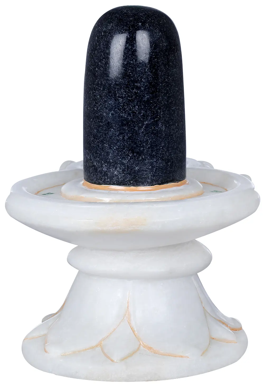 The meticulous craftsmanship evident in this black and white marble Shiva Linga speaks volumes about the dedication and skill of the artisans. The contrasting hues of the marble are expertly chosen, with the dark, almost obsidian-like top section providing a powerful focal point, beautifully complemented by the luminous, pure white marble base. Delicate, almost ethereal etchings, potentially depicting auspicious symbols or the sacred "Om" mantra, can be observed on the Linga, hinting at the spiritual significance beyond its form. The base itself is sculpted with a graceful, flowing design, perhaps mimicking the petals of a lotus flower, a symbol of purity and spiritual awakening, or the waves of the celestial Ganga river that Lord Shiva is said to bear in his matted locks. These artistic embellishments elevate the sculpture from a mere object to a conduit of divine energy and spiritual reflection.