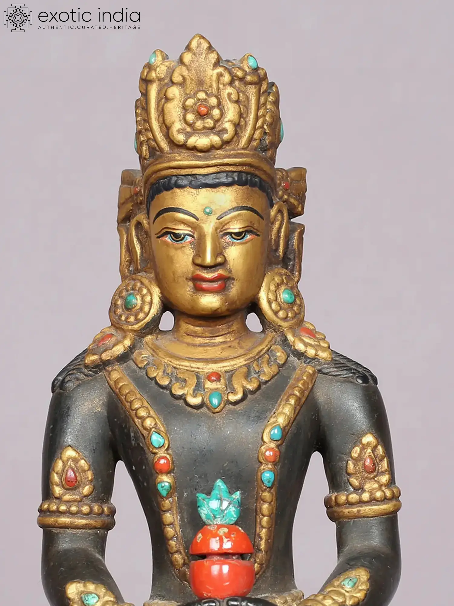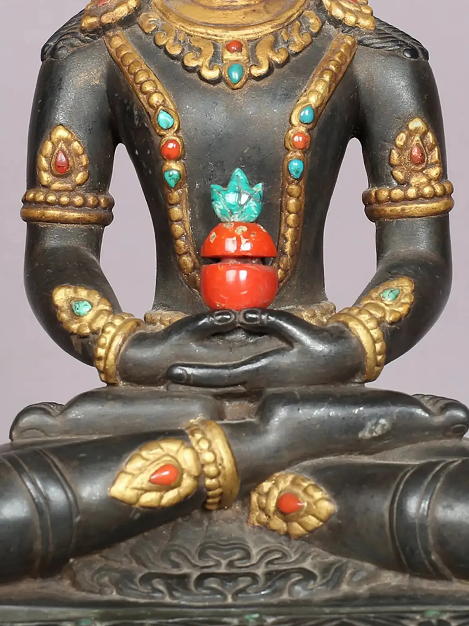 In his hands, Amitayus holds the Kalasha, a vessel brimming with the nectar of immortality. This iconic gesture symbolizes his power to grant long life, wisdom, and freedom from the cycle of birth and death. The vibrant red of the nectar pot, adorned with subtle green foliage, signifies renewal and abundance. The surrounding jewels, in shades of turquoise and coral, further enhance the sculpture's visual splendor and symbolize the myriad blessings and merits that devotees aspire to attain.