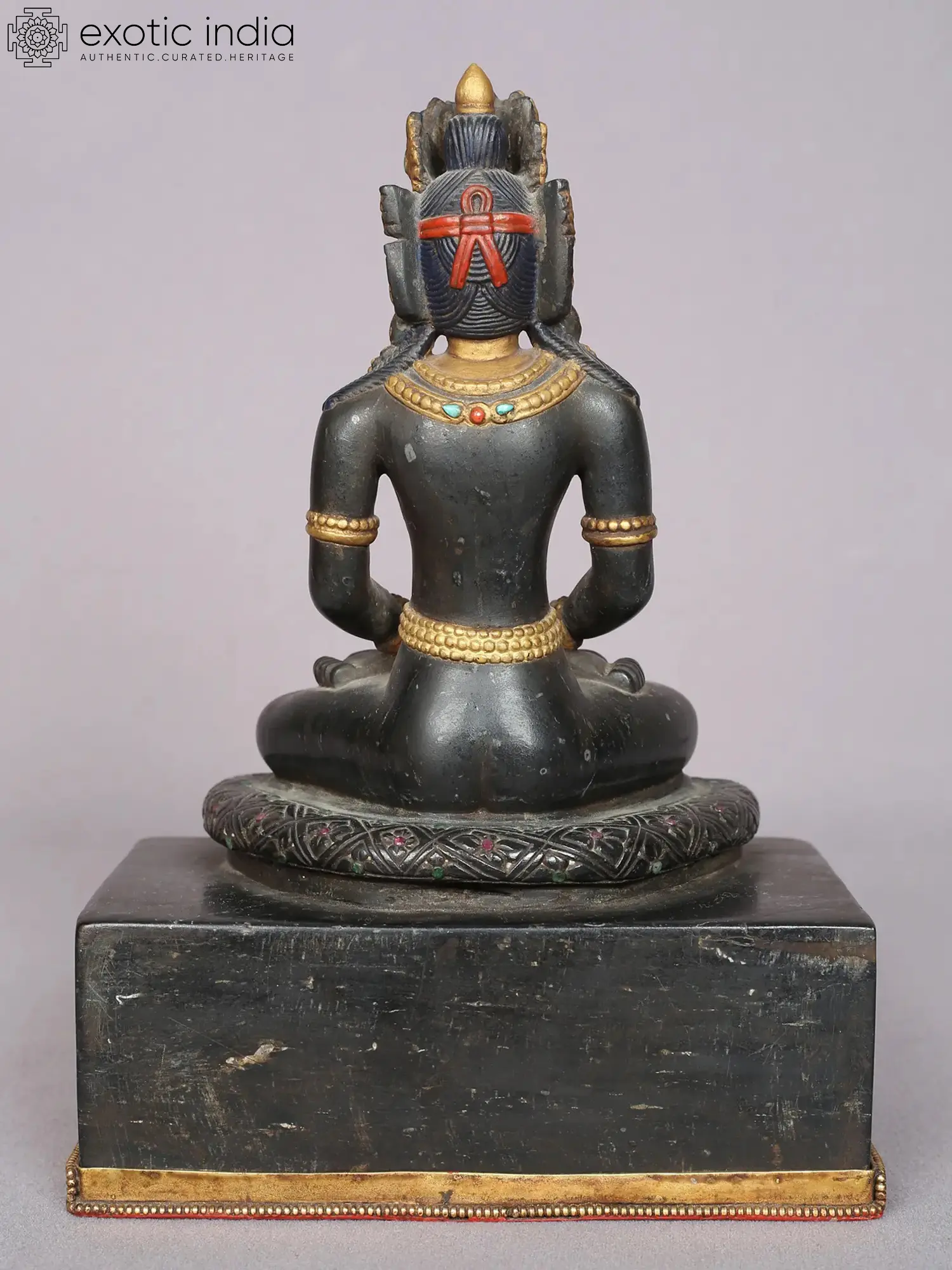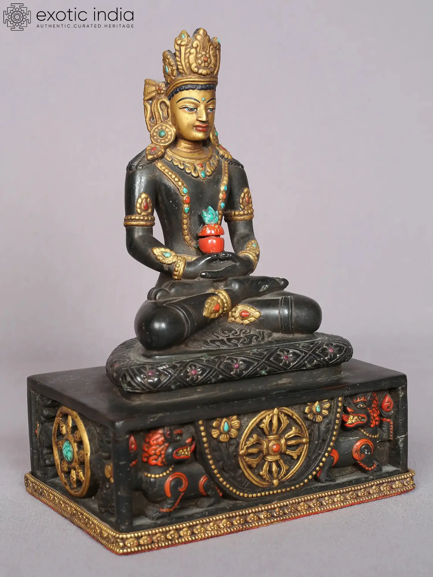 Majestic in its appearance and artistic in its technique this black stone statue from Nepal belongs to the Bodhisattva who endows us with a long and healthy life- Amitayus. The embellishment of the black stone with the gold ornaments creates a stunning visual effect on the statue, which enhances the spiritual aura of the Bodhisattva. The cuboid platform of Amitayus is a marvelous work, showing motifs such as a chakra made from Vajra and snow lions holding the throne of Amitayus.
