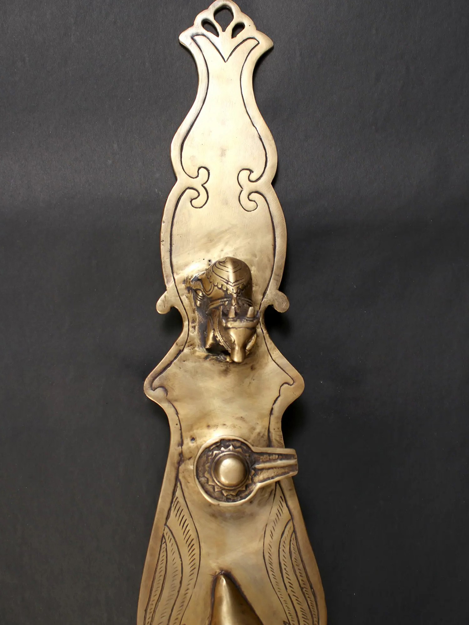 This particular uddharani is a testament to the skill of Indian artisans. The handle is intricately carved, featuring a regal countenance at the top, perhaps representing a divine being or a guardian spirit. Below this, a stylized *lingam*, the aniconic representation of Lord Shiva, is depicted with a divine orb, signifying cosmic unity. The graceful sweep of the handle continues, adorned with the imagery of mythical *hamsa* birds, symbols of purity, wisdom, and celestial grace. These birds are often associated with Saraswati, the goddess of knowledge and arts, bestowing their blessings of enlightenment upon the user.