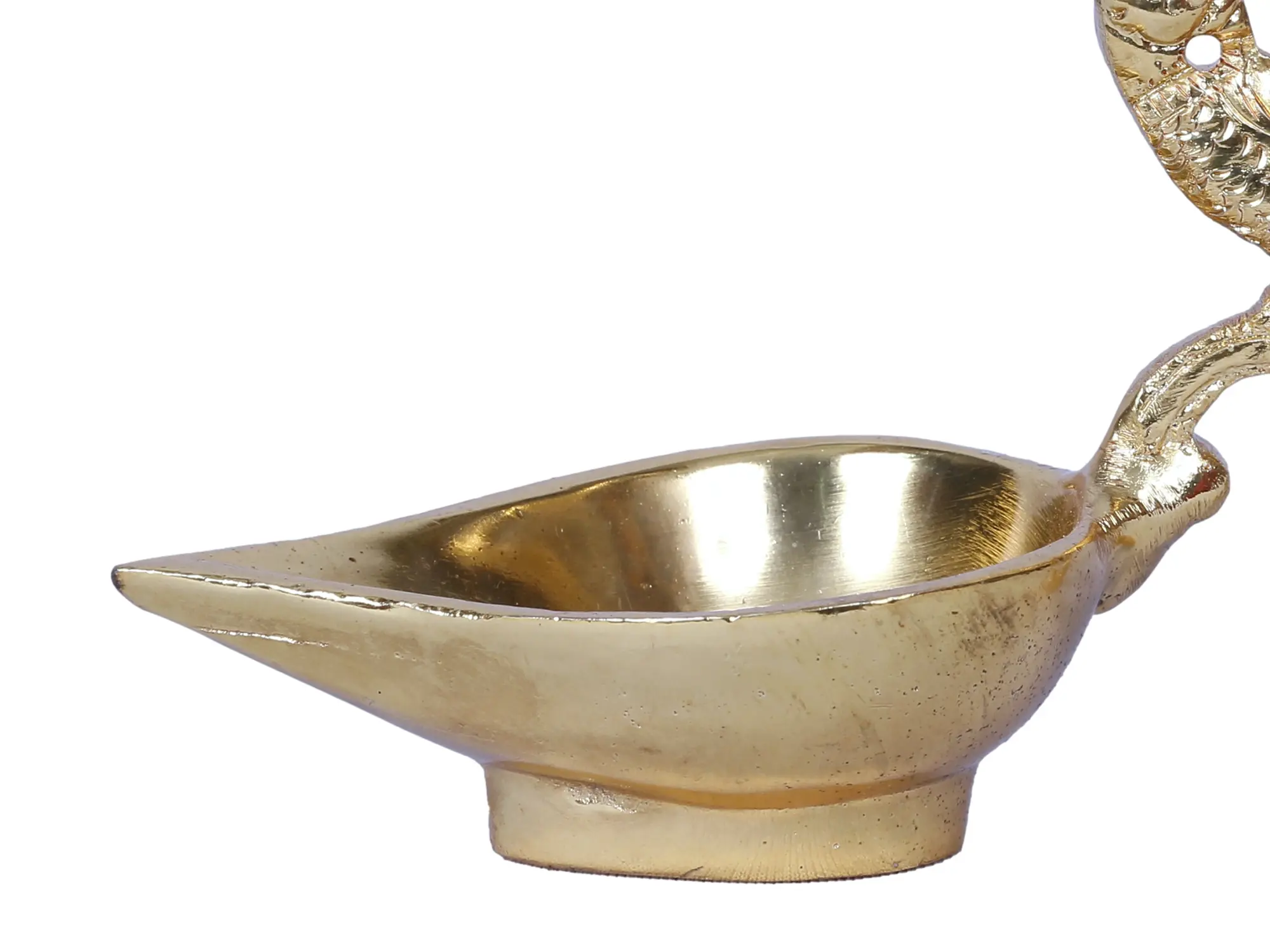 A Pidi Vilakku inspired this brass lamp with a peacock on the coiled handle. The peacock on the handle represents prosperity, while the oil basin, or Arghya Patra, which resembles a leaf, is the container that holds oil or ghee. Philosophically, the Arghya Patra is also known as the false ego. The burning candle represents the light, which consumes the ego and provides wisdom. As a result, these lamps are viewed as intelligence conduits.