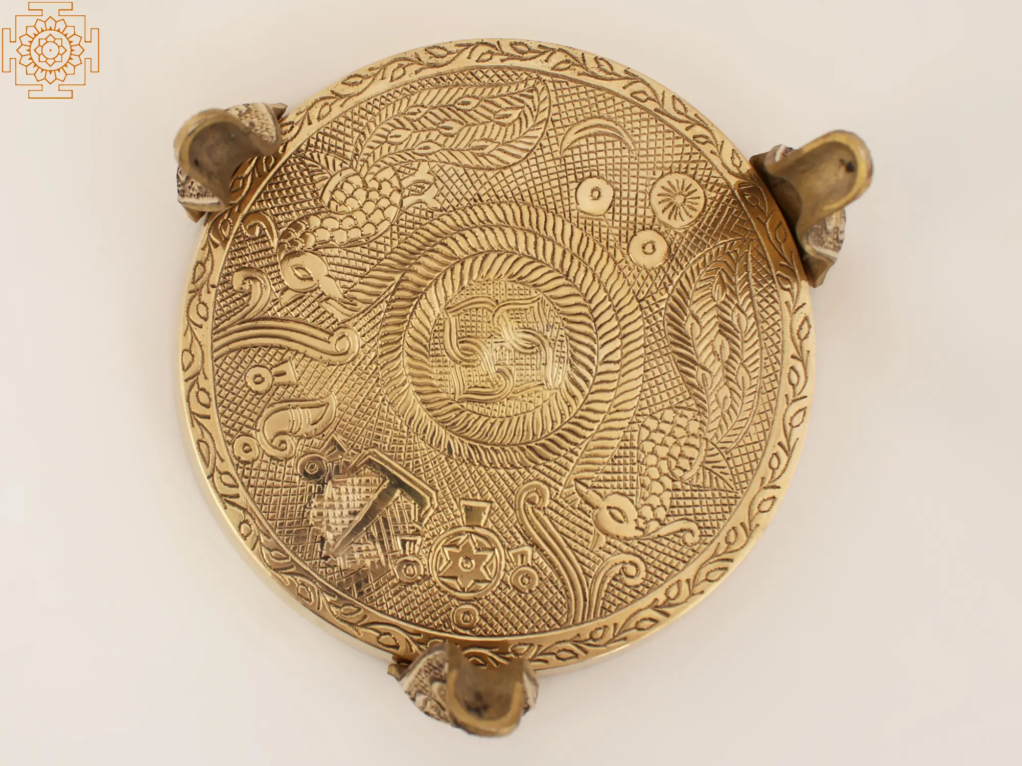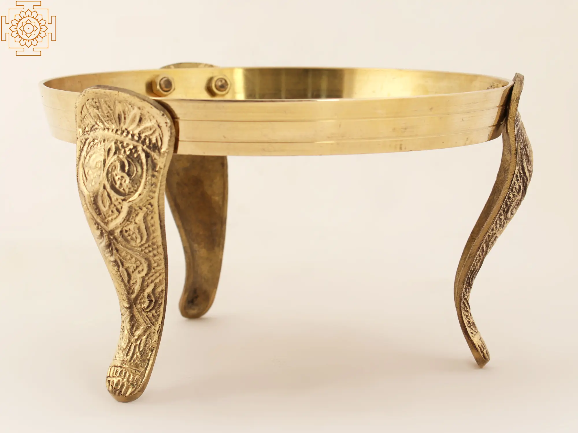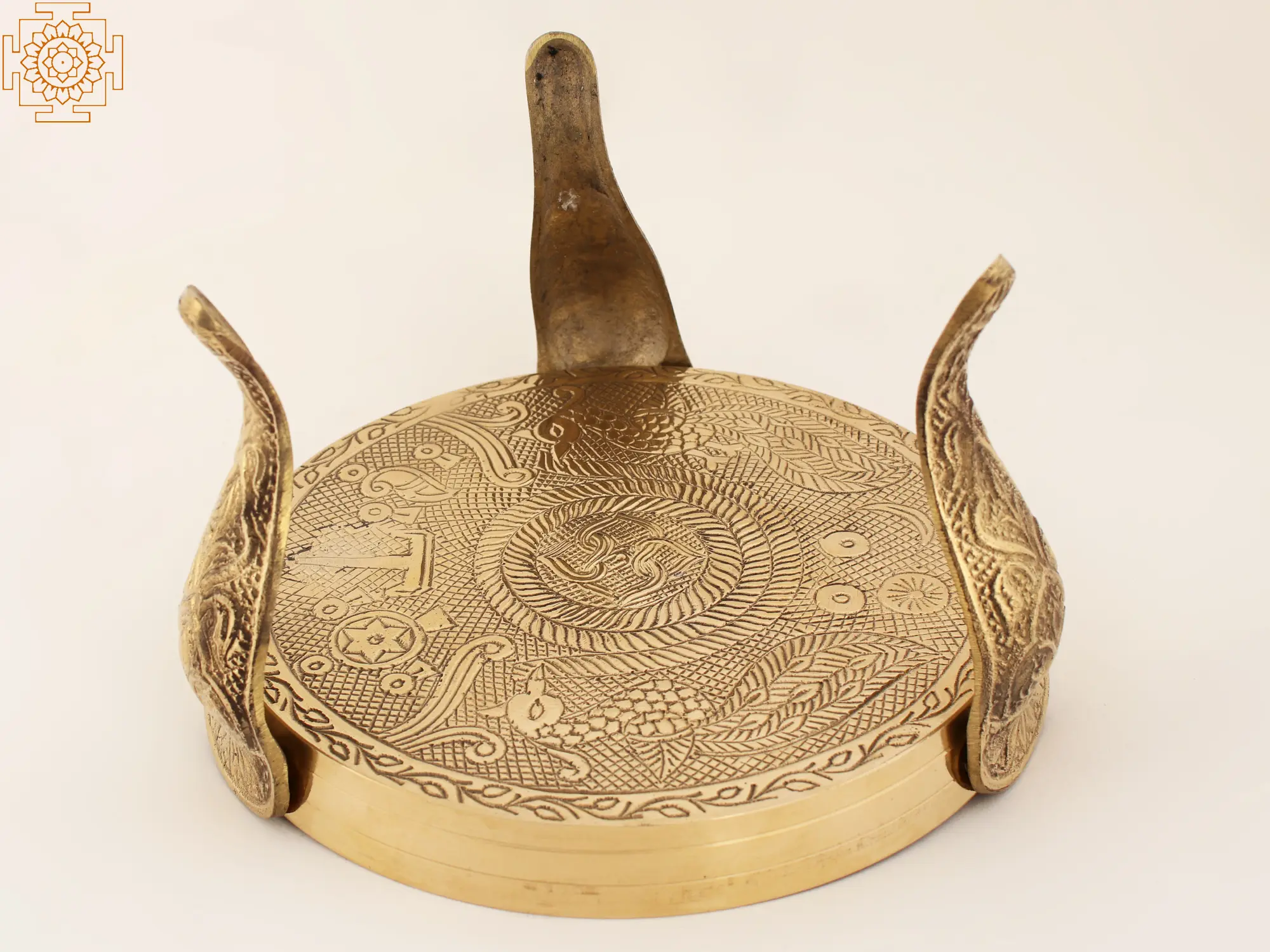 This one-of-a-kind Pooja stand is a fantastic ceremonial item that may also be used to hold a Big Pooja Thali. This wonderful sculpture, created to contain a heavy ceremonial object, lies quietly at the intersection of beauty and usefulness. It is made up of three stands and a circular thali. The stands are also ornamented with Bael designs, which are coiled vines. Three tiger paw-shaped legs support the stand. On the bottom of the plate, sacred symbols of Urdhva Pundra, Shankha, and Chakra are carved. This well-crafted Pooja stand also serves as a decorative accent.