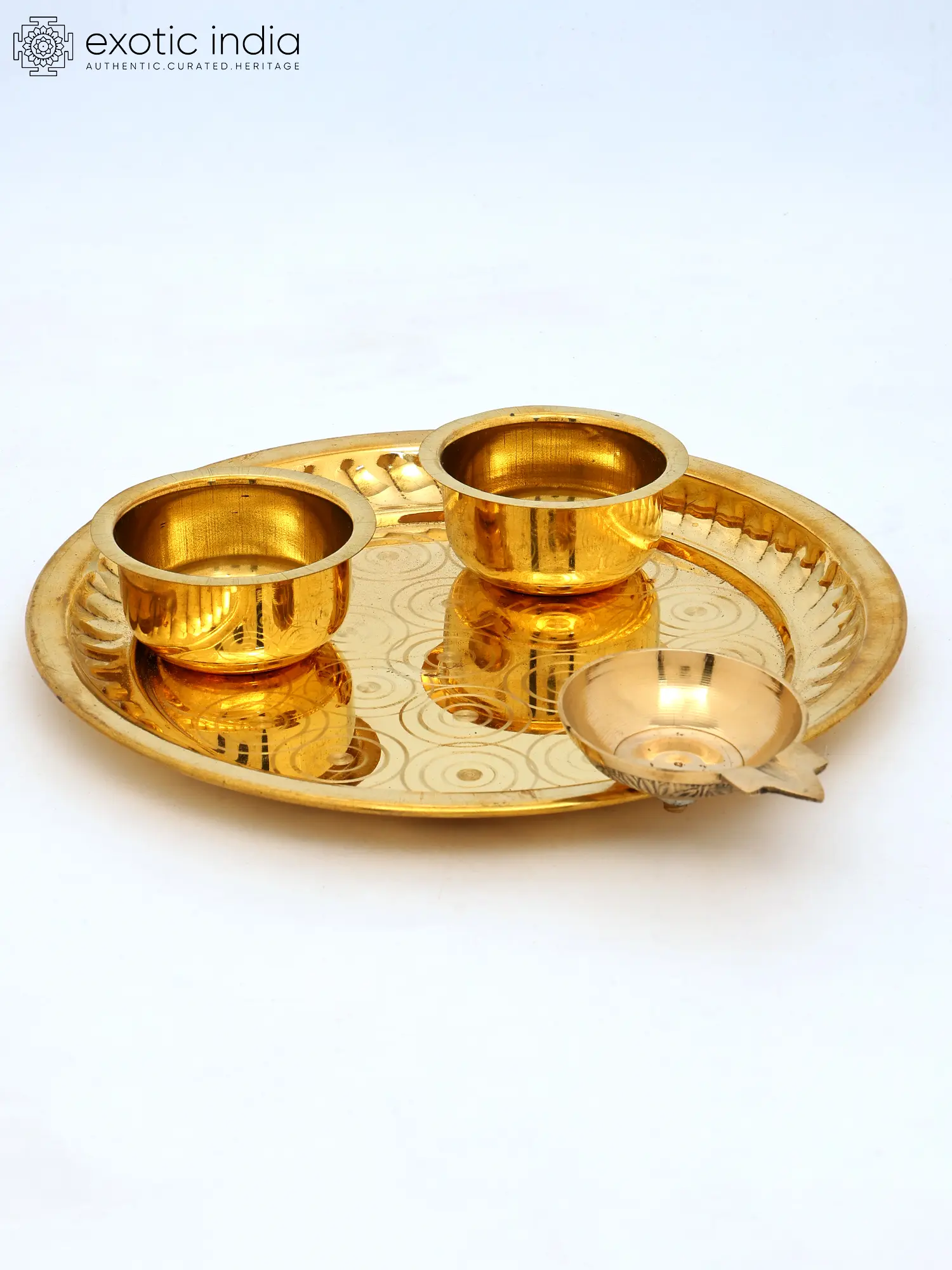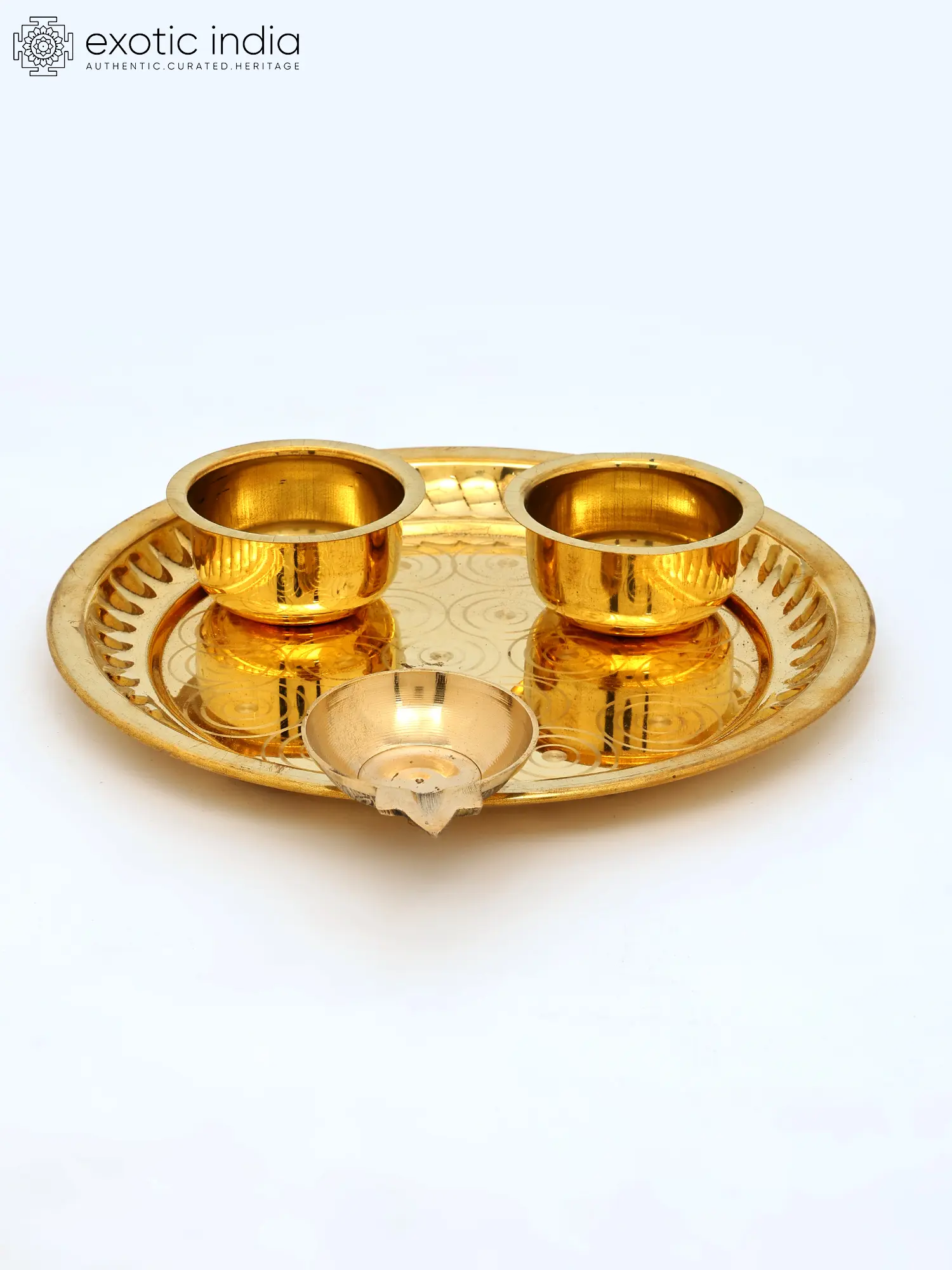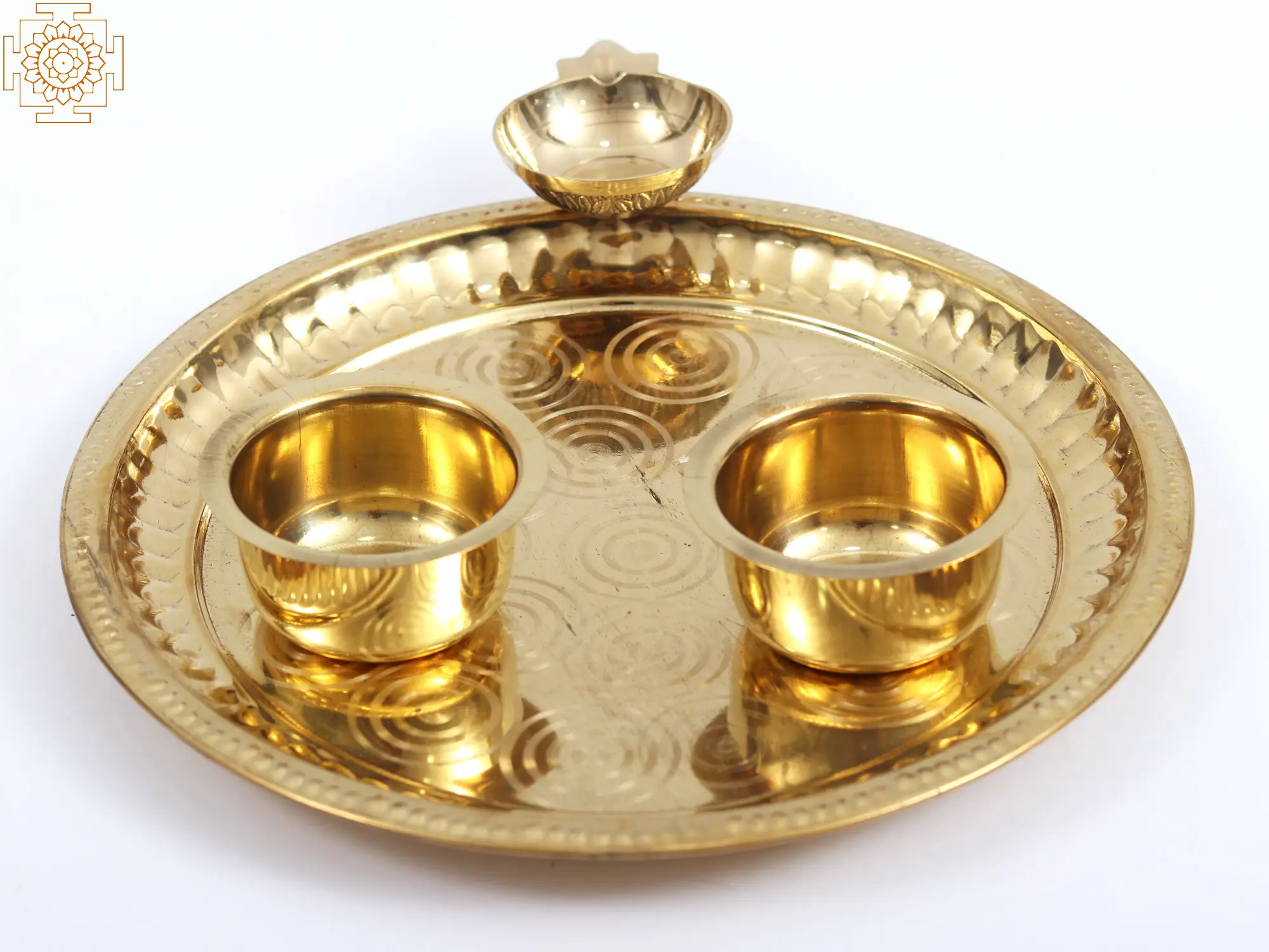 This Puja set comes with a Thaali (plate), two water holders and a beautiful Diya in the centre, the perfect combination for your daily Puja needs. Crafted with pure brass, this Thali set brings purity and sacredness in your ritual experience.