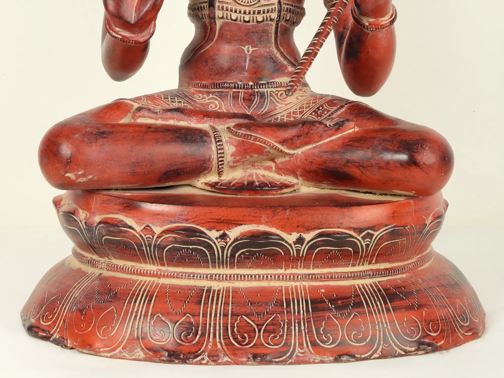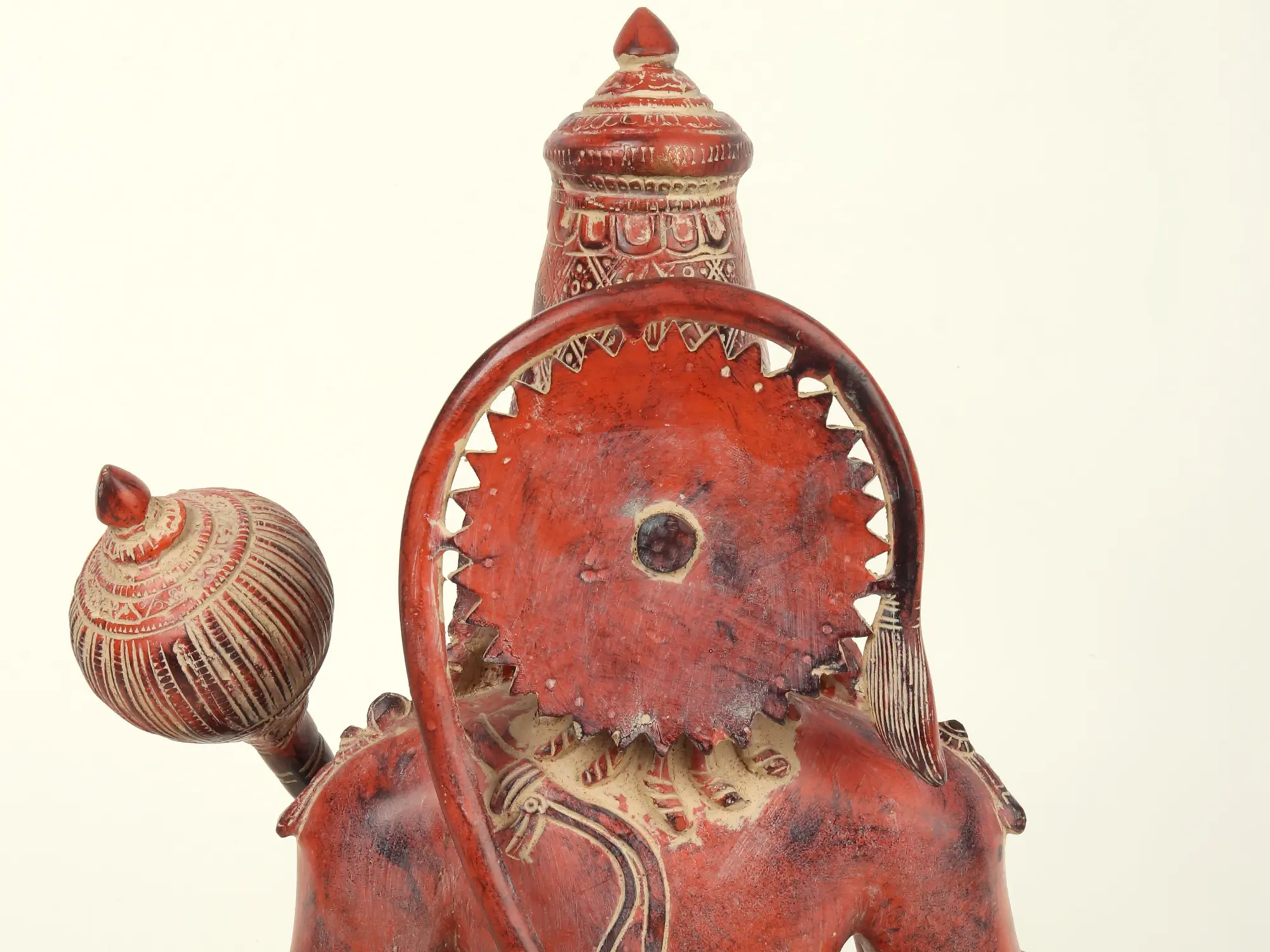 In the enchanting tableau of divinity, Lord Hanuman, “also known as Daityakulunta”, graces the world from his lotus pedestal, seated in tranquil “Padmasana”. His radiant presence exudes a profound sense of benevolence. His right hand is poised in “Ashirwad Mudra”, a gesture of boundless blessings. His mighty Mace (Gada) rests in his left hand, symbolising strength and protection. Adorned in regal attire, the “Karanda Mukut” adorns his divine brow, while Necklaces, Kundals (earrings), Armbands, and Bracelets embellish his sacred form. This artwork, crafted in brass, signifies Lord Hanuman’s dual nature, embodying both strength and compassion, offering his benevolent blessings to all who seek his divine refuge.