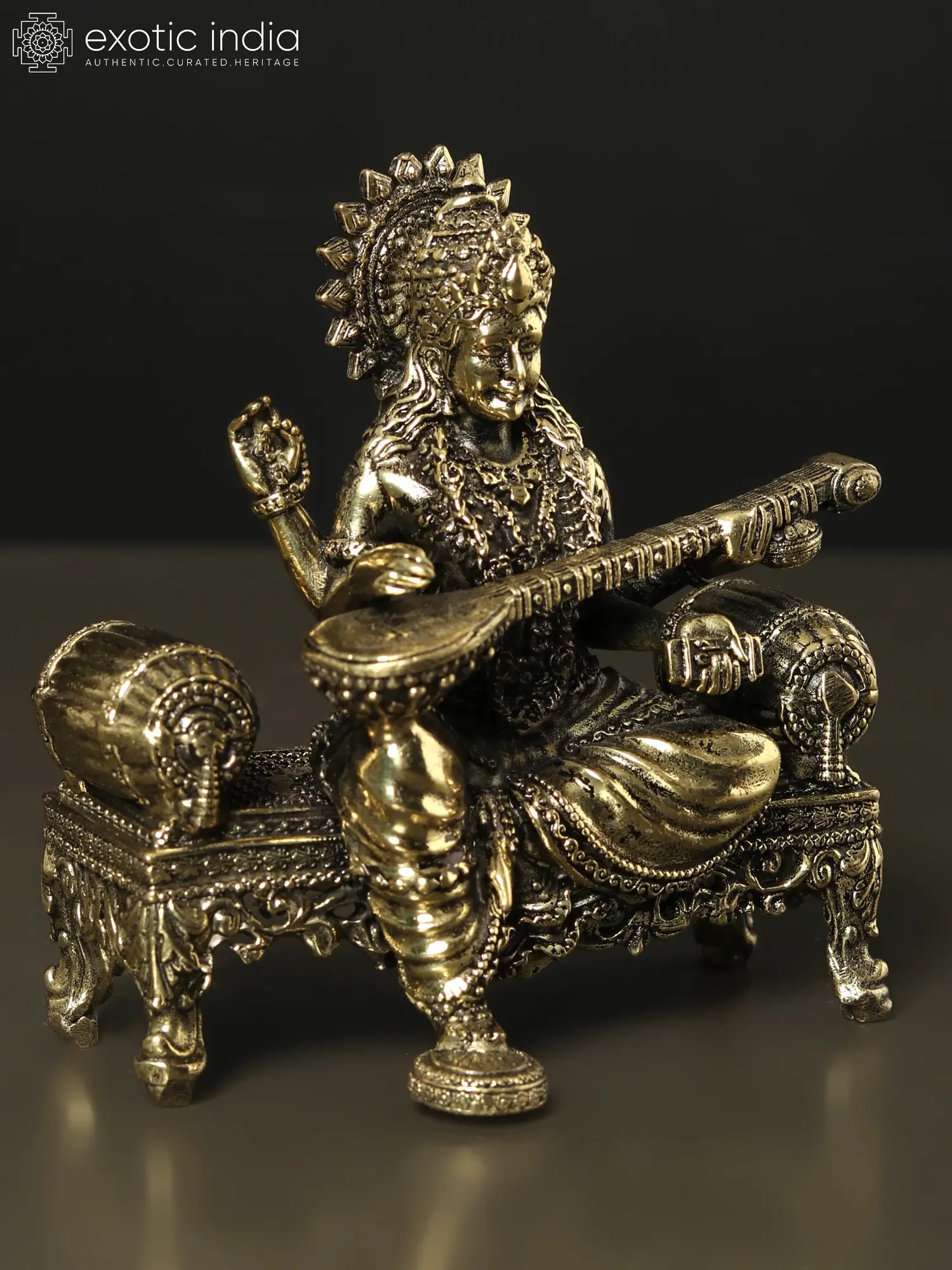 Goddess Saraswati, “the possessor of knowledge”, in regal attire, graces her singhasan with divine presence. With grace and elegance, She strums the Veena, her melody weaving the threads of knowledge and creativity. In her upper hand, she holds a rosary, guiding the seekers towards wisdom. The sacred Vedas rest in her left hand, symbolising her role as the patroness of wisdom and learning. This artwork, crafted in brass, captures her serene beauty, inspiring reverence. Worshipping Goddess Saraswati bestows the gift of knowledge, creativity, and eloquence. She empowers minds, nurturing intellects to bloom like the lotus that she adorns, embodying the transcendence of wisdom and the arts.