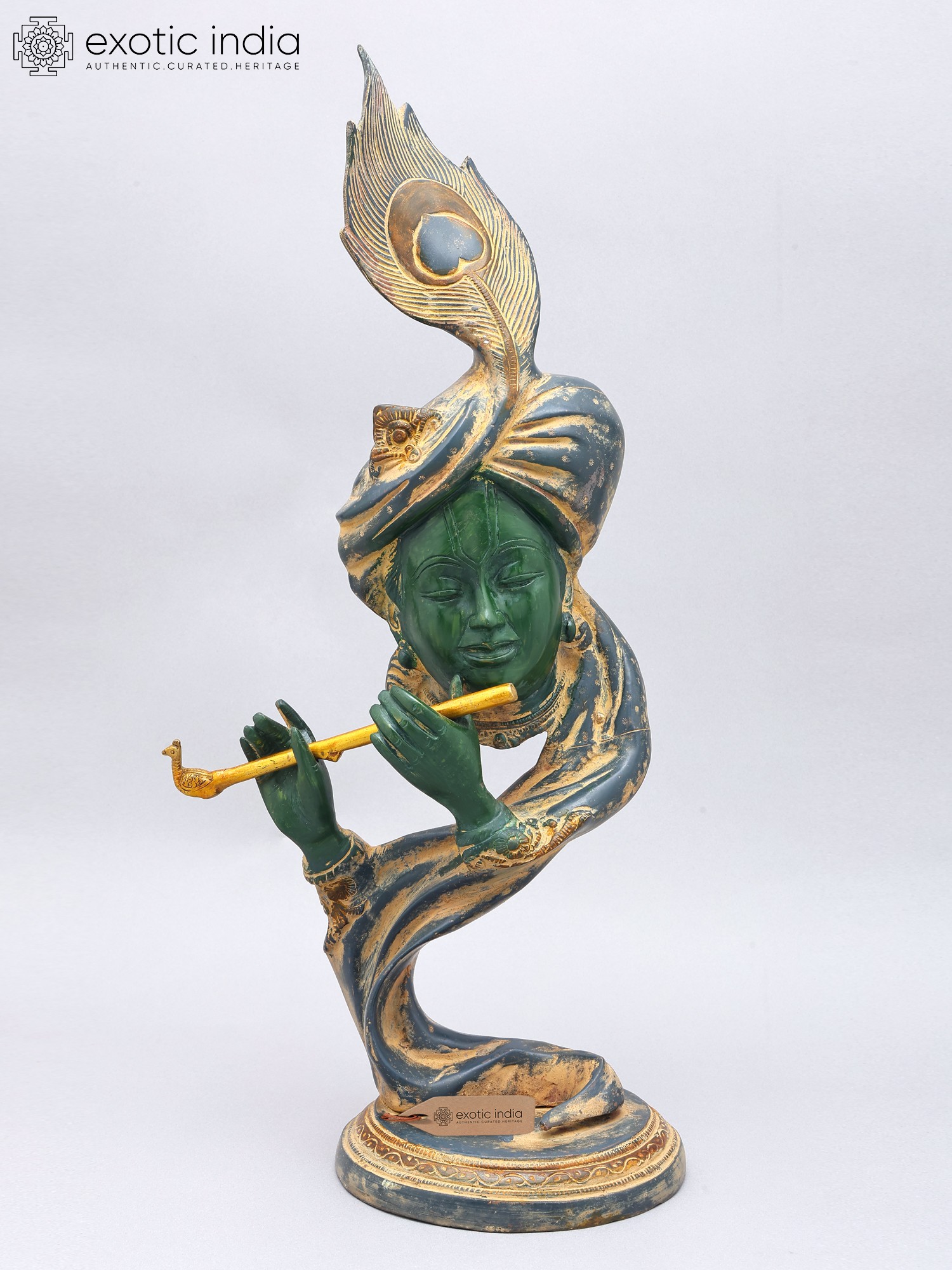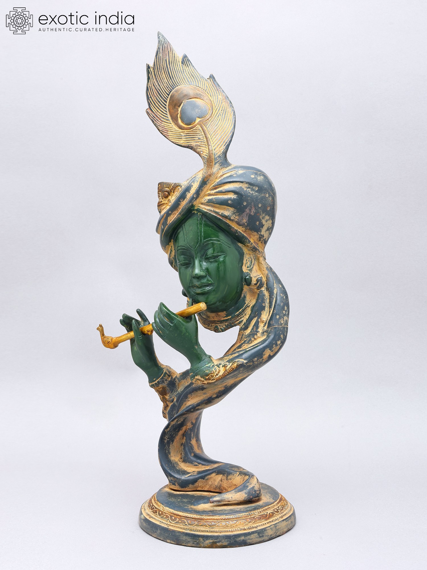 Features a stylized representation of Lord Krishna, the divine flutist.