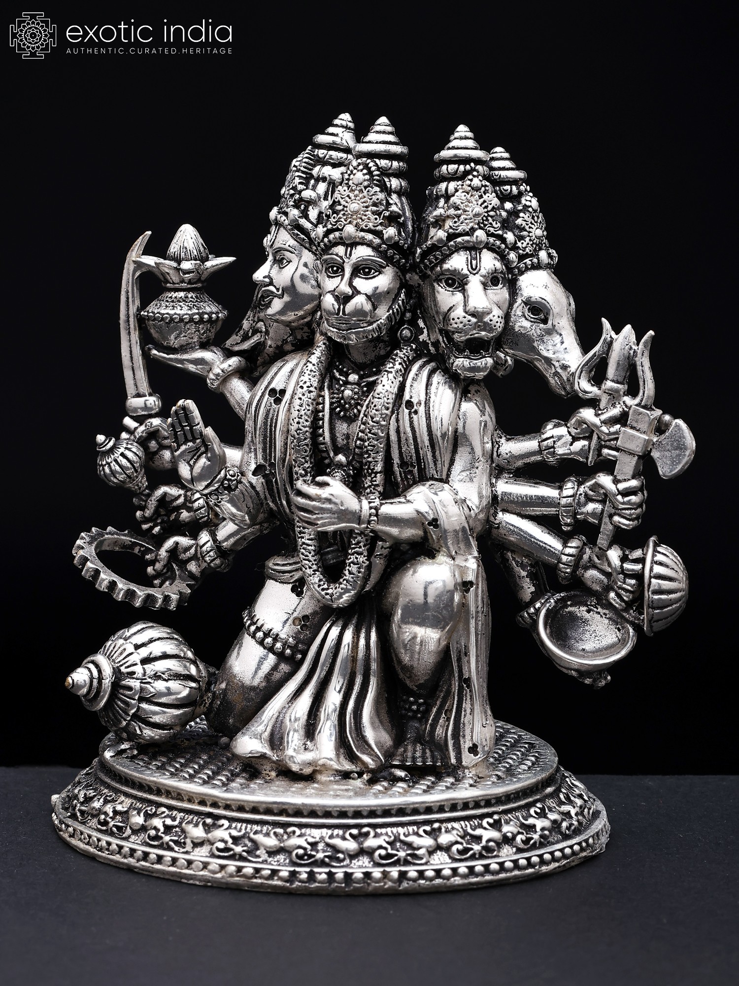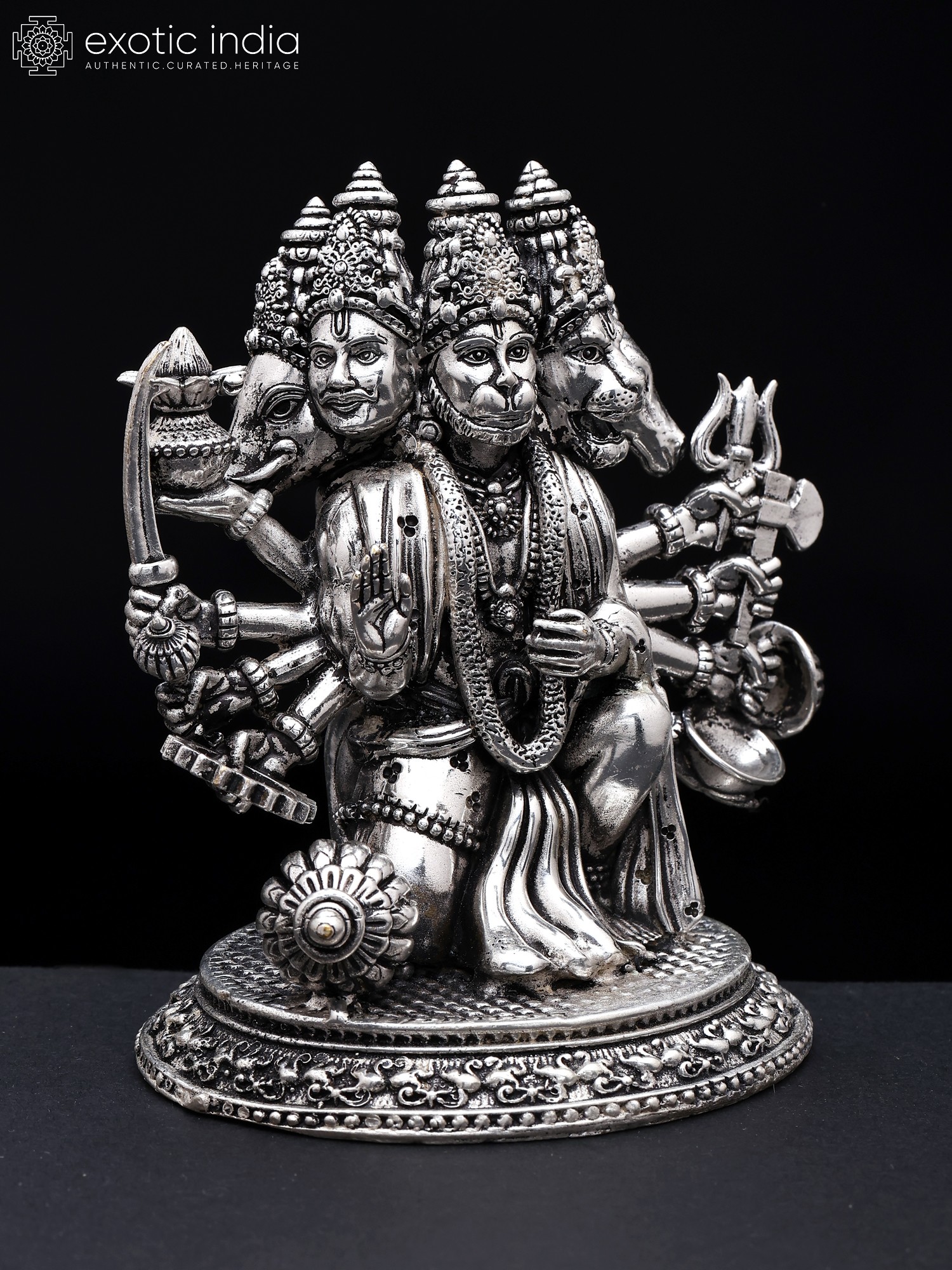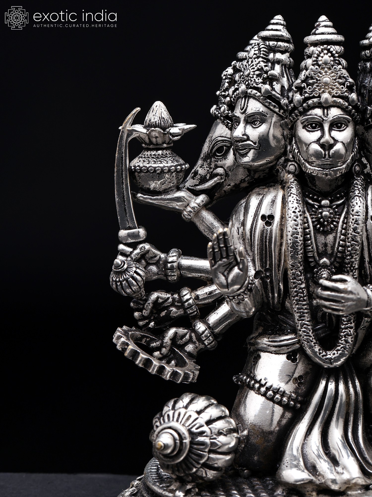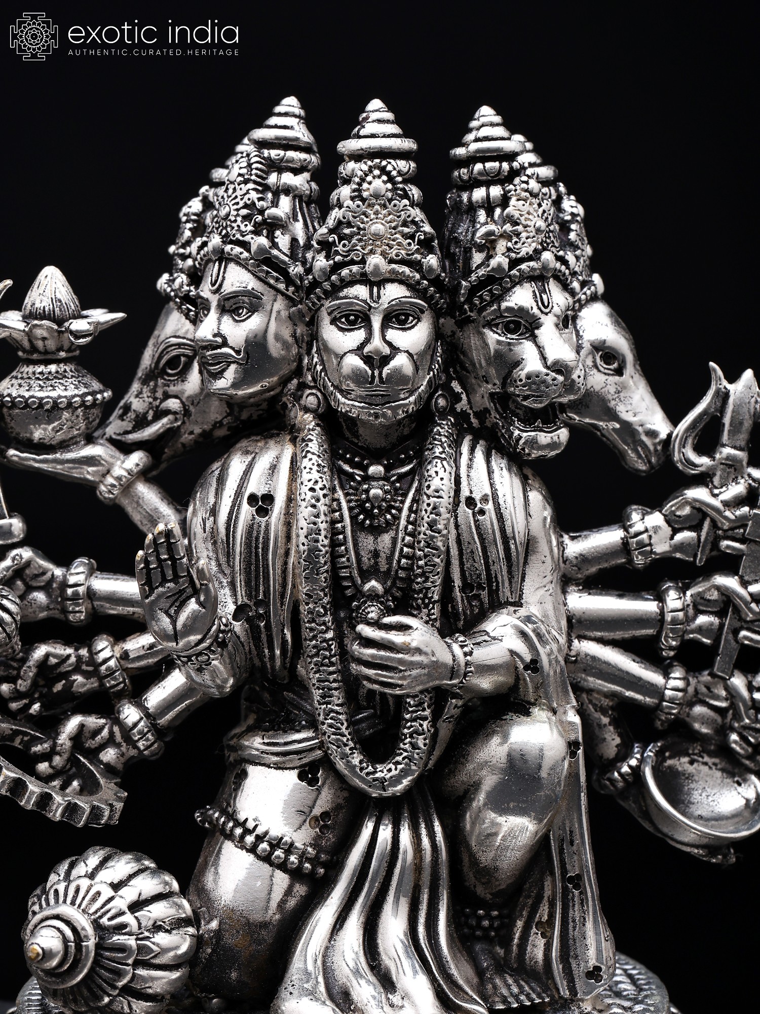 Instilling faith in the devotee, Hanuman sits in a warrior's position and looks forward with alertness. Each of his four exquisitely detailed heads is teeming with divine vitality.
