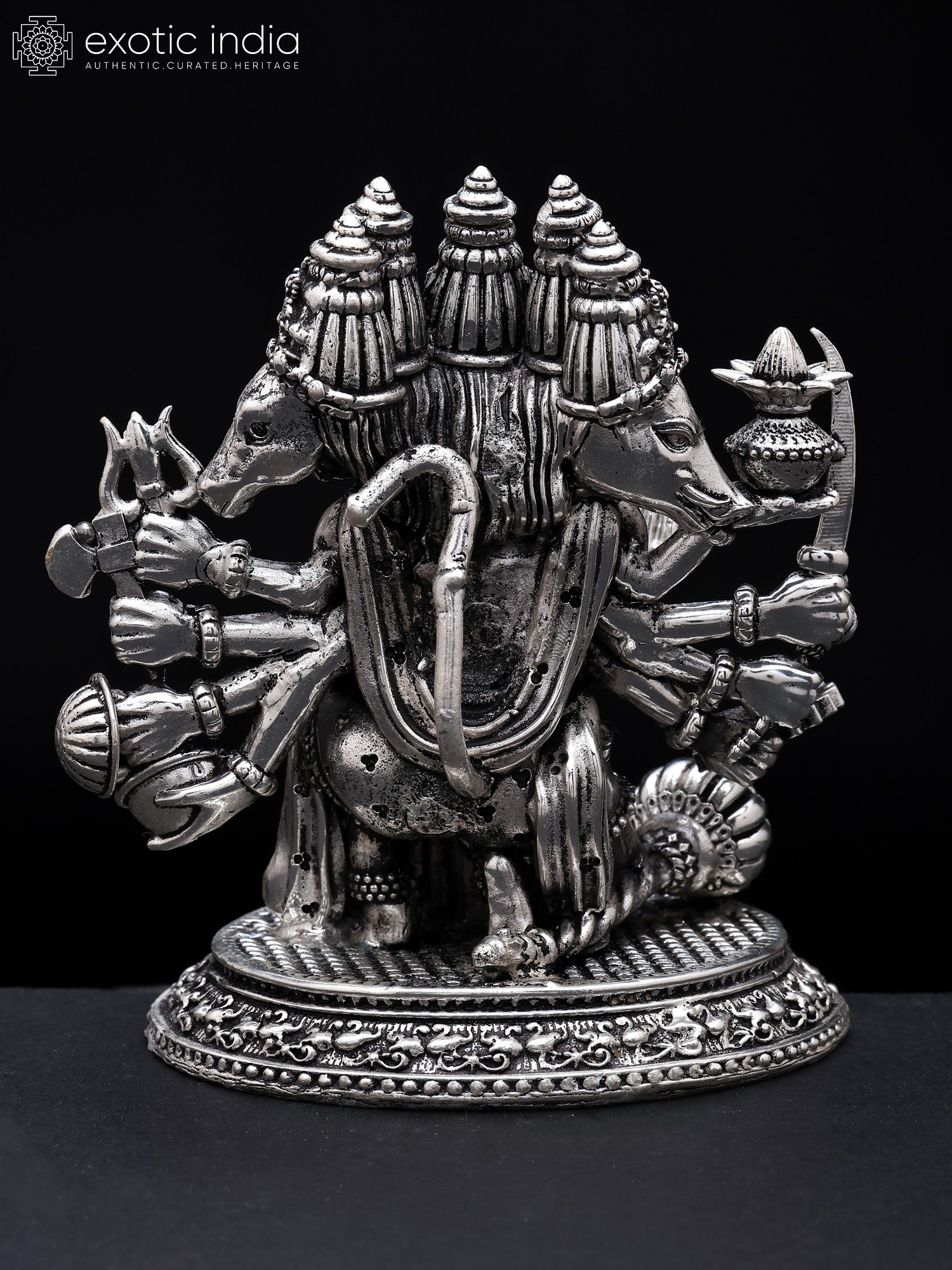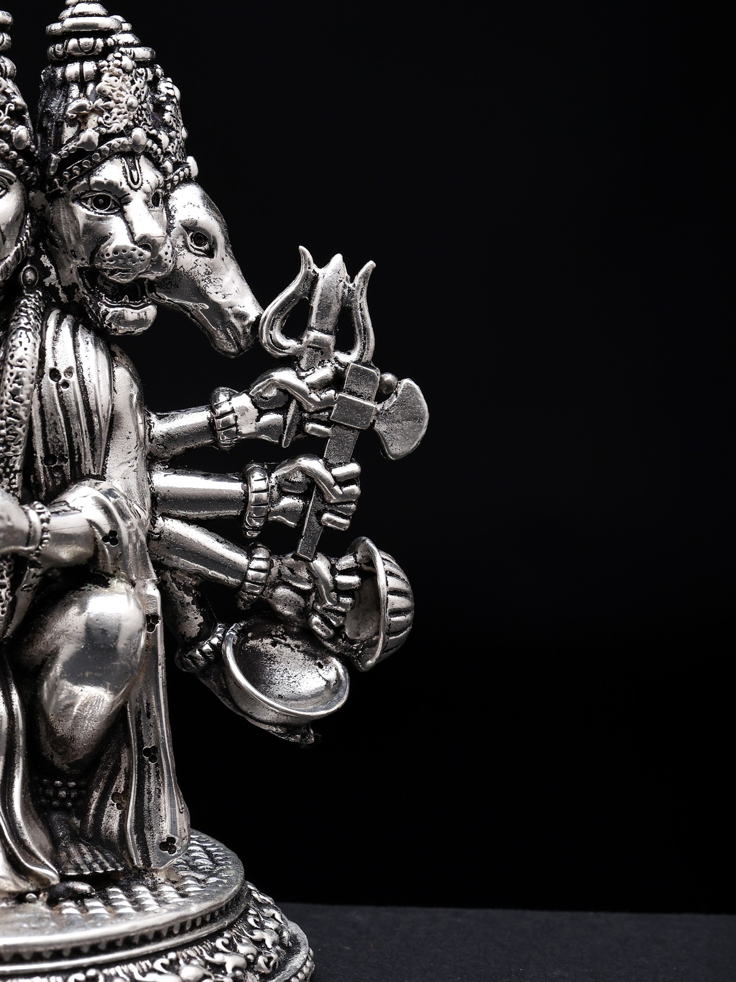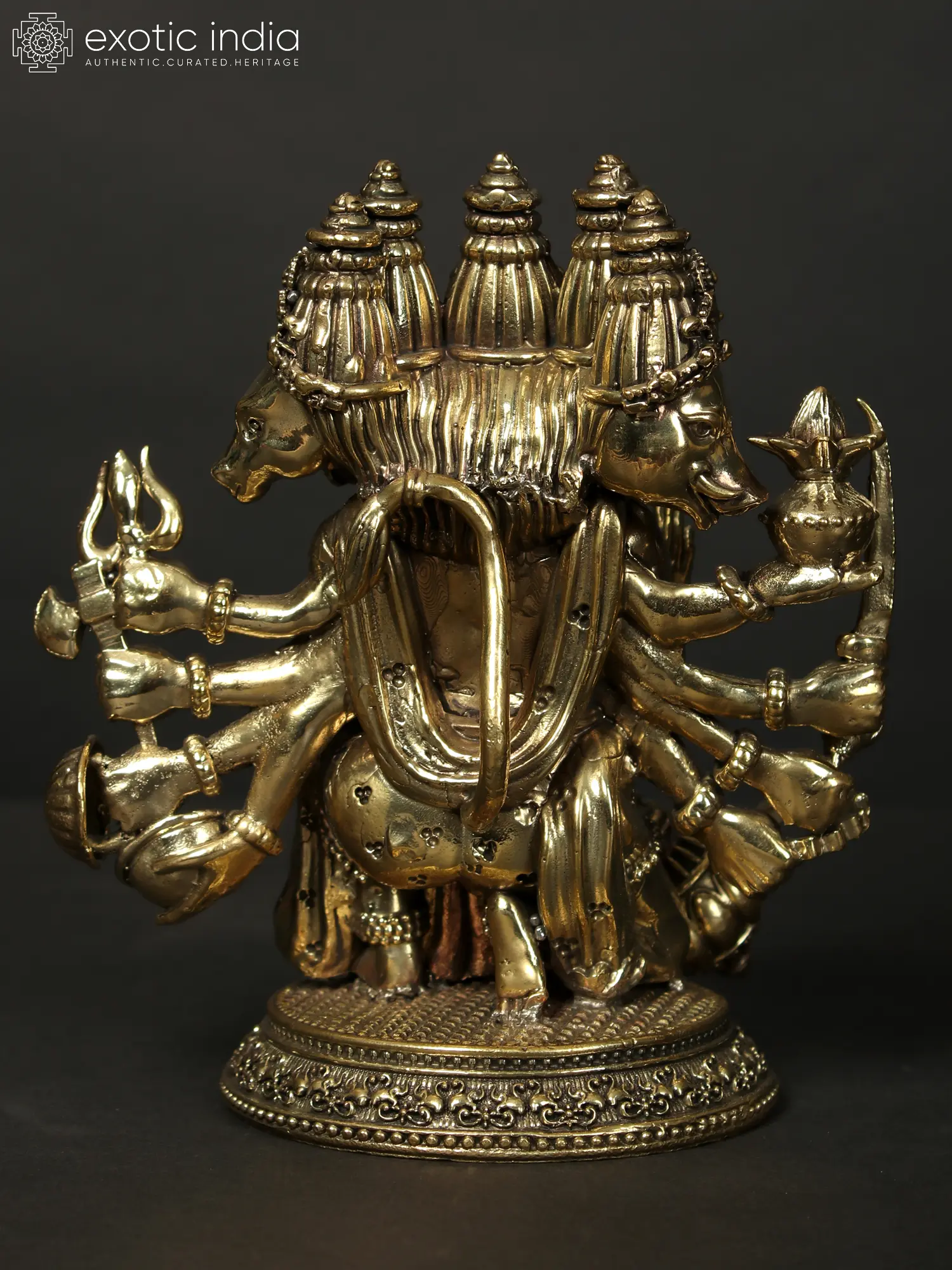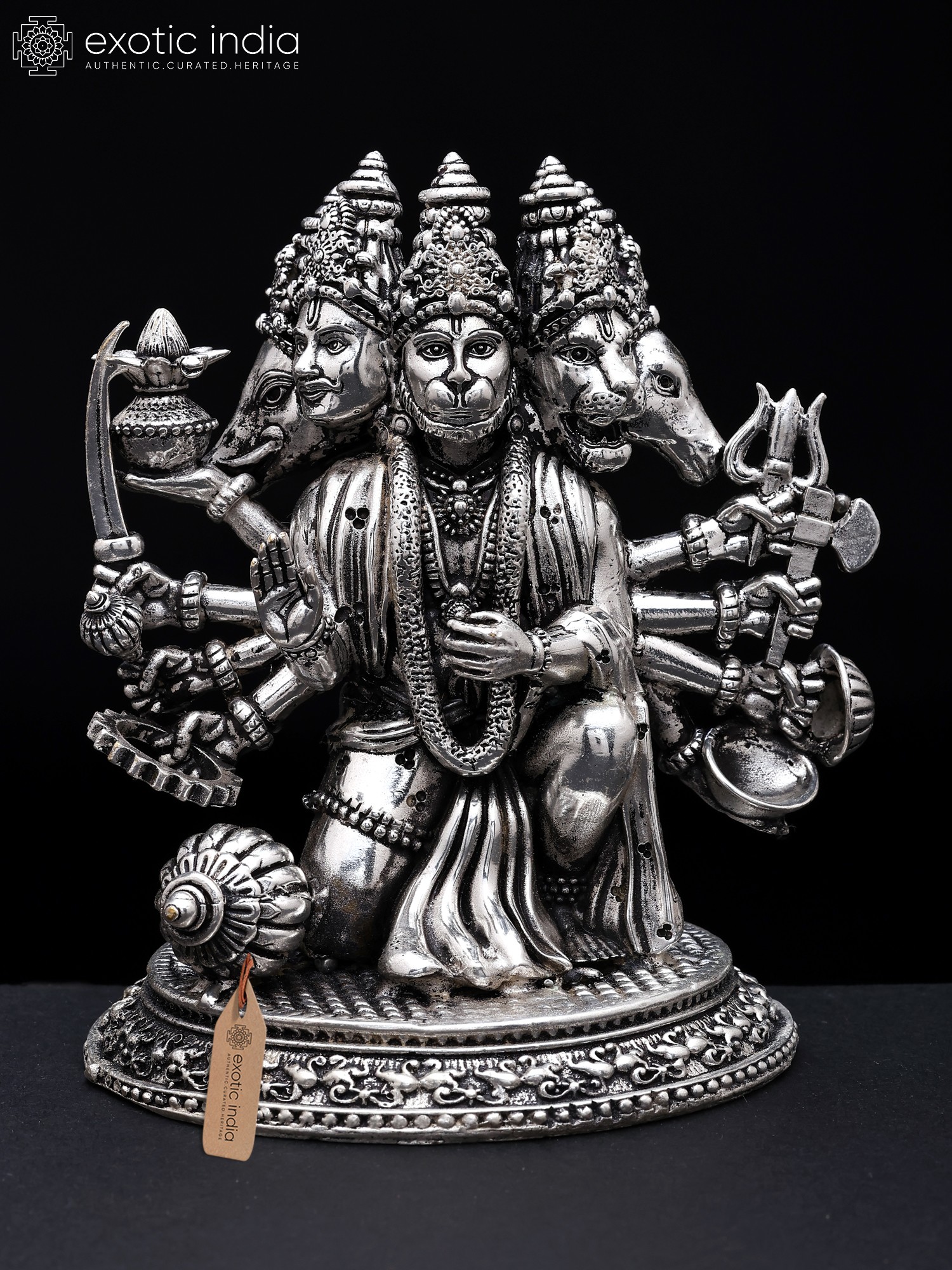 Instilling faith in the devotee, Hanuman sits in a warrior's position and looks forward with alertness. Each of his four exquisitely detailed heads is teeming with divine vitality.