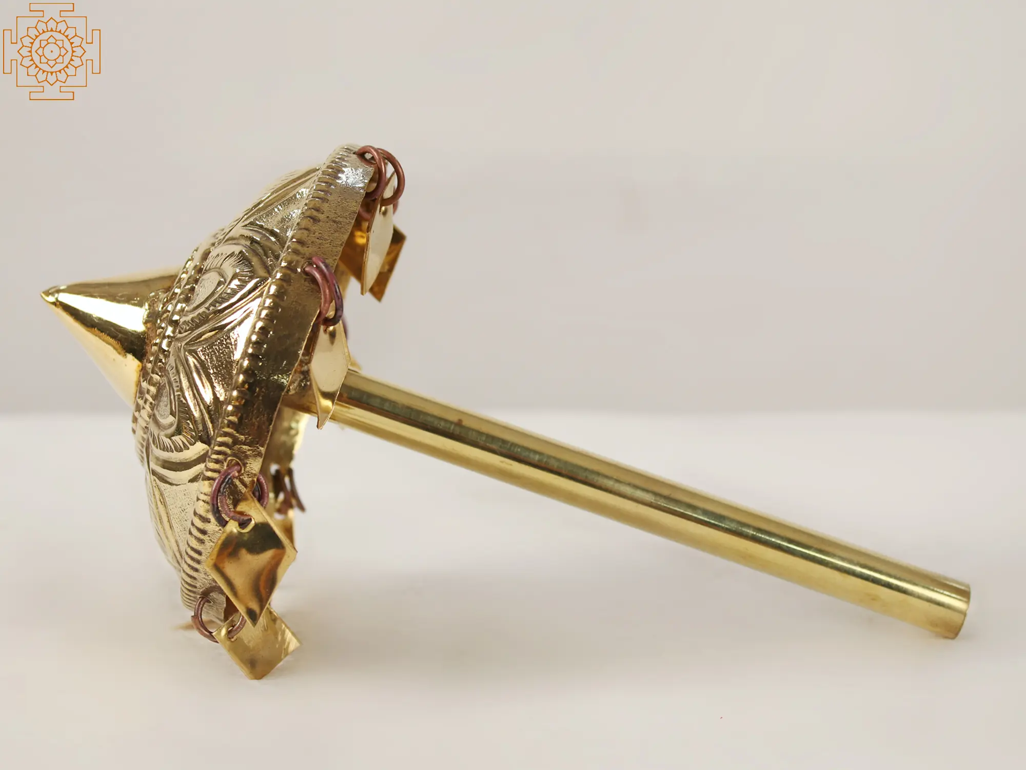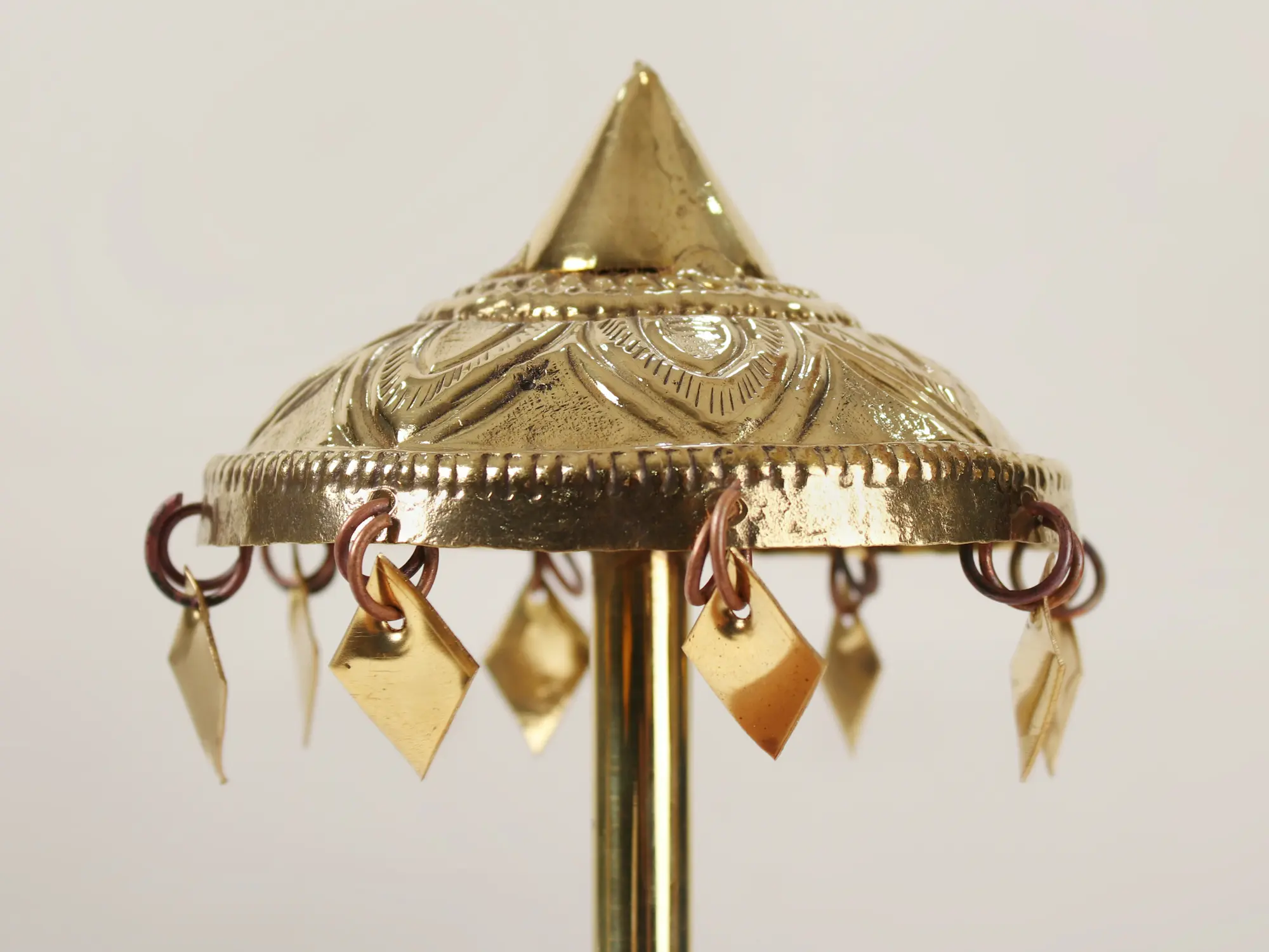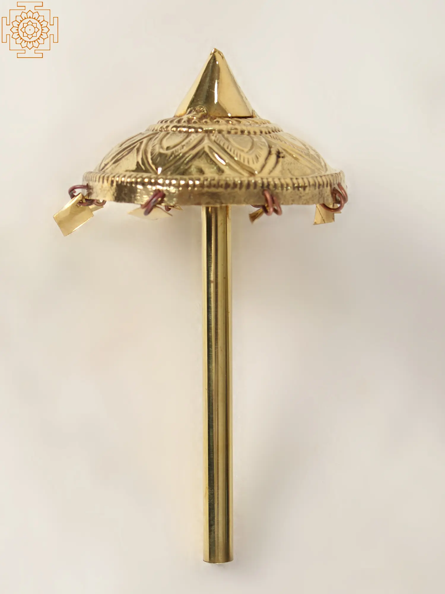 This small brass umbrella holds deep religious significance in Hindu culture. It symbolizes protection, auspiciousness, and devotion. When used in religious rituals or during deity processions, it signifies the divine sheltering presence, shielding devotees from adversity. The umbrella's presence invokes blessings and sanctity, enhancing the spiritual ambiance. It serves as a visual reminder of reverence and devotion to the divine, reinforcing the connection between worshippers and their gods, and fostering a sense of spiritual well-being.