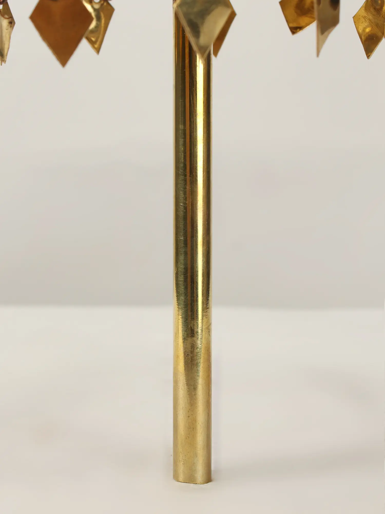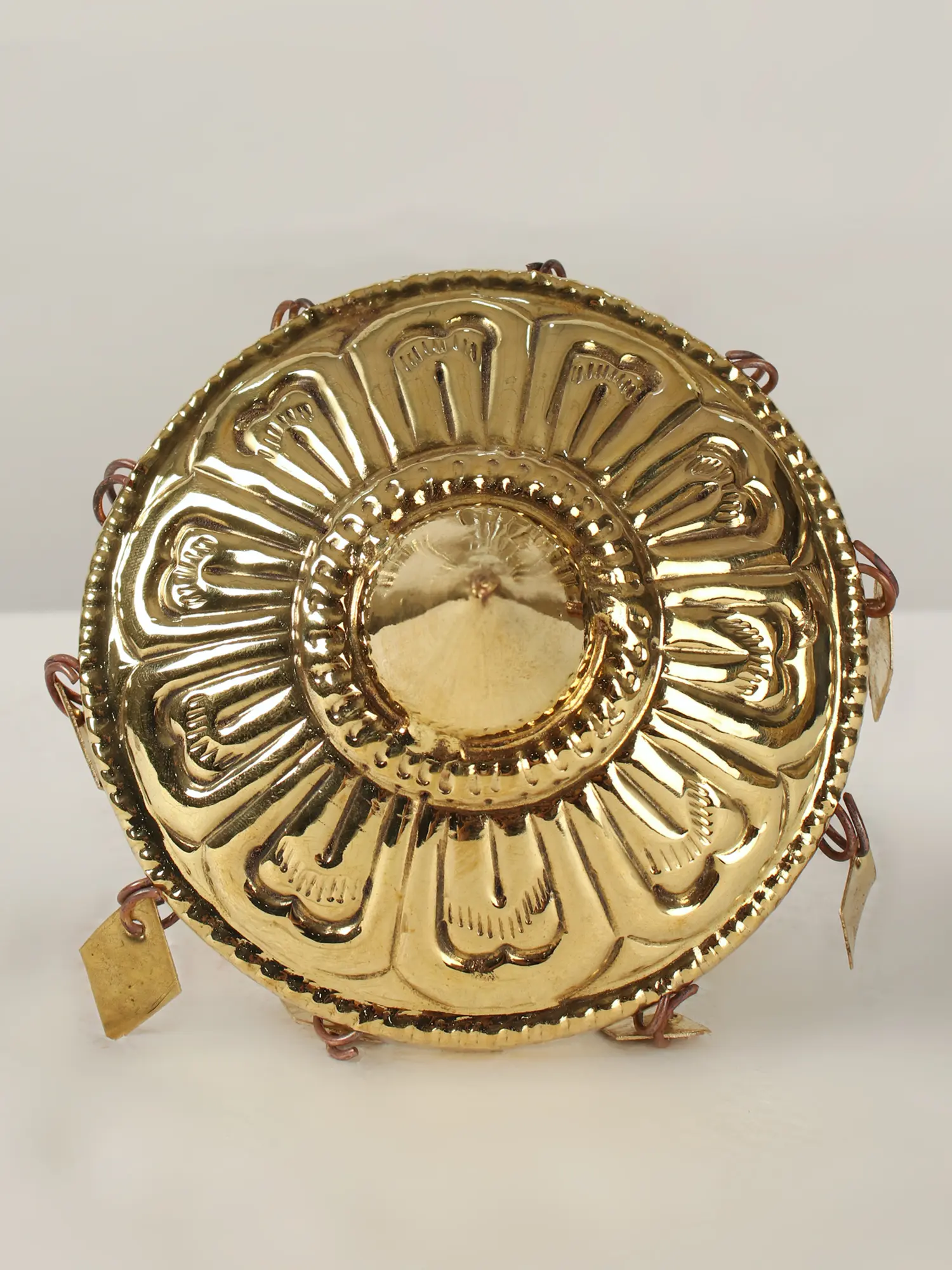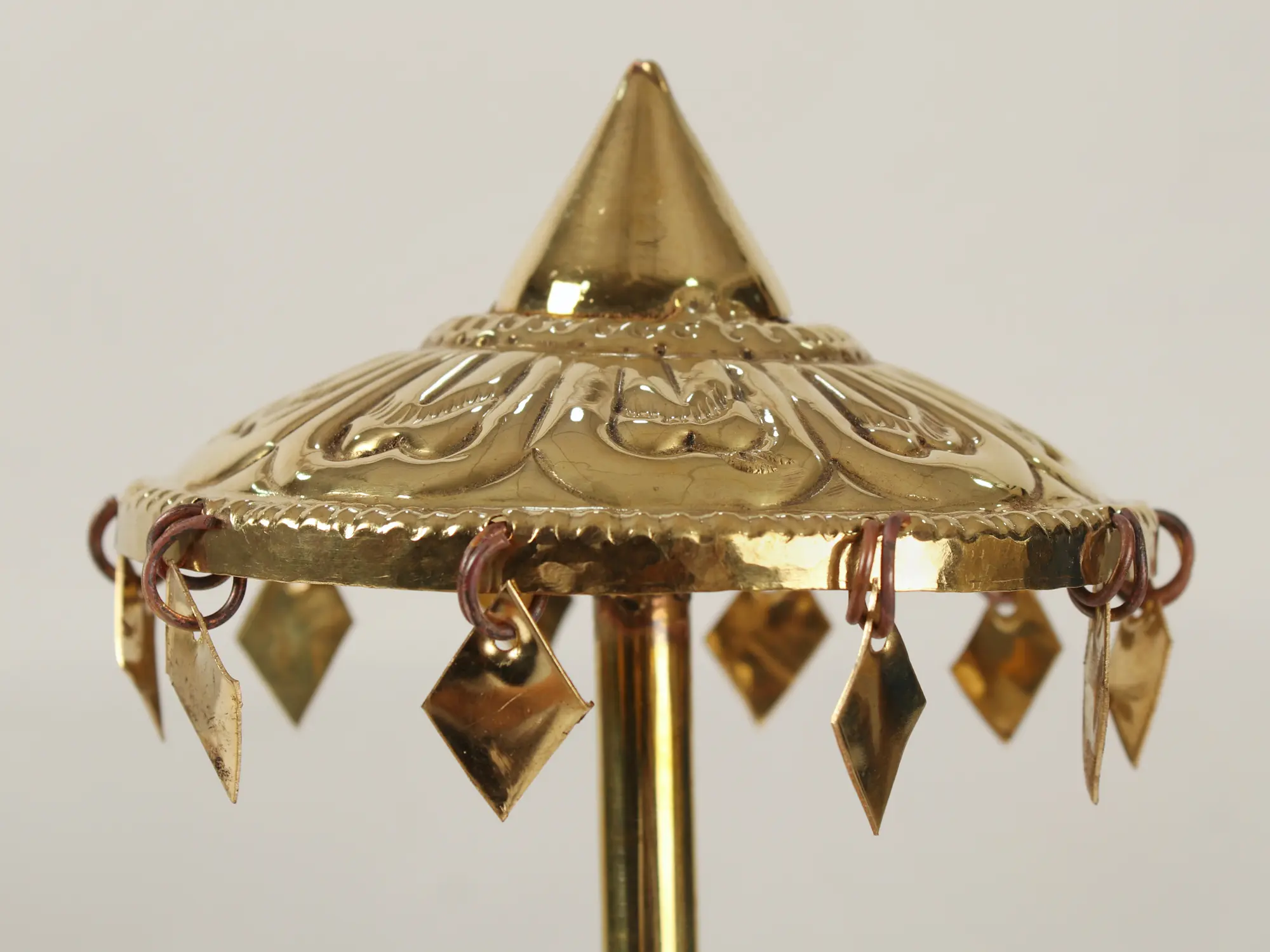 This small brass umbrella for deities is a religious artifact adorned with intricate flower petal carvings on its body, featuring a Kalash atop and a small handle. Small square brass confetti are attached to its corners, enhancing its ornate design. This umbrella is used in Hindu rituals, particularly during deity processions or temple ceremonies, to symbolize protection, auspiciousness, and devotion. It is an integral part of religious traditions, invoking blessings and sanctity during worship and religious festivities.