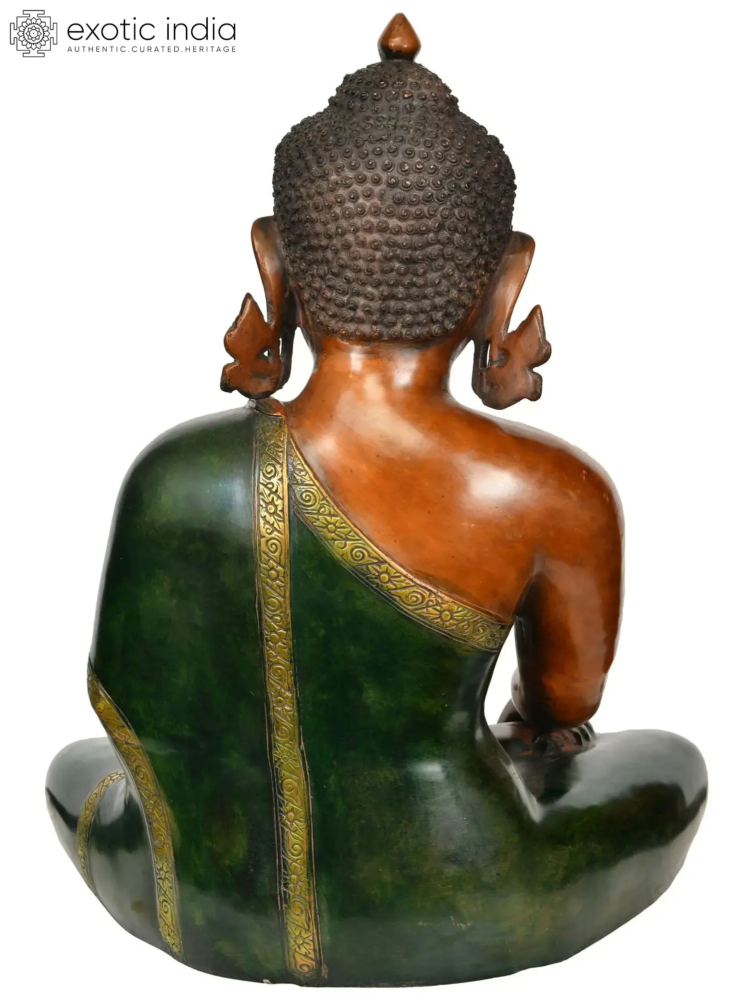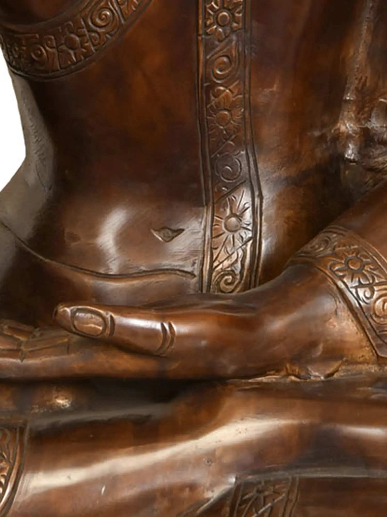 This superb example of Buddhist metal casting shows the Buddha in his most typical pose, seated in meditation, one hand in his lap, the other pointing towards the earth (Bhumisparsha Mudra).