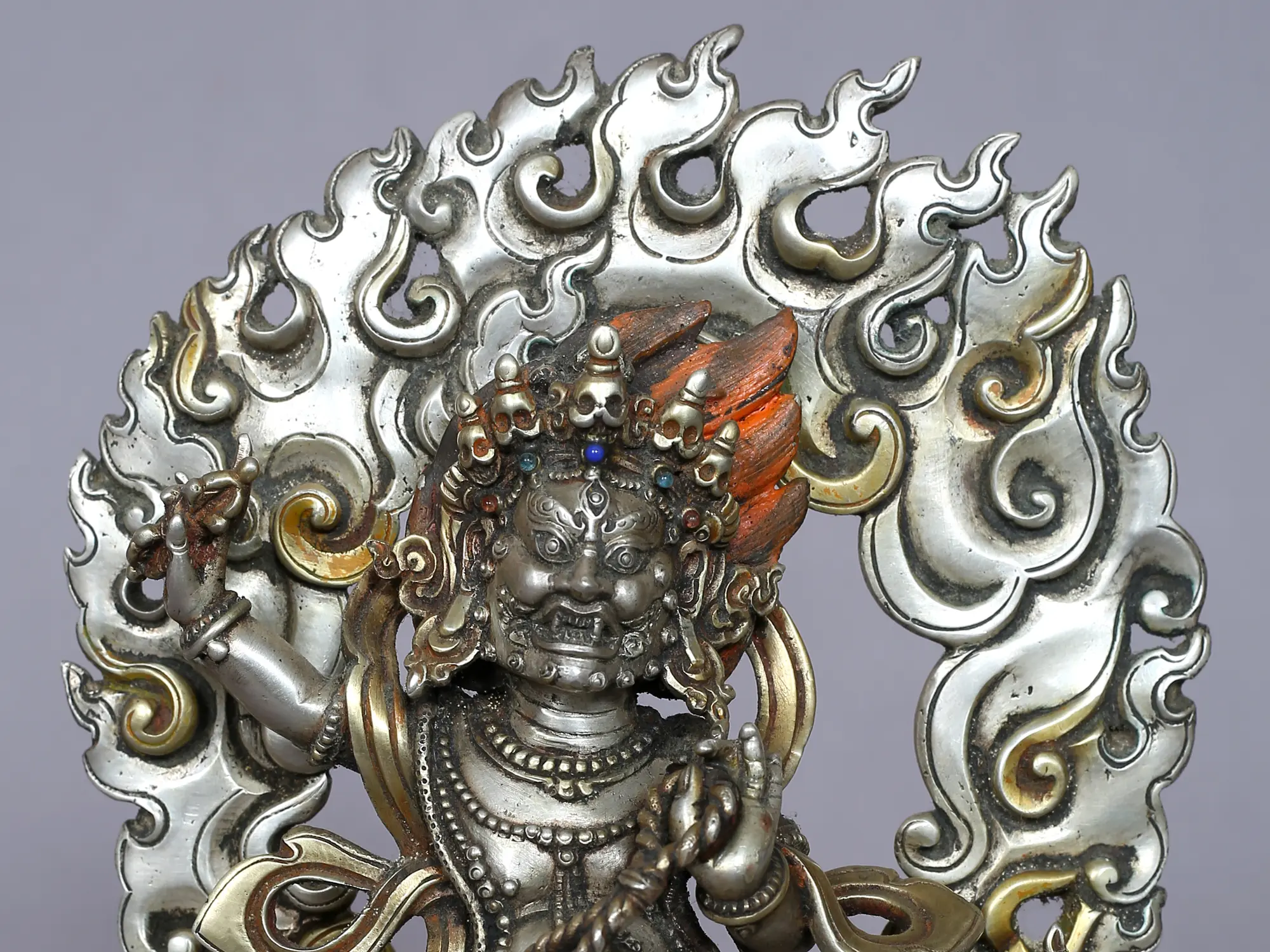 Wielder of the thunderbolt, which is the Buddhist symbol of supreme enlightenment and its powers, Vajrapani is associated with the pinnacle of awakened clarity which is achieved through the fire of inner consciousness. The vigor on Vajrapani’s face in this silver Nepalese statue is representative of the potencies of enlightenment, which unwaveringly challenge and annihilate the darkness within. The light of the awakened state creates a flaming halo around Vajrapani’s head and form. Wearing a bejeweled crown and tiger hide, Vajrapani lunges dynamically, giving the statue a distinct aesthetics.