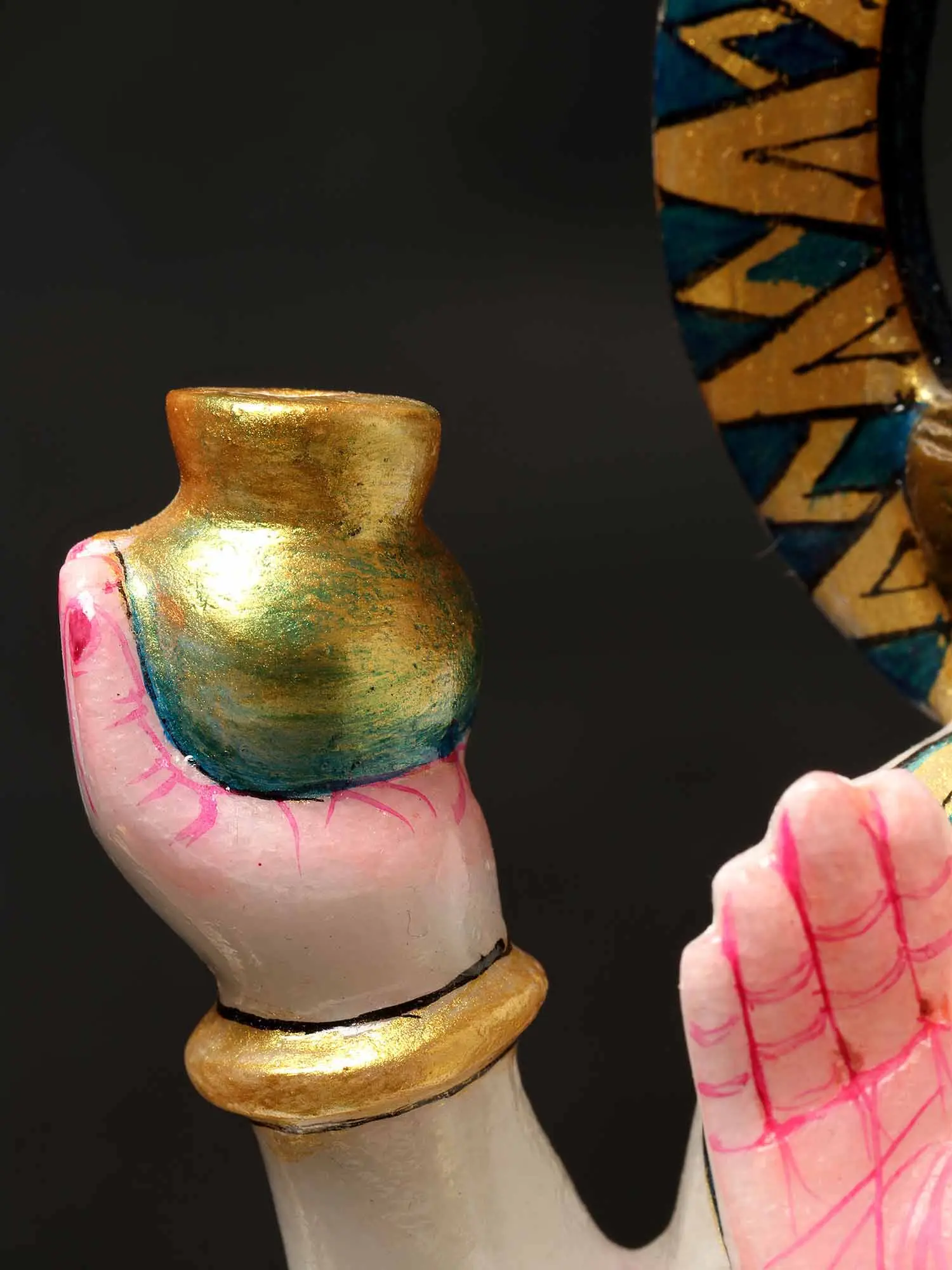 Crafted from luminous white marble, this statue embodies the purity and celestial essence of Chandra. The skilled artisans have meticulously carved each detail, from the delicate folds of Chandra's garments to the expressive features of his face and the gentle posture of his bull. The hand-painted accents in gold, red, and blue further enhance the statue's visual appeal, bringing to life the divine vibrancy of the Moon god. This piece is not merely an artistic creation but also a conduit for spiritual connection, ideal for placement in a home altar, meditation space, or as a unique decorative accent. Owning this representation of Chandra allows one to invoke his blessings for inner peace, emotional well-being, and harmonious relationships. The presence of the intricately designed yantra in the upper corner of the accompanying image suggests a connection to tantric practices, further deepening the spiritual significance and potential applications of this divine representation.