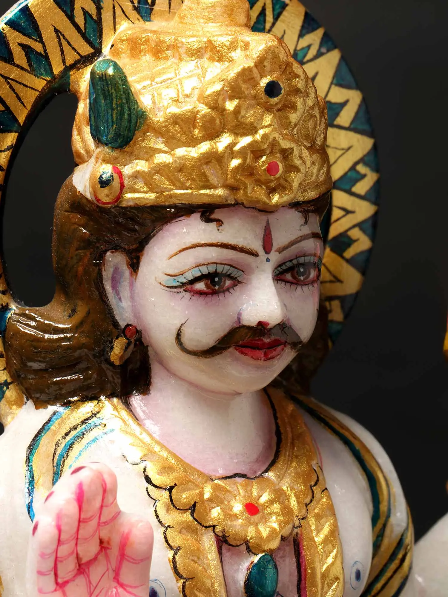 This exquisite white marble statue depicts Chandra, the Hindu deity representing the Moon and one of the Navagrahas, the nine celestial bodies that influence our lives according to Vedic astrology. Chandra, the god of the Moon, is revered for his calming presence, his association with emotions, and his role in nurturing growth and prosperity. In Hindu mythology, Chandra is often depicted as youthful, fair-complexioned, and radiant, riding a chariot drawn by ten white horses, symbolizing the ten phases of the Moon. He is also known by other names such as Soma, Chandrama, and Rajanipati (lord of the night). The statue captures Chandra in his characteristic form, adorned with intricate golden jewelry, including a majestic crown, a striking pearl and emerald necklace, and ornate armbands. His four hands hold symbolic objects: one cradles a pot of nectar, representing immortality and abundance, while another is raised in a gesture of blessing (Abhaya Mudra), offering protection and reassurance. The other two hands display his divine power, one holding a conch shell, a symbol of auspiciousness, and the other a spear, indicating his dominion. Chandra's serene face, with its finely sculpted mustache and expressive eyes, emanates a sense of profound tranquility and divine wisdom.