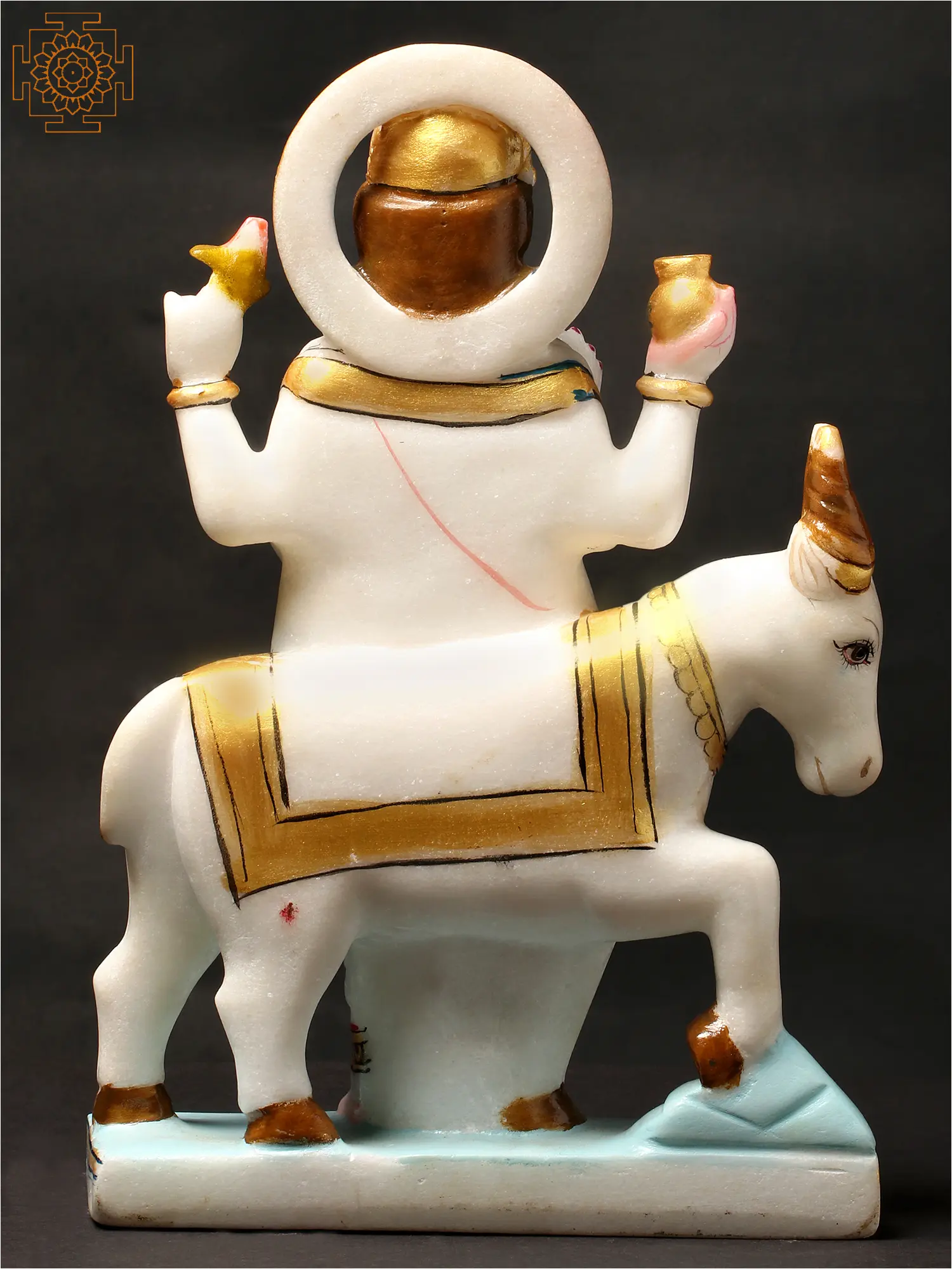Chandra's mount in this sculpture is a magnificent white bull, which is his traditional vahana (vehicle). The bull is a symbol of fertility, strength, and the earth's power, further connecting Chandra to the cycles of nature and the nourishment of life. The detailed ornamentation on the bull's saddle and collar, rendered in vibrant gold and emerald hues, highlights the opulence and divine status of the Moon god. The blue and golden halo behind Chandra's head signifies his celestial origin and his radiant aura, illuminating the night sky. The worship of Chandra is believed to bring peace of mind, emotional stability, and prosperity. In Vedic traditions, the Moon governs the mind, emotions, and intuition. A favorable position of Chandra in one's birth chart is associated with a calm temperament, creativity, and a nurturing disposition. Conversely, challenges related to the Moon can manifest as emotional turmoil, anxiety, or lack of clarity. This statue serves as a powerful reminder of the Moon's constant presence and its subtle yet profound influence on our existence. It is a tangible representation of the cosmic forces that shape our destinies, inviting contemplation and devotion.