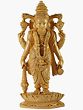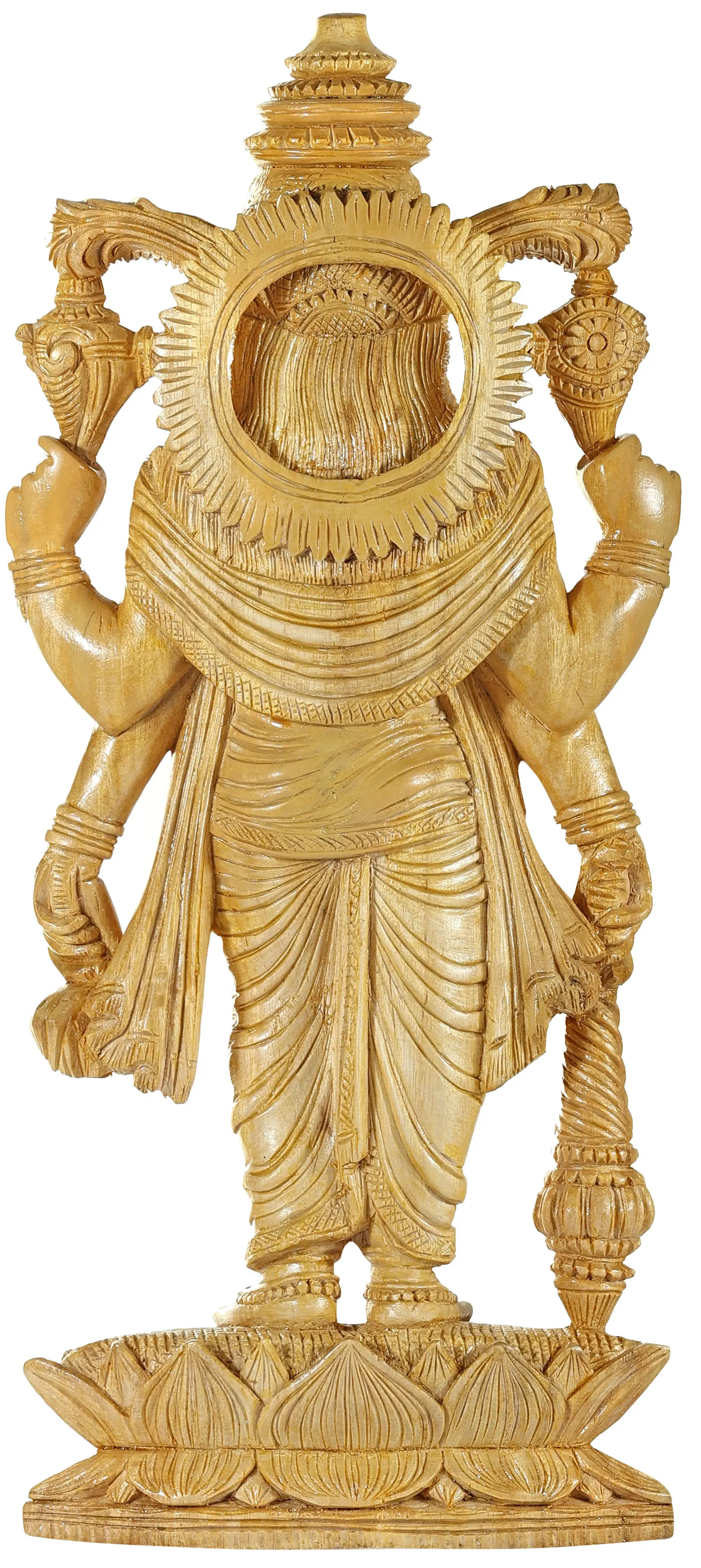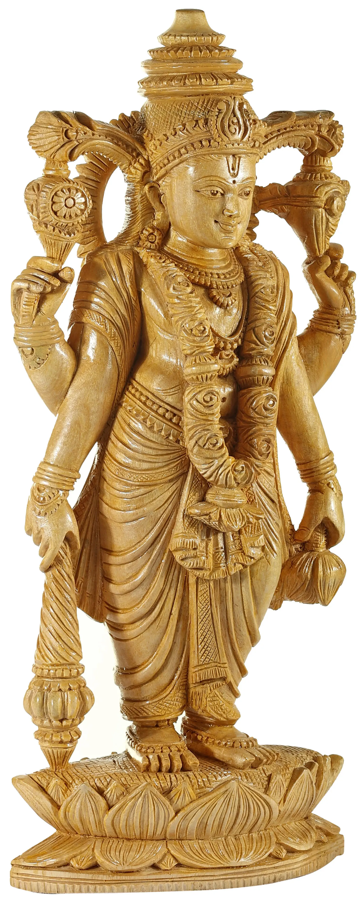 This exquisite wood carving captures the serene and powerful presence of Chaturbhuja Vishnu, the preserver of the universe, as he stands in a posture of grace and authority. Crafted from fragrant cedar wood sourced from the verdant landscapes of Trivandrum in Kerala, India, this masterpiece embodies the rich artisanal traditions of the region. The natural warmth and fine grain of the wood have been skillfully coaxed by the artisan's touch, bringing to life every detail of this divine form. The figure of Vishnu is depicted with his characteristic four arms, each holding a significant emblem. In one hand, he grasps the conch shell (Shankha), the sound of which dispels ignorance and awakens spiritual consciousness. In another, the discus (Chakra), symbolizing the cosmic wheel of time and the power to destroy evil. His other two hands are depicted in poses that suggest divine blessings and the holding of further symbols, though the specifics are masterfully carved to imply their presence. The deity is adorned with a beautiful garland and intricate traditional jewelry, each element rendered with remarkable precision.