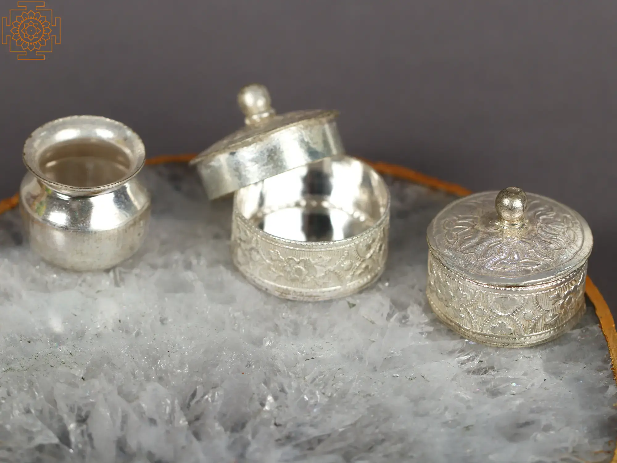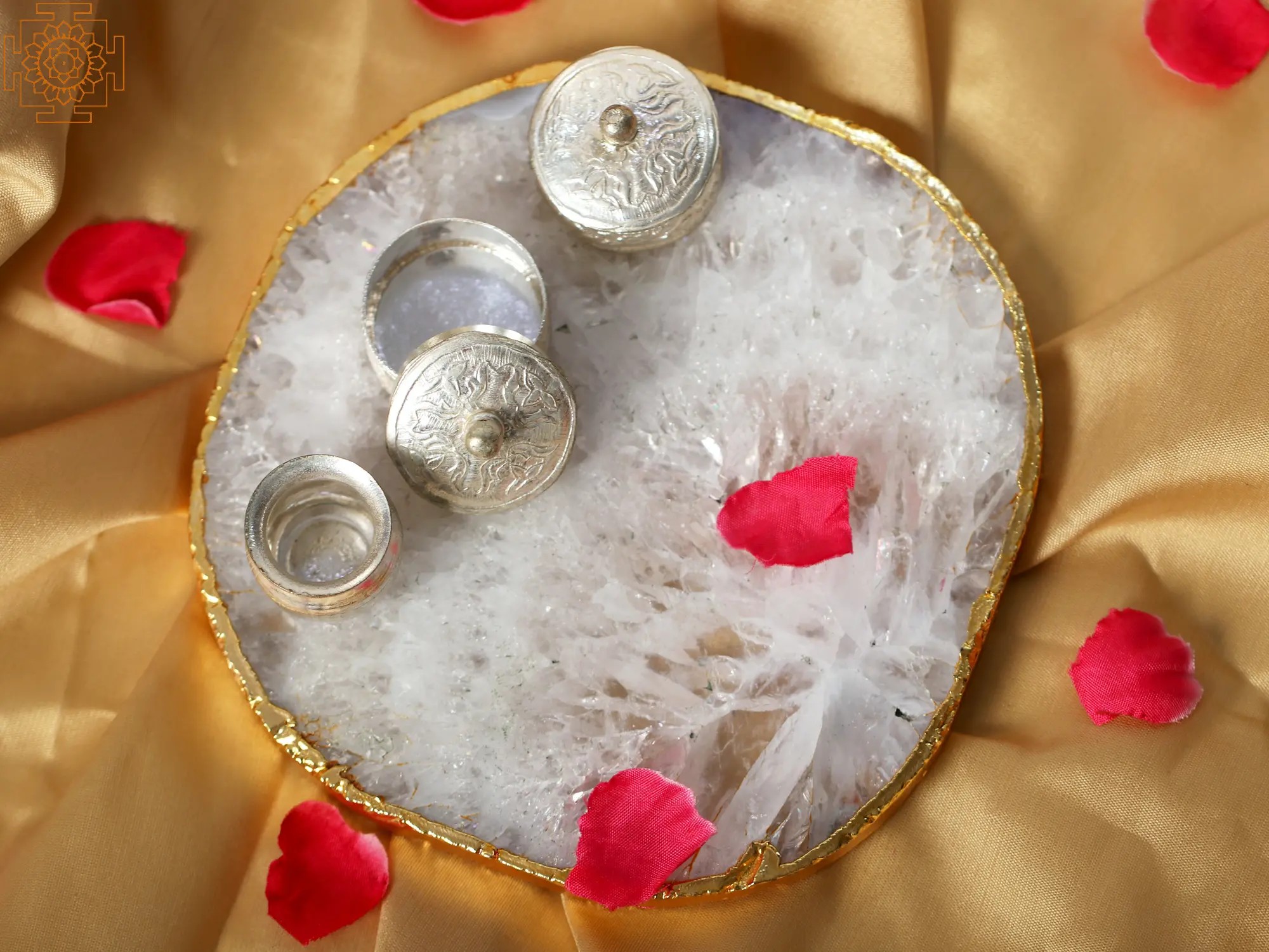 This collection is more than just a set of ritual items; it is an invitation to deepen your connection to the divine and to engage in puja (worship) with a profound sense of reverence and beauty. The natural allure of the clear quartz, embraced by a lustrous golden edge, provides a radiant stage for the shimmering sterling silver. The interplay of textures and the purity of materials create a harmonious visual experience that resonates with spiritual seekers. Presented in a beautiful gift box, this ensemble makes a thoughtful and auspicious present for loved ones, ideal for occasions such as housewarmings, weddings, festivals, or simply to convey blessings and good wishes. Embrace this offering to create a sacred corner in your home, a sanctuary where devotion and artistry converge.
