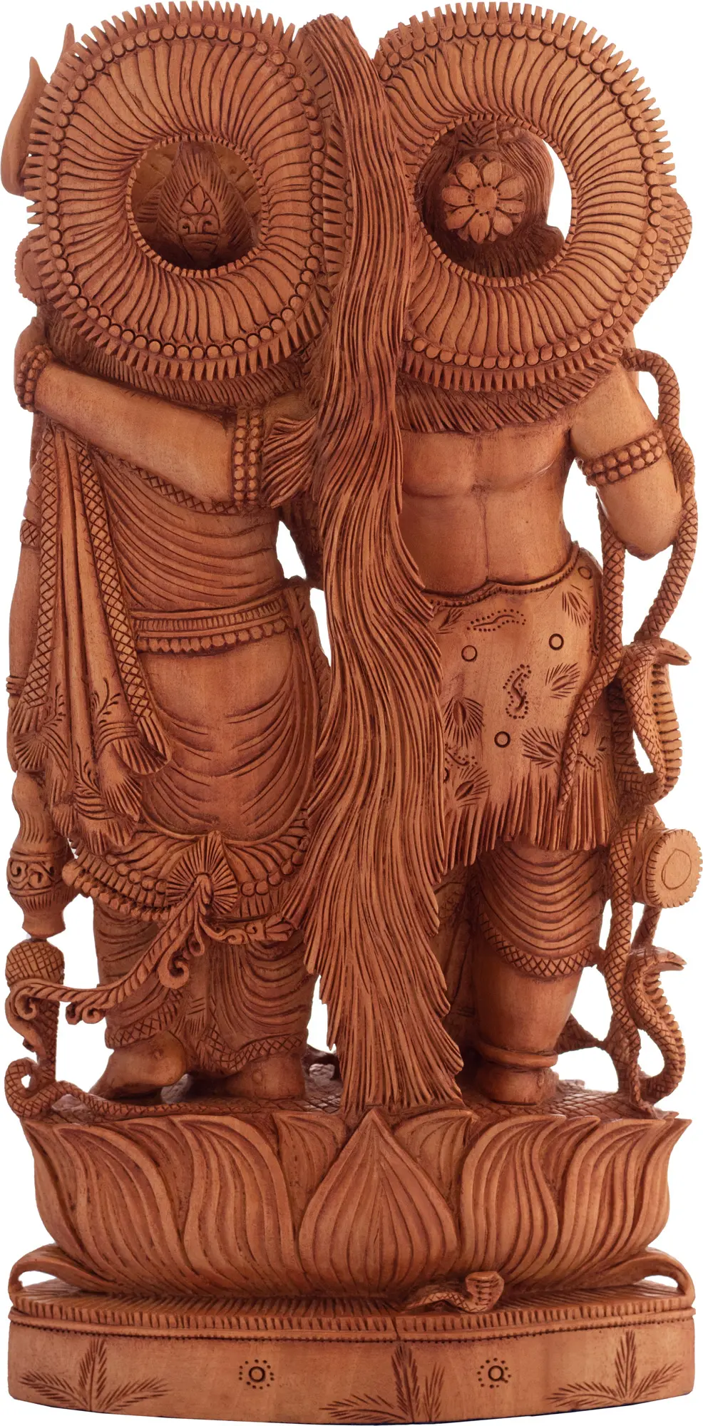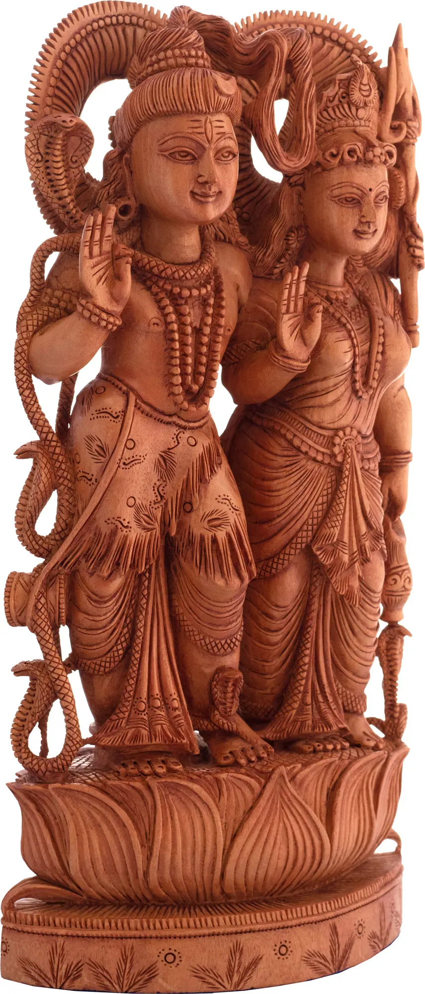 This wooden carving is more than just an artistic representation; it is a conduit for spiritual energy. The choice of Kadamba wood, known for its fine grain and natural aroma, adds a tactile dimension to the piece, making it a truly immersive experience. The traditional carving techniques employed by the artisans of Jaipur ensure that each sculpture is a unique masterpiece, imbued with the spirit and devotion of its creators. In the Puranas and various ancient texts, the story of Shiva and Parvati is one of deep devotion, cosmic dance, and the overcoming of challenges. Their love is depicted as a force that shapes the very fabric of existence. This sculpture serves as a reminder of the importance of balance in our lives, the power of complementary energies, and the profound strength that can be found in unity. Displaying this piece in your home or sacred space can bring a sense of divine presence, foster a harmonious environment, and inspire a deeper connection to the spiritual aspects of life. The intricate carving, from the lotus base to the divine visages and symbolic accouterments, speaks volumes of the dedication and reverence embedded in its creation.