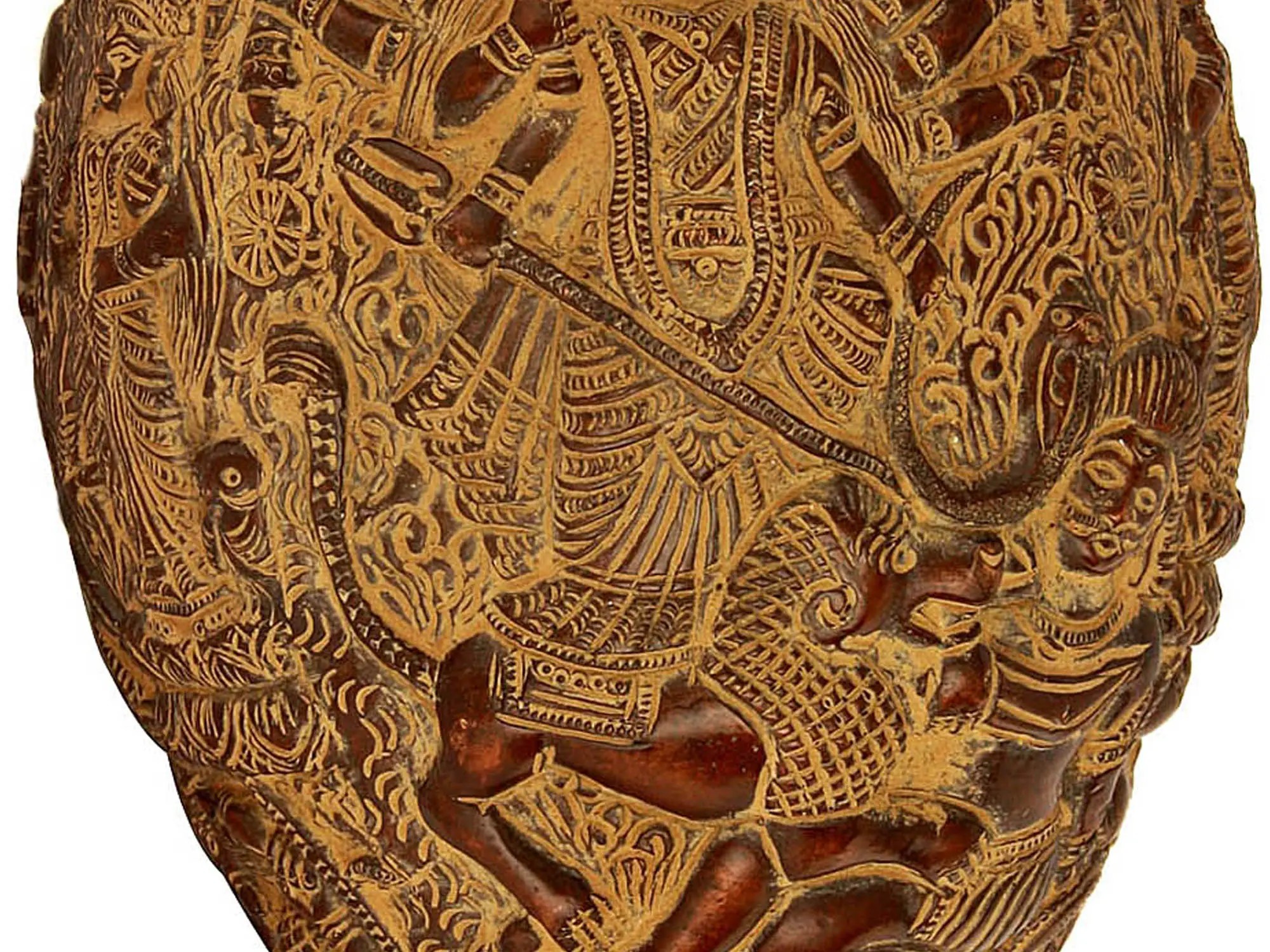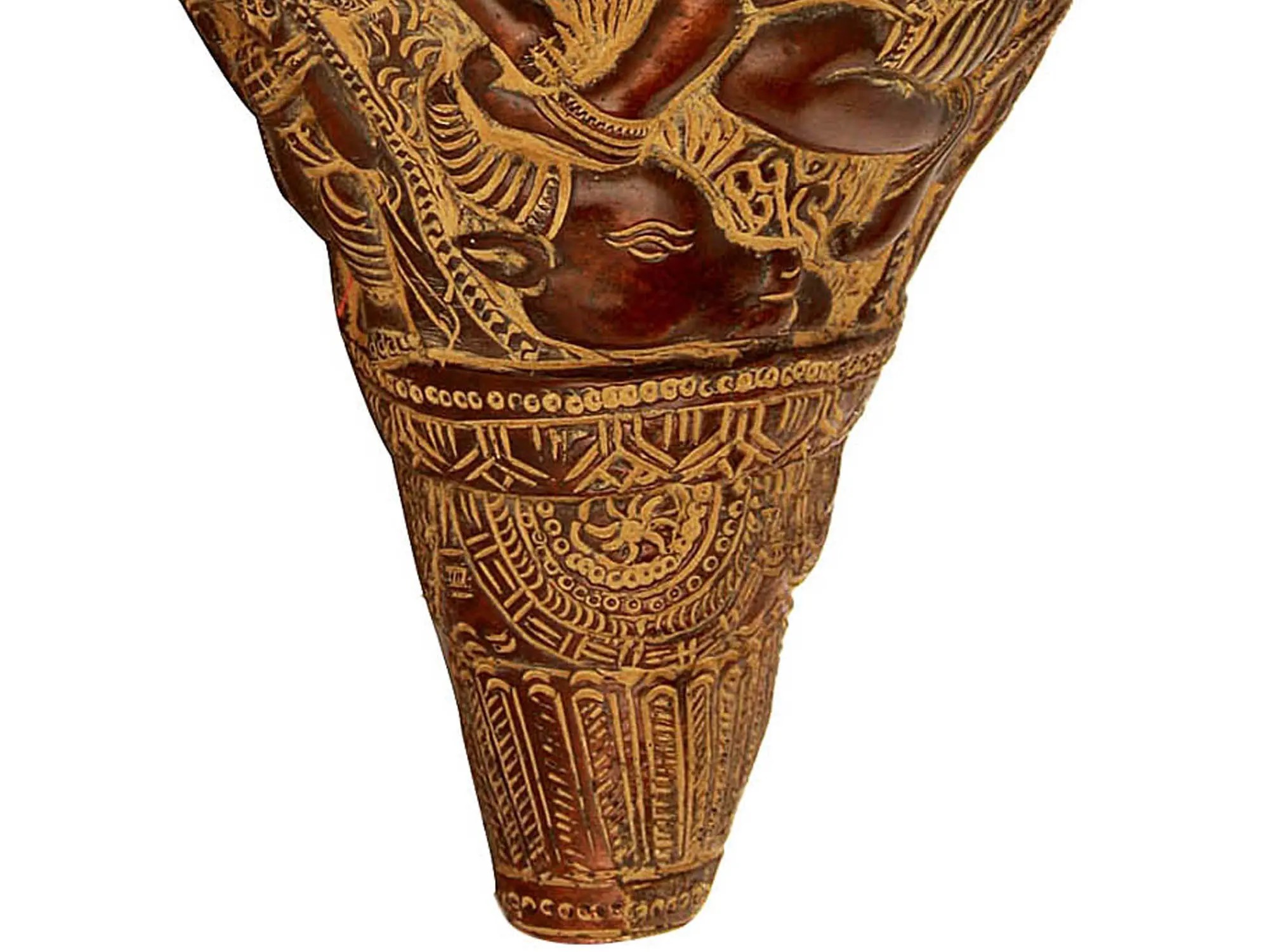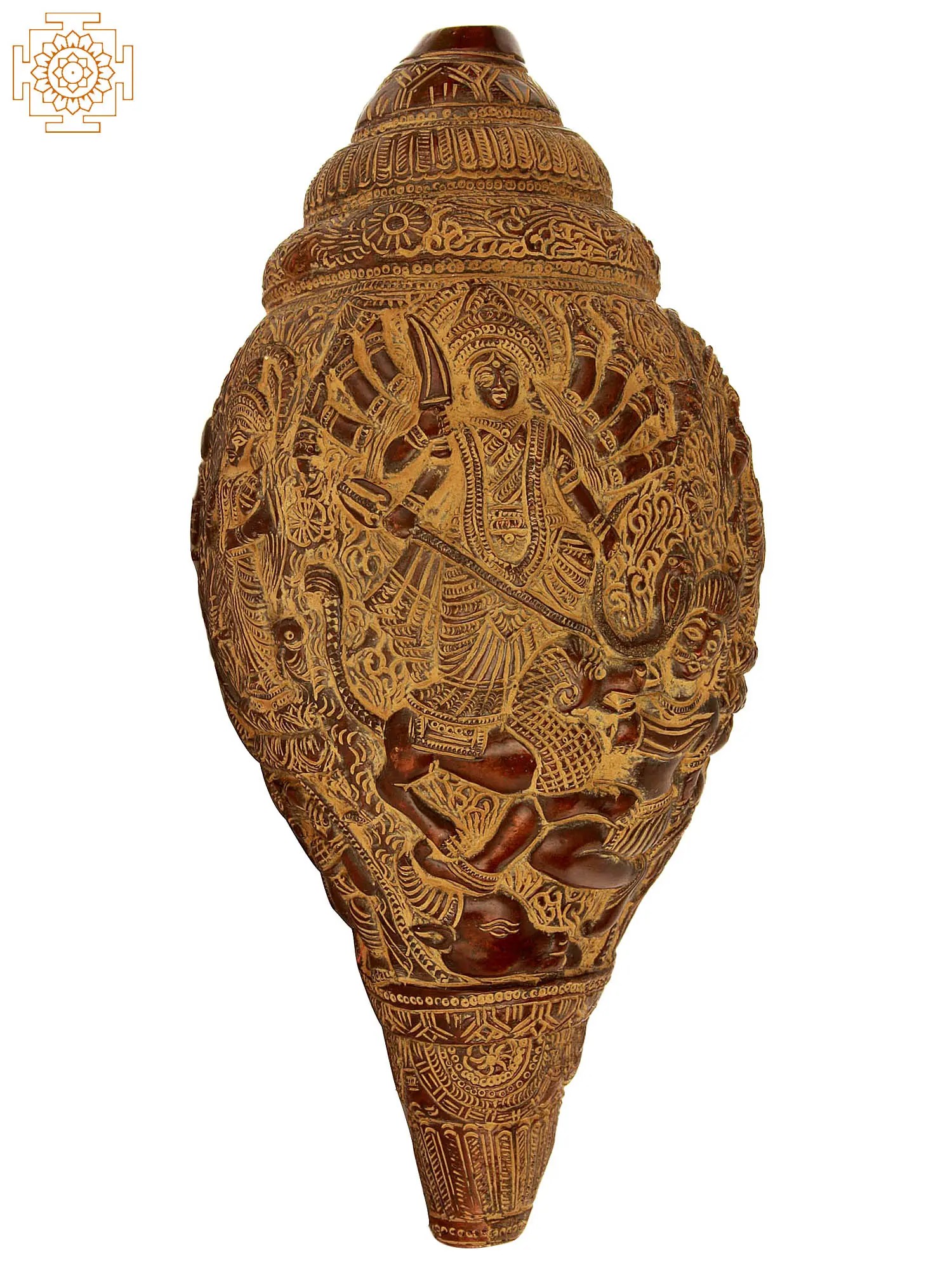 Discover a Conch with Goddess Durga, Saraswati, Lakshmi, and Ganesha, adorning a beautiful wall hanging in brass. The conch symbolizes the celestial chorus that resonates across the universe. Durga, Saraswati, Lakshmi, and Ganesha come together, each with their unique gifts, showering blessings upon the devotee. As you connect with this sculpture, the blessings of the divine chorus shall shower upon you. Like the conch that spreads its sound far and wide, may their grace reverberate in your heart, bringing prosperity, knowledge, wisdom, and protection into your life.