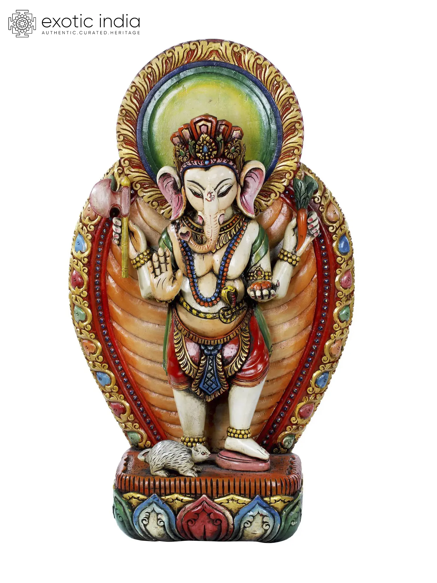 The lotus pedestal on which Ganesha stands along with the white mouse (his sacred vehicle) is carved in a colorful and unique style, forming a dual aureole as the backdrop. The orange colored wooden formation is designed in horizontal parallel lines along with the multi-colored stone studded gold border, while the circular yellow-green halo at the top is outlined in gold floral borders highlighting his cosmic aura.