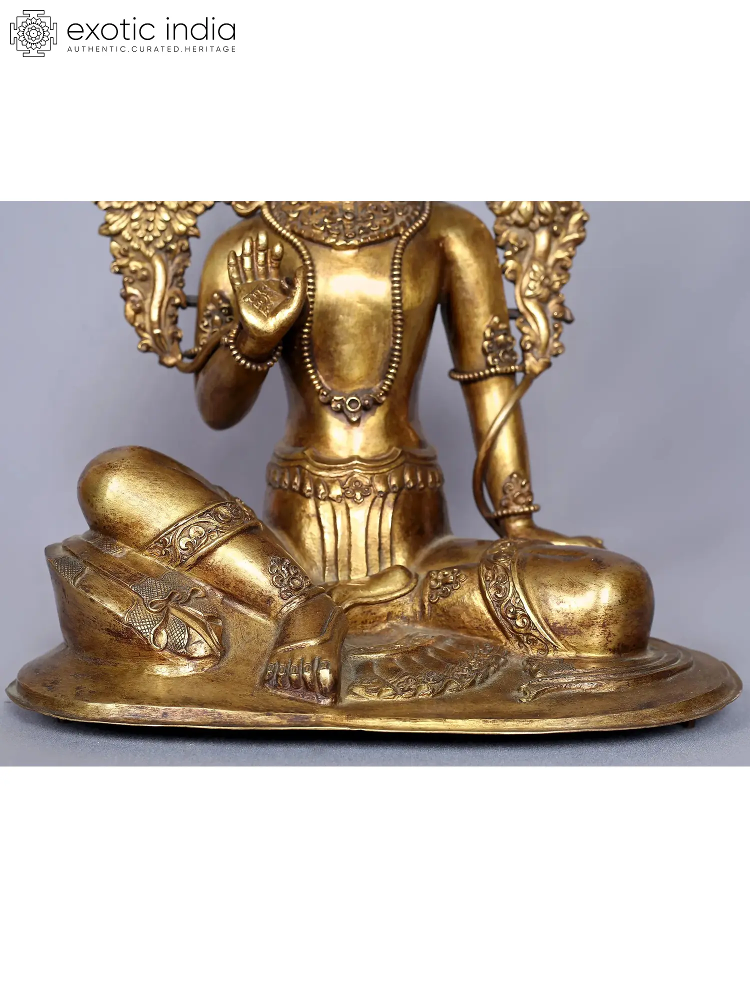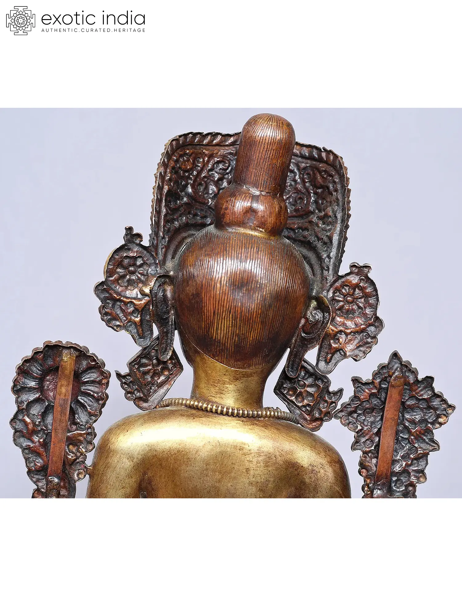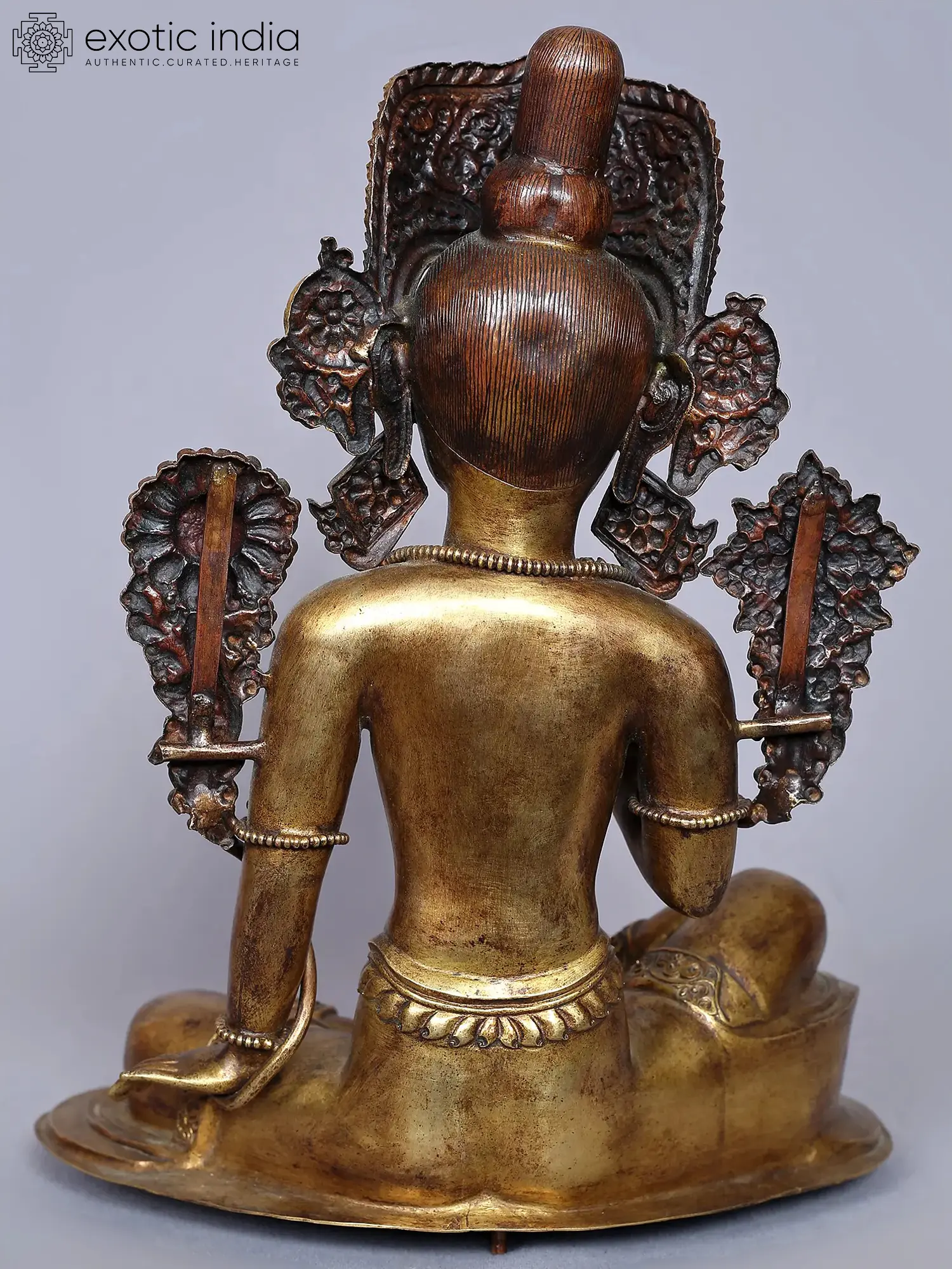 Indra, also known as Shaka in Nepalese Buddhism is depicted in this gilded copper Nepalese statue in a pleasing young form, his face carrying the innocence of a child and his limbs yet to reach full bloom. Following the belief that dwellers of heaven are ageless and youthful, the maker of this icon presents Indra seated majestically, adorned royally with a distinctive Nepalese crown, earrings, and necklace. Sculpted in a rounded manner, the statue of Indra shows details of his complex hairdo on the reverse.