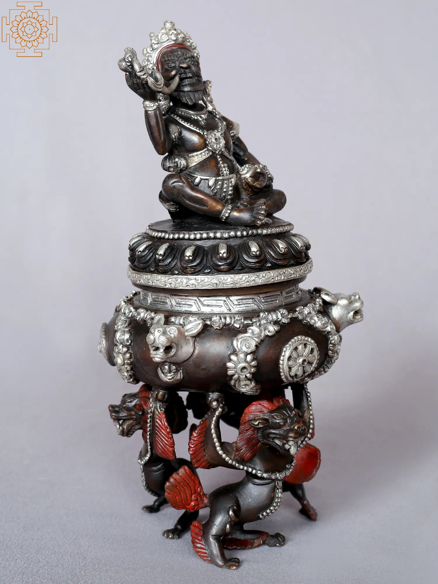 As such, the presence of one on your incense burner makes this a one-of-a-kind incense burner. It is a unique piece of art in itself, having been fashioned from dark-coloured copper. The pure copper make is then superimposed with luxuriant silver embellishment. These embellishment take the form of mythical creatures and adornment of the daka.