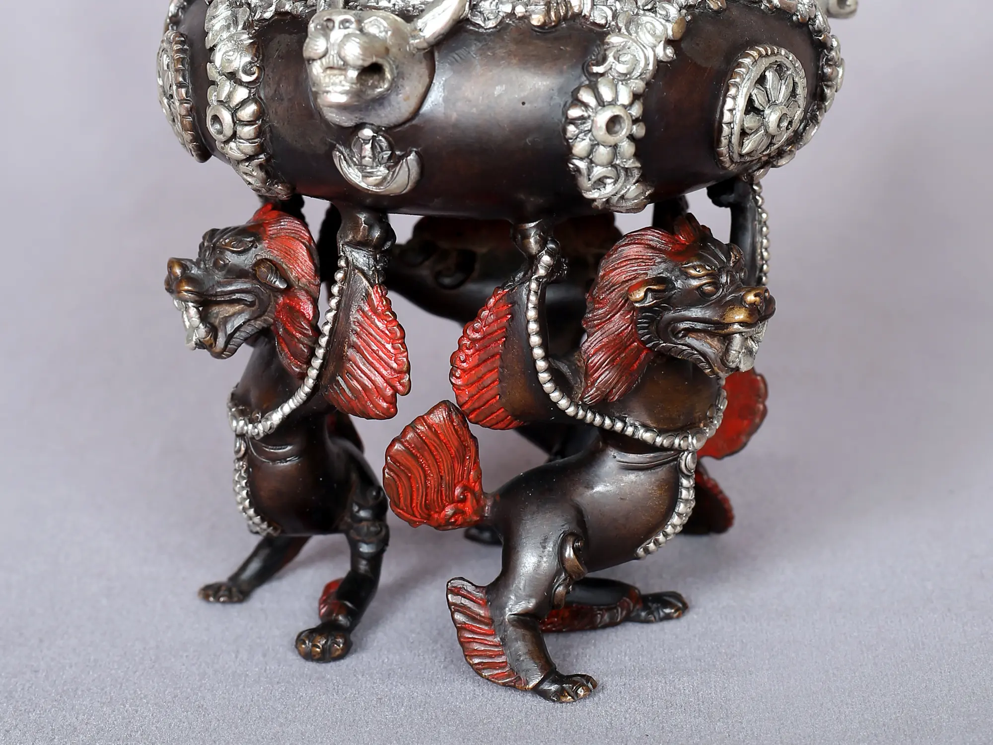 A set of three wrathful creatures of the Buddhist heavens, bearing strong resemblance to the lion, hold up the incense burner.