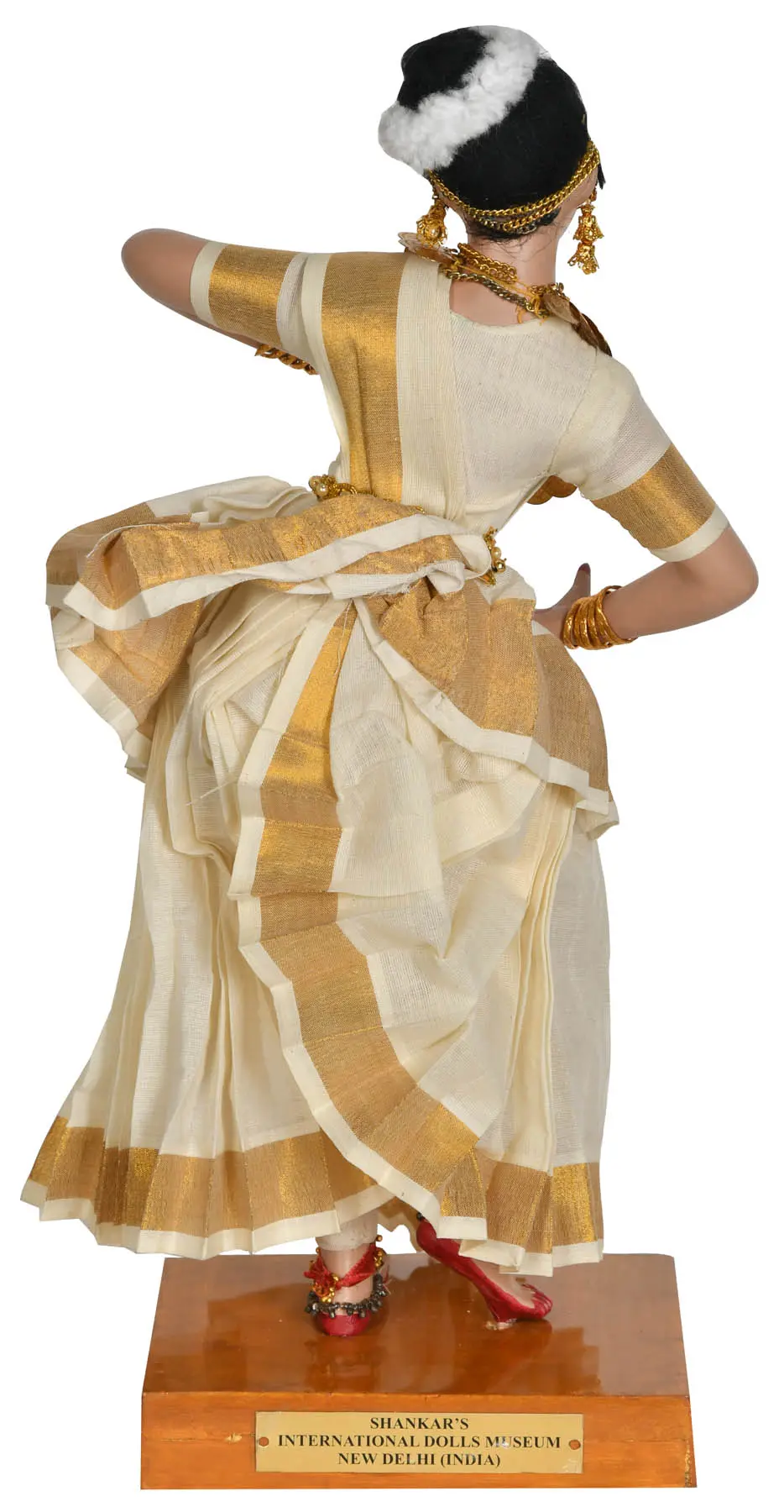 Crafted with meticulous attention to detail using traditional papier-mâché techniques, this figurine embodies the elegance of a Mohini Attam dancer. The costume is a faithful representation of the traditional attire, a lustrous off-white sari adorned with rich gold borders, symbolizing purity and prosperity. The dancer's stance is fluid and expressive, with hands delicately positioned in graceful mudras (hand gestures) that tell stories without words. Her elaborate jewelry, including the distinctive kasu mala (coin necklace), bangles, and intricate headpiece, further accentuates the regal aura of the performance. The dancer's makeup is subtle yet striking, highlighting her expressive eyes and serene facial features, a hallmark of the Mohini Attam aesthetic which emphasizes delicate beauty and nuanced emotions.