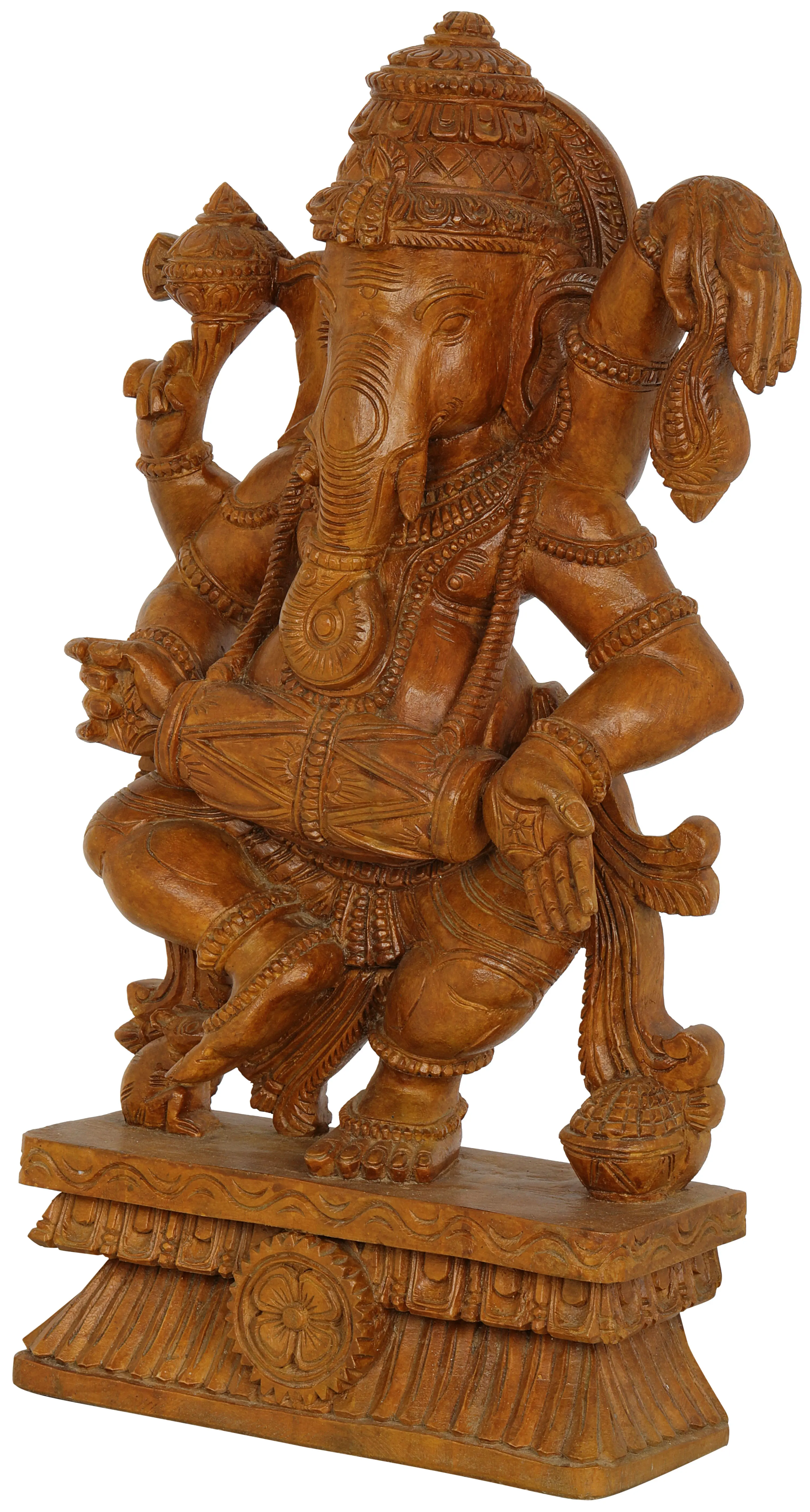 Invoke blessings and foster a spirit of joy and prosperity with this exquisite wooden carving of Lord Ganesha, the beloved elephant-headed deity. This statue captures Ganesha in a dynamic and celebratory pose, his limbs in motion, accompanied by the resonant beat of a drum. The intricate craftsmanship showcases the divine energy and playful nature that Ganesha embodies. Lord Ganesha, the remover of obstacles and the patron of arts and sciences, is a central figure in Hinduism, revered by millions worldwide. His iconography is rich with symbolism. The elephant head signifies wisdom, intelligence, and strength, while his large ears symbolize his ability to listen to the prayers of his devotees. His many arms represent his omnipresence and power to bestow blessings. Here, he is depicted holding a drum, an instrument often associated with celebration, creation, and the cosmic rhythm of the universe. In Hindu mythology, the sound of the drum (dhol) is said to awaken spiritual consciousness and dispel negativity. The pose suggests a joyous dance, perhaps celebrating the removal of impediments or the ushering in of new beginnings.
