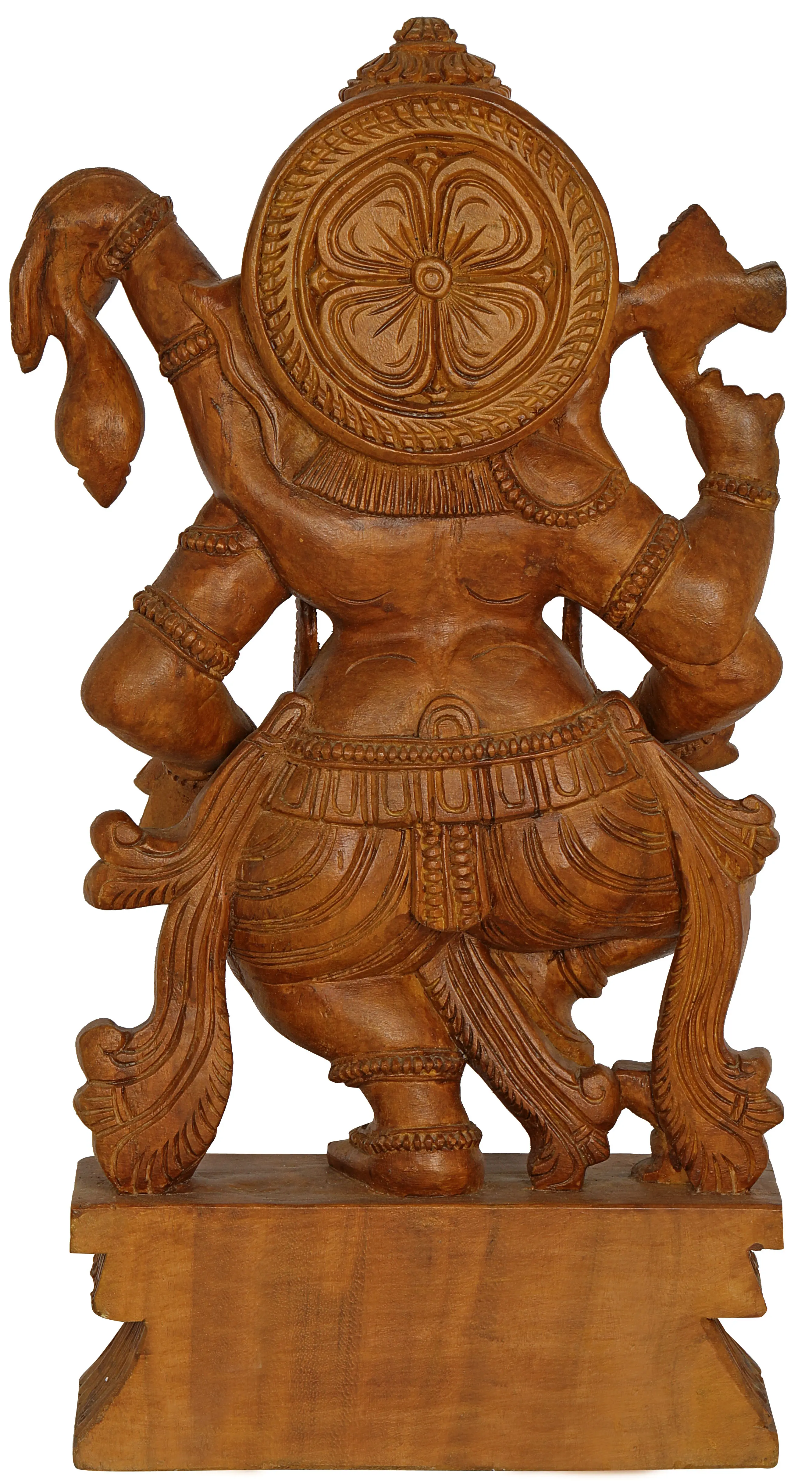 Not just Ganesha himself, even the drum is etched in a beautiful zig-zag design, with a sun formation in every triangle. The bright golden-brown hue of this wooden Ganesha sculpture enhances its beauty with an assurance of attracting the attention and praise of the viewer with its superfine quality and beautiful carves.