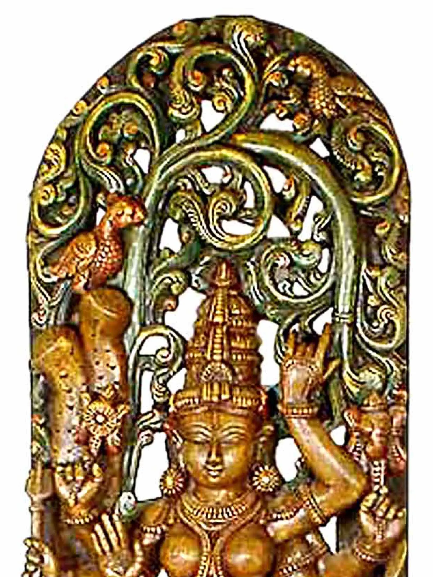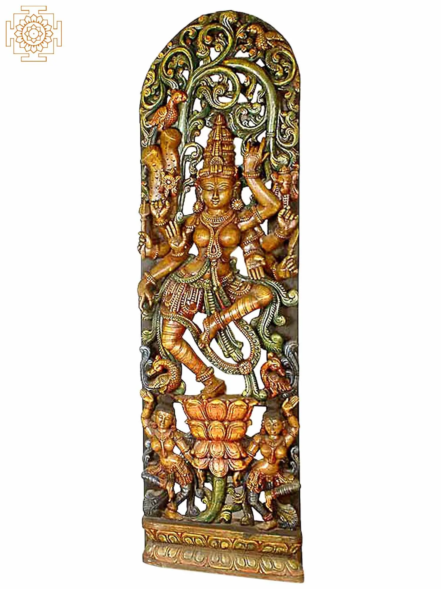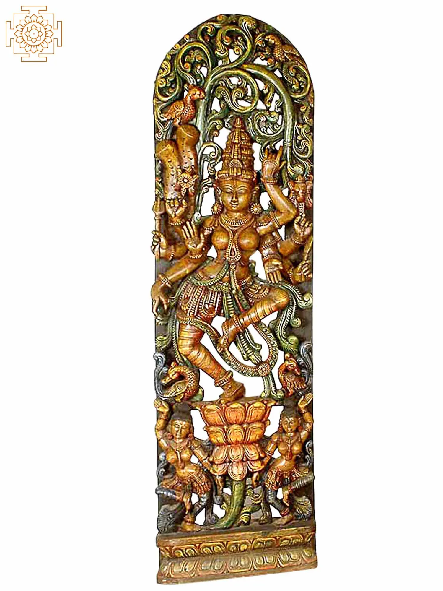 The central figure is captured in a dynamic dance pose. In this form, the goddess is not only beautiful but also a force of nature, a symbol of energy and vitality. Her movements evoke the *lasya*, the feminine dance of creation and preservation, which complements Shiva's *tandava*, the masculine dance of destruction and renewal. Together, their dances represent the eternal cycle of the universe. The multiple arms, adorned with jewels and sacred symbols, signify her immense power and her ability to perform various acts simultaneously. Note the intricate detail in the fingers and hand poses, representing *mudras*, each with its own specific meaning and energetic effect. The carving also subtly acknowledges Parvati’s association with nature. The serpent winds around her, a symbol that is associated with Shiva as well as with Parvati and represents cosmic energy, transformation, and the cyclical nature of time. Her pose on the lotus pedestal is a subtle reference to her divine nature. The lotus springing from the base symbolizes purity, enlightenment, and spiritual awakening. She rises above the mundane, rooted in the earth but reaching for the heavens. This temple wood carving, rich in detail and steeped in mythological significance, serves not only as a stunning work of art but also as a powerful reminder of the beauty and depth of South Indian culture and the enduring power of the divine feminine.