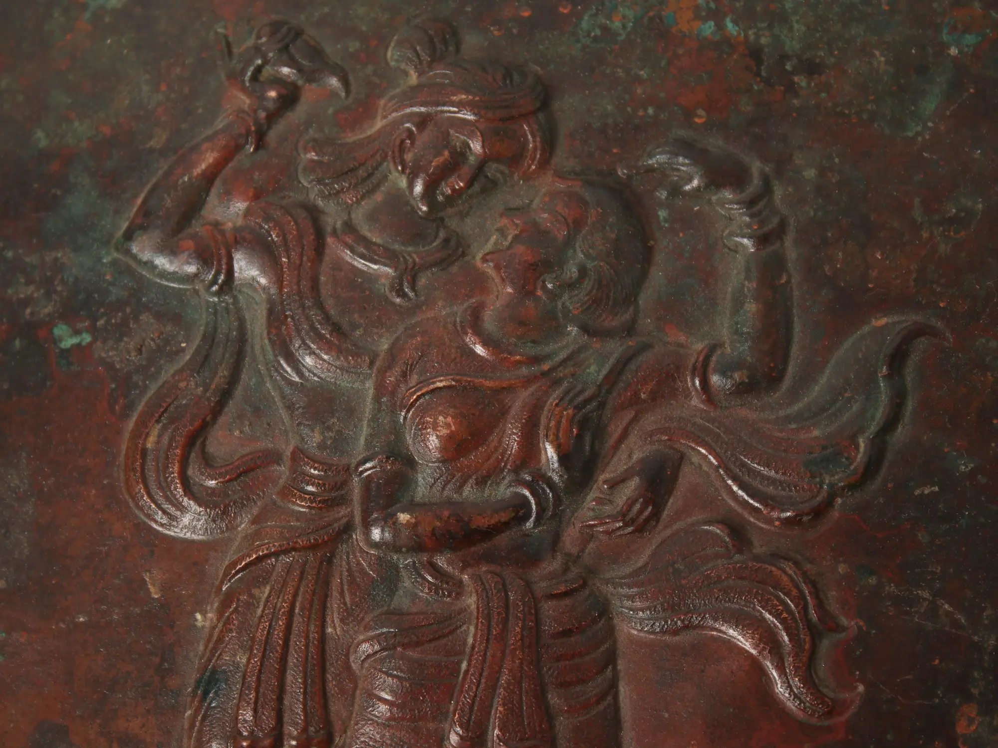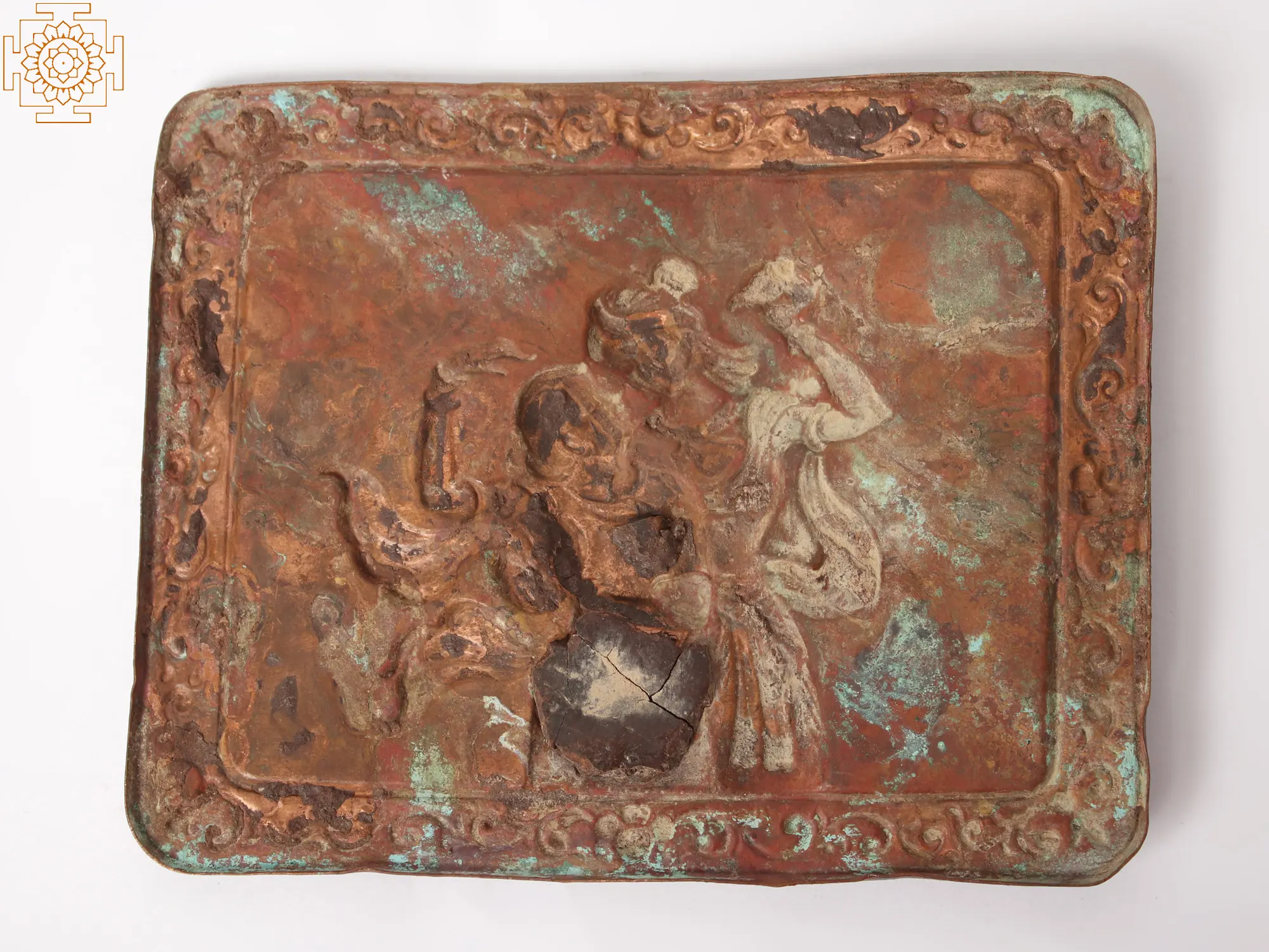 The sweetness of Vrindavan comes to your space with this vintage copper plate artwork, a depiction of the divine romance of Radha-Krishna in metal. The rectangular copper plate has an antiquated finish, which becomes aesthetically enriched by the figures of dancing Radha and Krishna, sculpted on the plate using the technique of repoussage- hitting the metal with a hammer on the reverse to create the image in low-relief or raised on the surface.