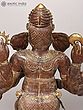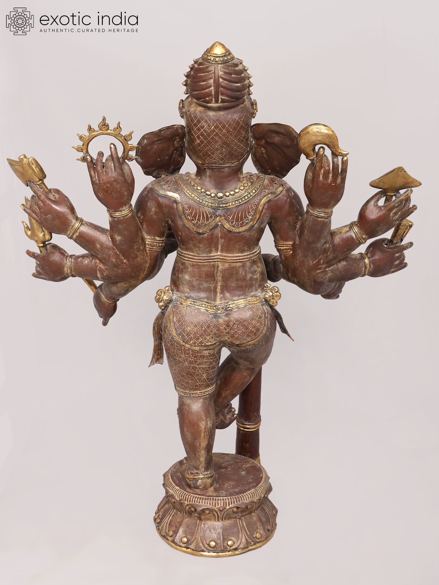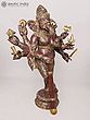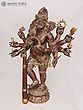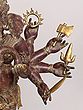 Features symbolic attributes held in its multiple hands, signifying power and protection.