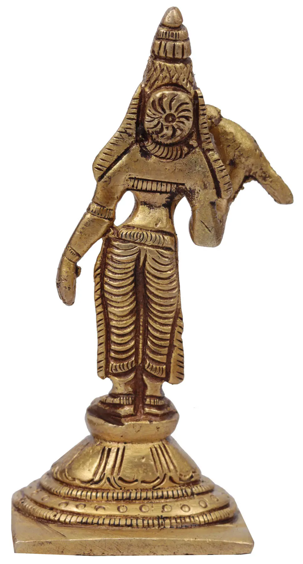 This exquisite brass statue captures the spirit of Devi Andal, one of the twelve Alvars and a revered poet-saint in the Vaishnavite tradition of Hinduism. Her divine form, rendered in lustrous brass, exudes a serene grace and profound devotion. She stands poised, a figure of spiritual contemplation and love, her gentle smile hinting at the celestial songs she composed in praise of Lord Vishnu. The intricate details of her adornments, from the delicate necklaces to the sculpted folds of her garment, speak to the artistry and reverence with which this piece was crafted. ––––––––––––––––––