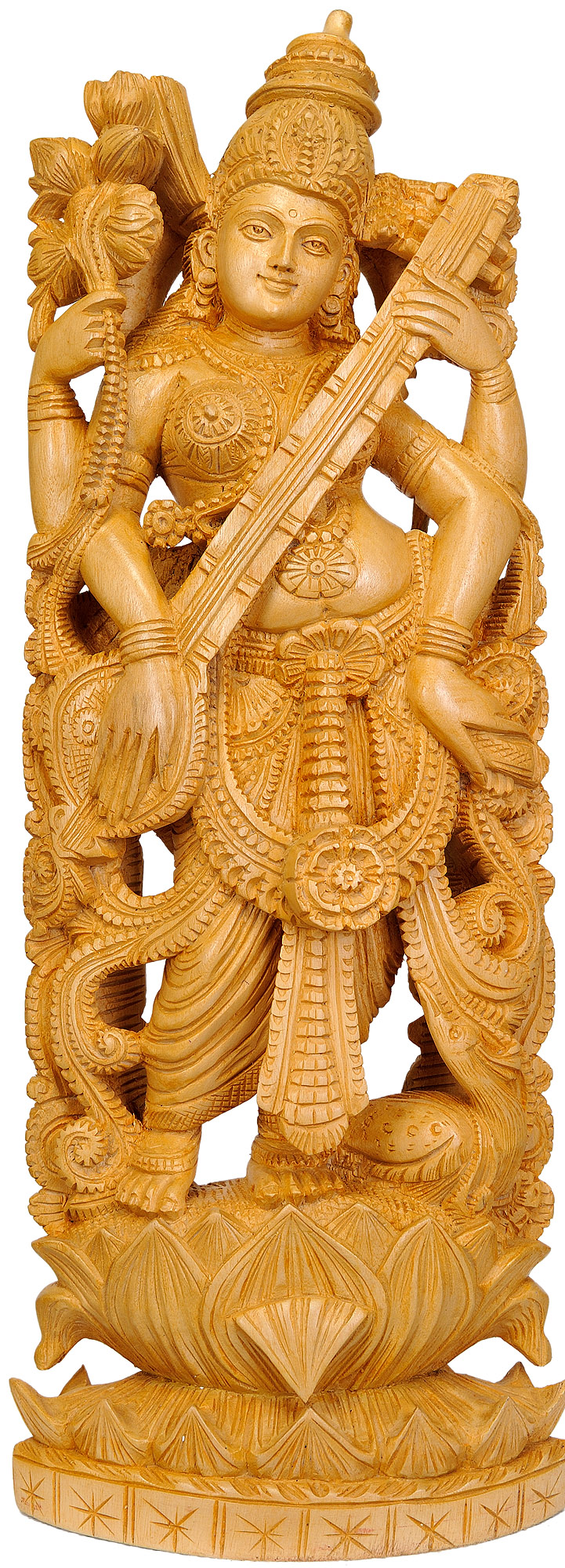 Saraswati, the Hindu goddess of knowledge, music, art, wisdom, and learning, is revered across various traditions and cultures. She is often depicted with four arms, each representing different facets of her dominion: speech, intellect, mind, and spirit. In this particular portrayal, she is shown holding her veena, the ancient Indian lute, a symbol of musical harmony and artistic expression. The meticulous details carved into the wood capture the delicate grace of her posture and the intricate ornamentation adorning her divine form. From the flowing drapery of her garments to the serene expression on her face, every element speaks of a profound connection to the creative muse. The lotus upon which she stands is a universal symbol of purity, beauty, and spiritual awakening, further enhancing the divine aura of the sculpture.
