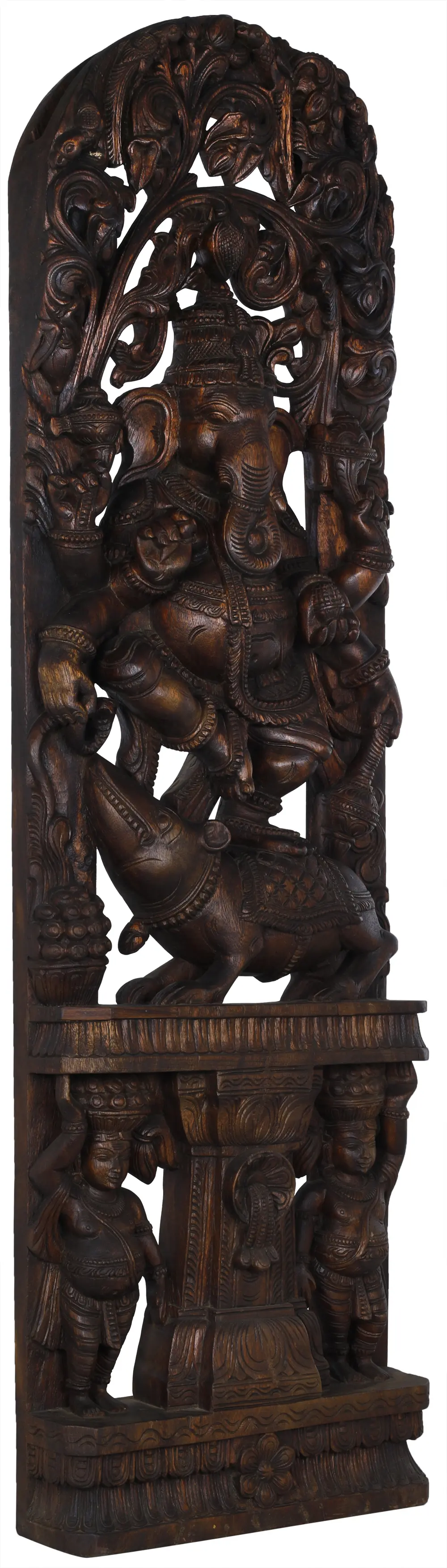Carved out precisely in an exotic color combination using the ever-so-famous wood from South India. This large size sculpture depicts Lord Ganesha performing his divine dance on his resourceful Mushika (Mouse), with the most alluring part being the natural chisels on the statue highlighting the key features and their immense beauty.