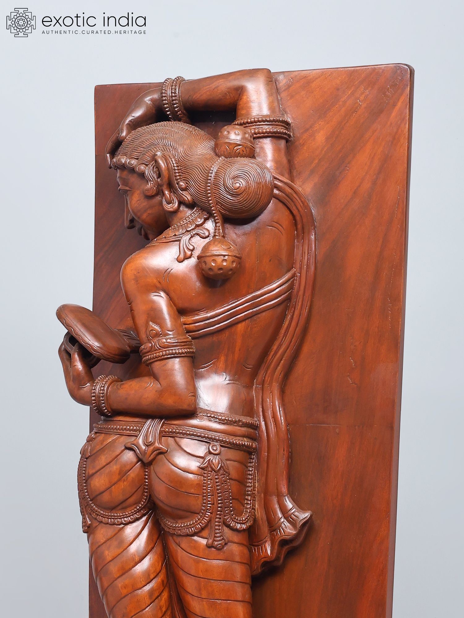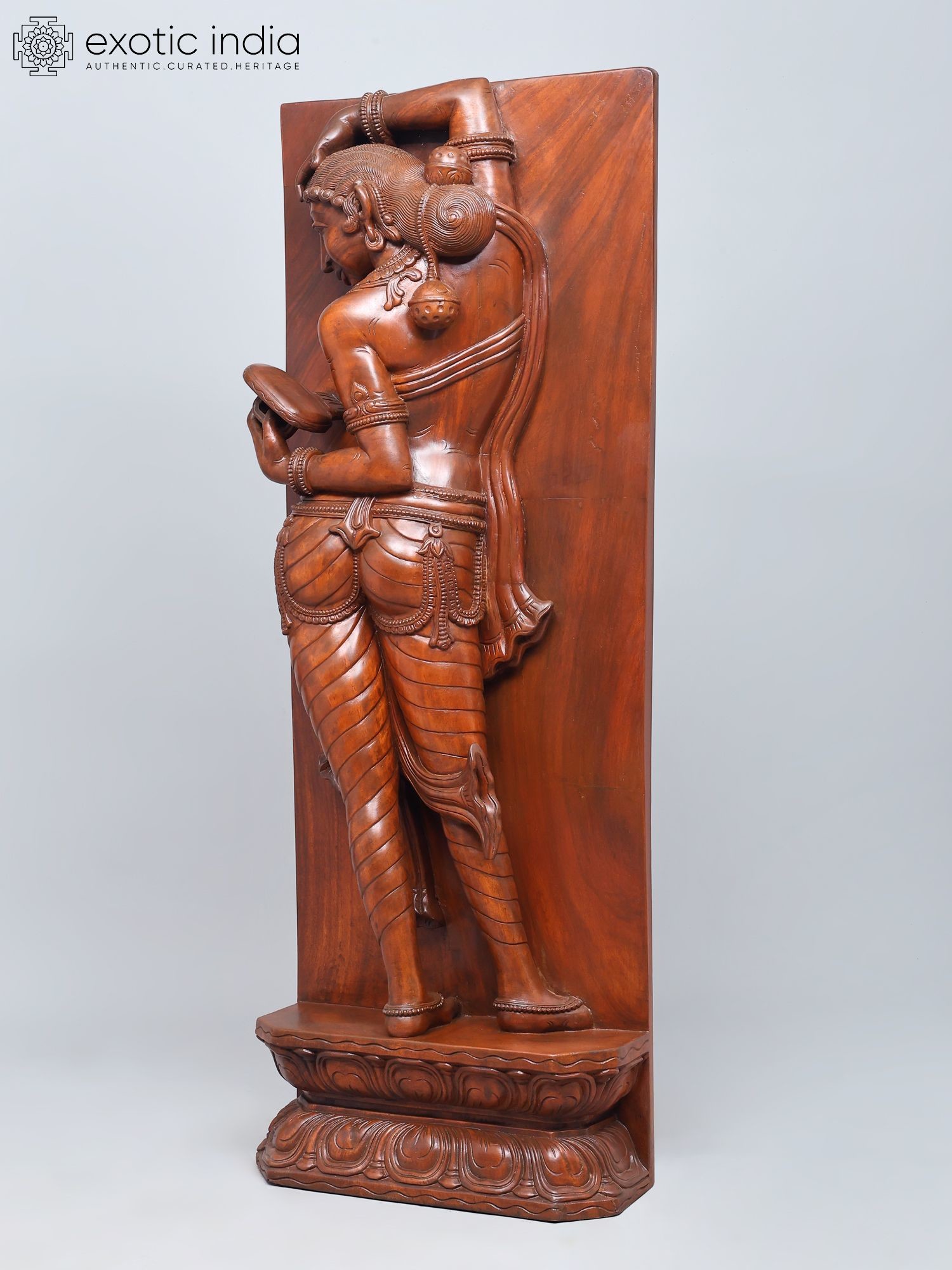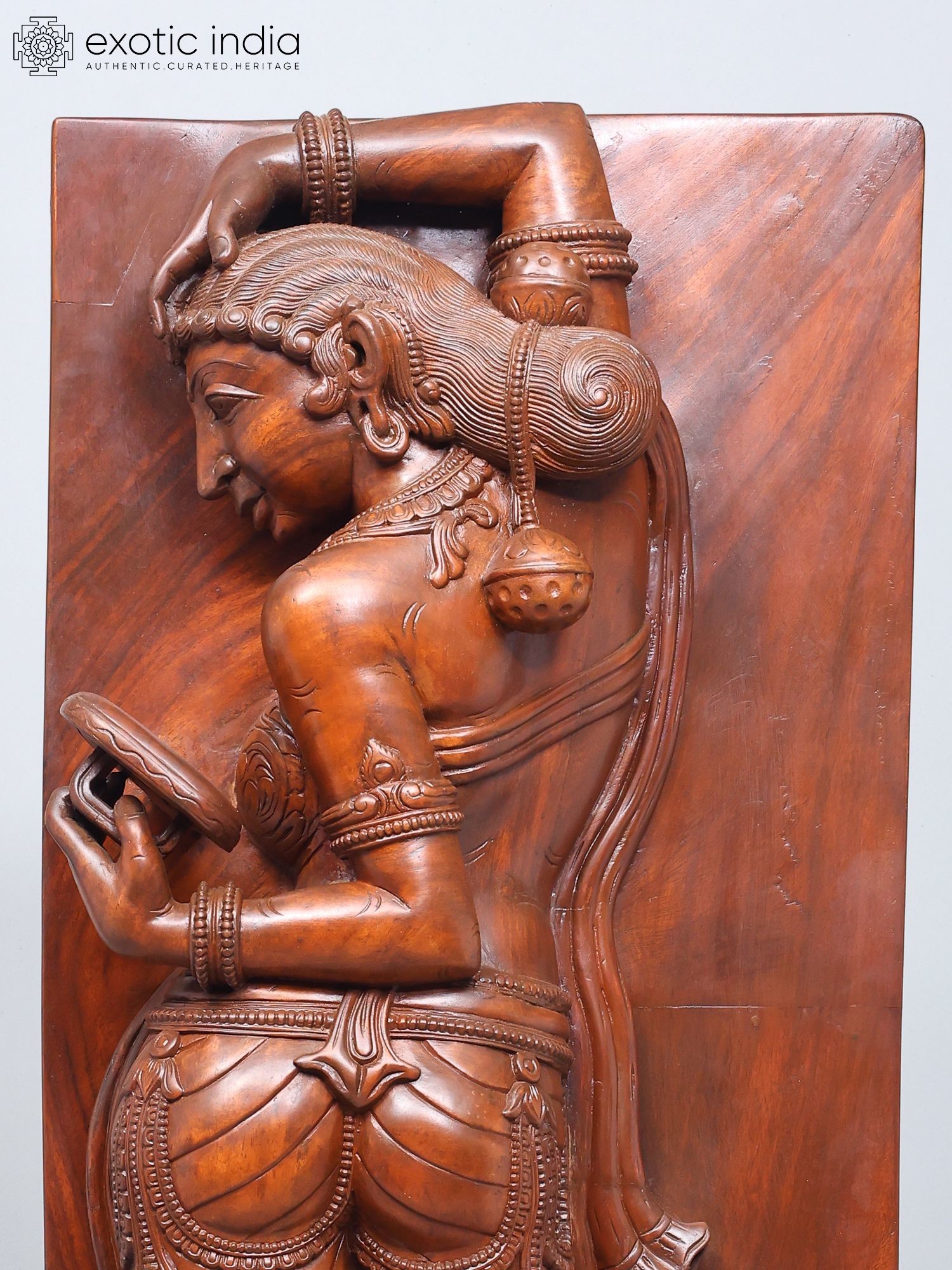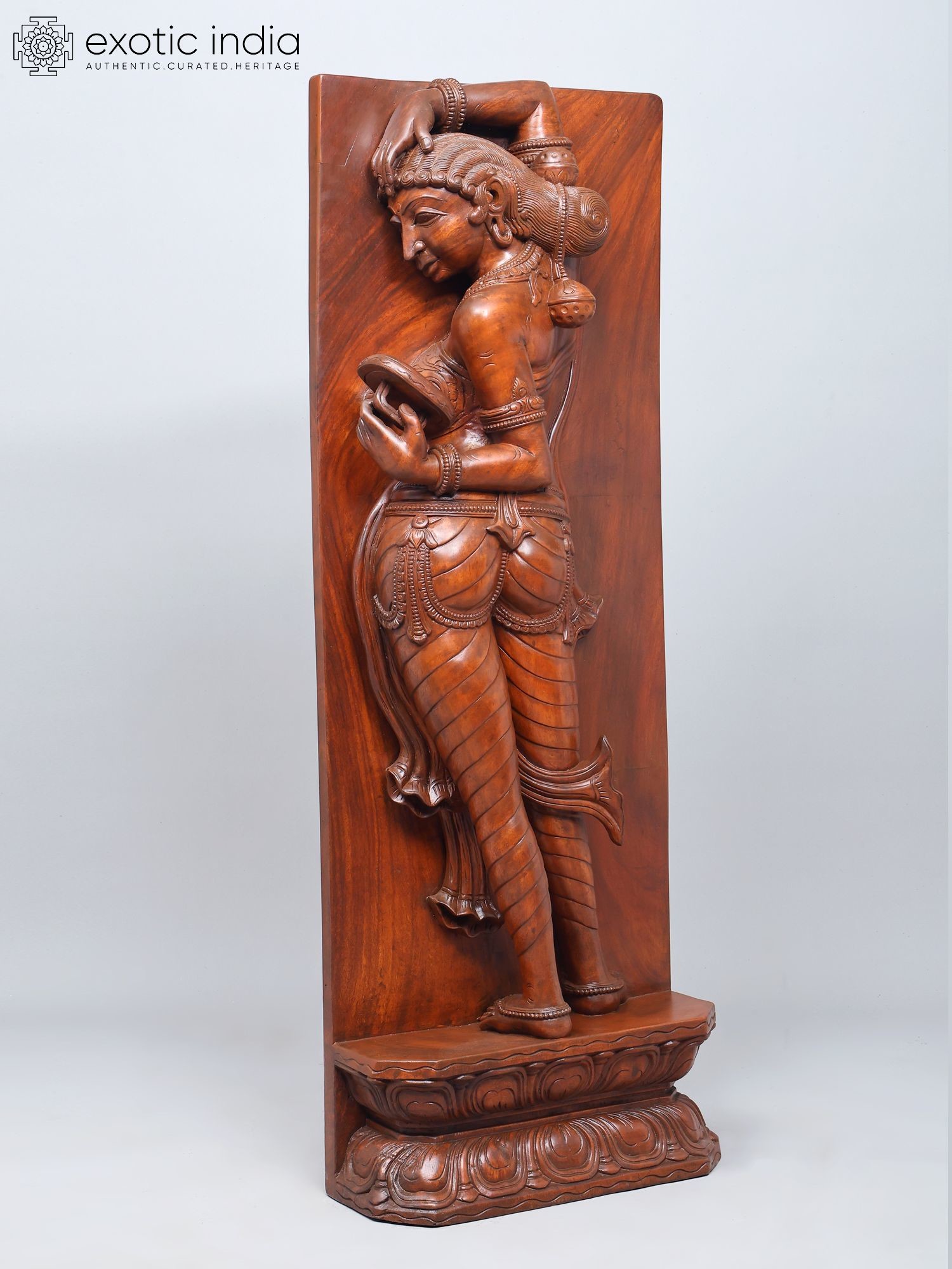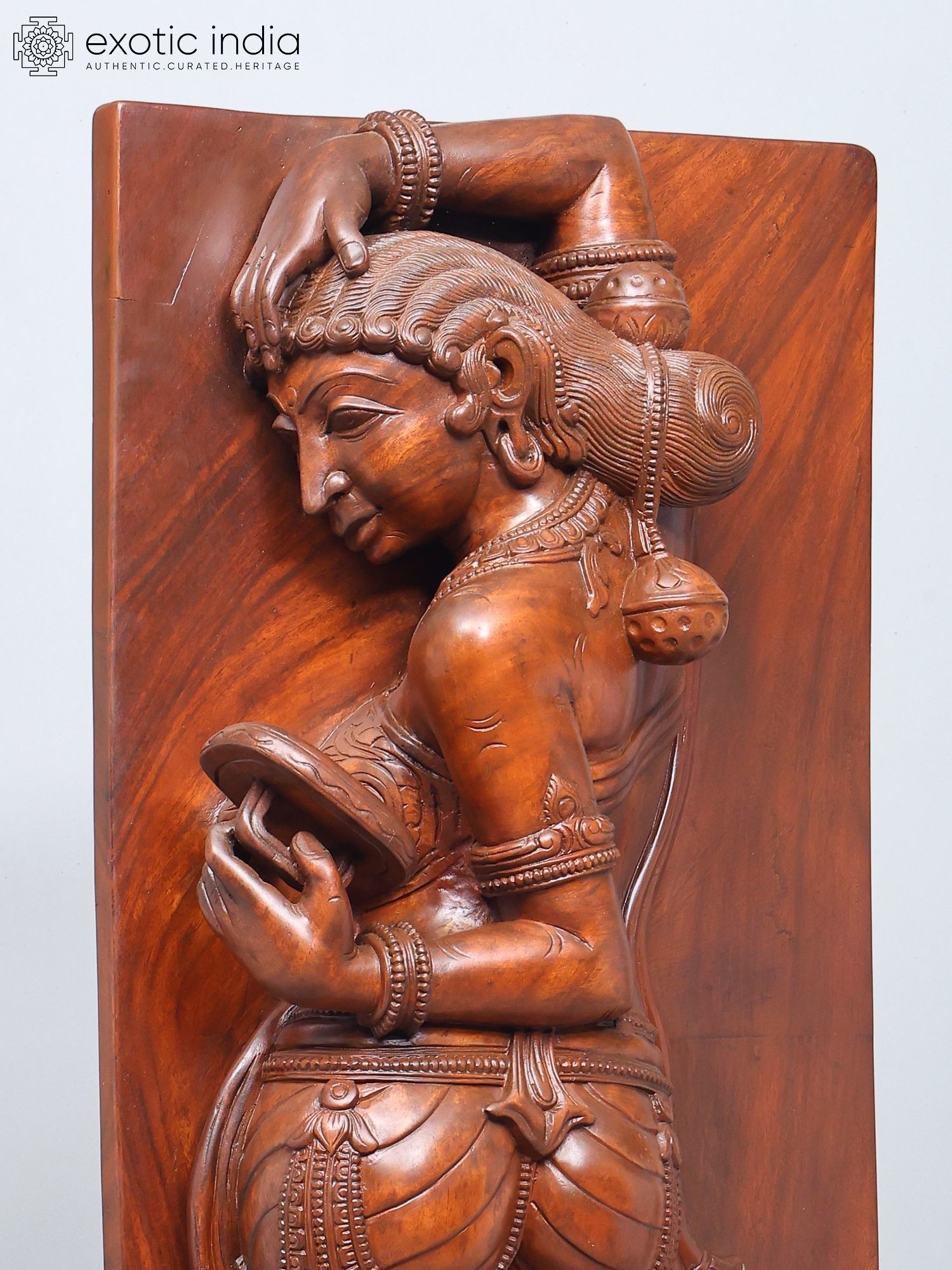 24" Wooden Statue of Apsara with Mirror | Darpana Sundari Idol