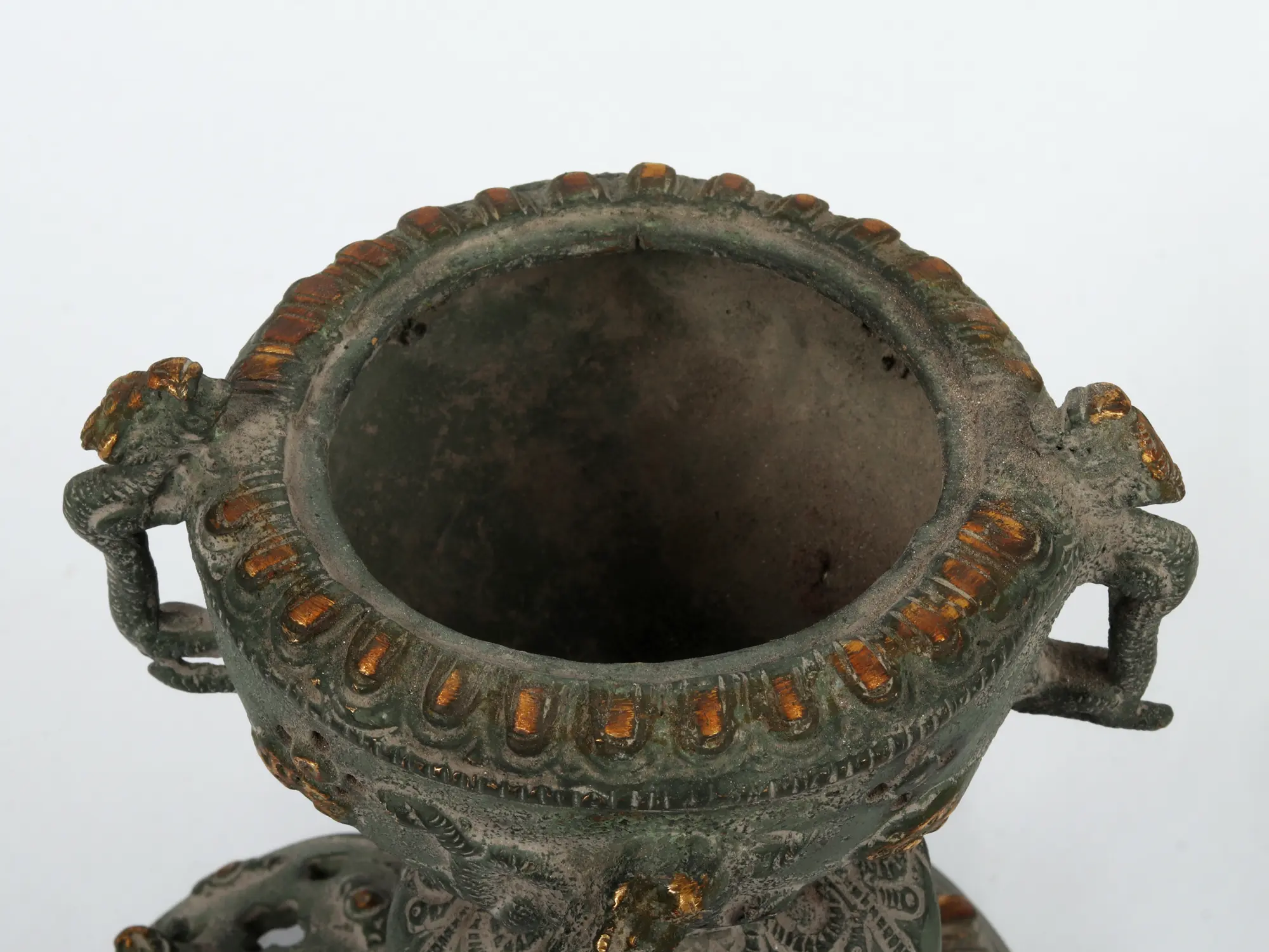 The greyish patina and distressed paint evoke the aura of a monastery relic, lending an authentic, timeless appeal. The spiritual essence combined with the artistic intricacies makes this incense burner not only a functional meditation tool but also a captivating decorative piece, transporting enthusiasts to the tranquil realms of Tibetan contemplation and ancient wisdom.