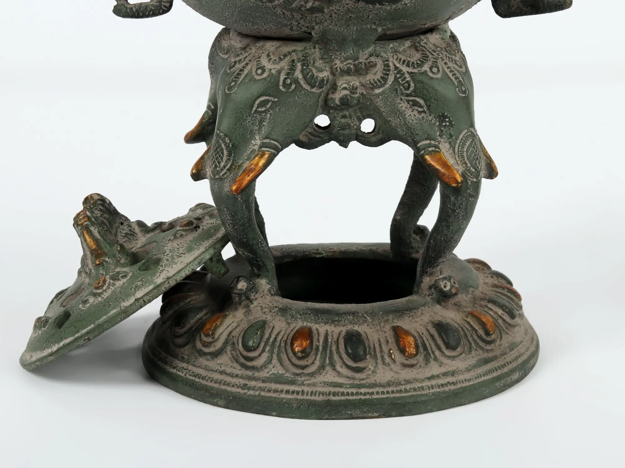 This Elephant Incense Burner, a divine brass statue, bridges artistry and spirituality with sacred dragon symbols adorning its body and handle. Creatively, the stand features intricately arranged elephant heads, portraying Tibetan influences. This unique piece, seemingly of Tibetan origin, has gained popularity for aiding meditation. As incense burns, fragrant plumes ascend, creating an ambiance conducive to mindfulness.