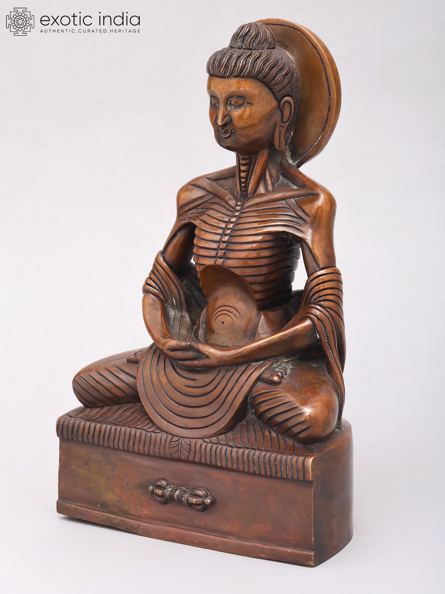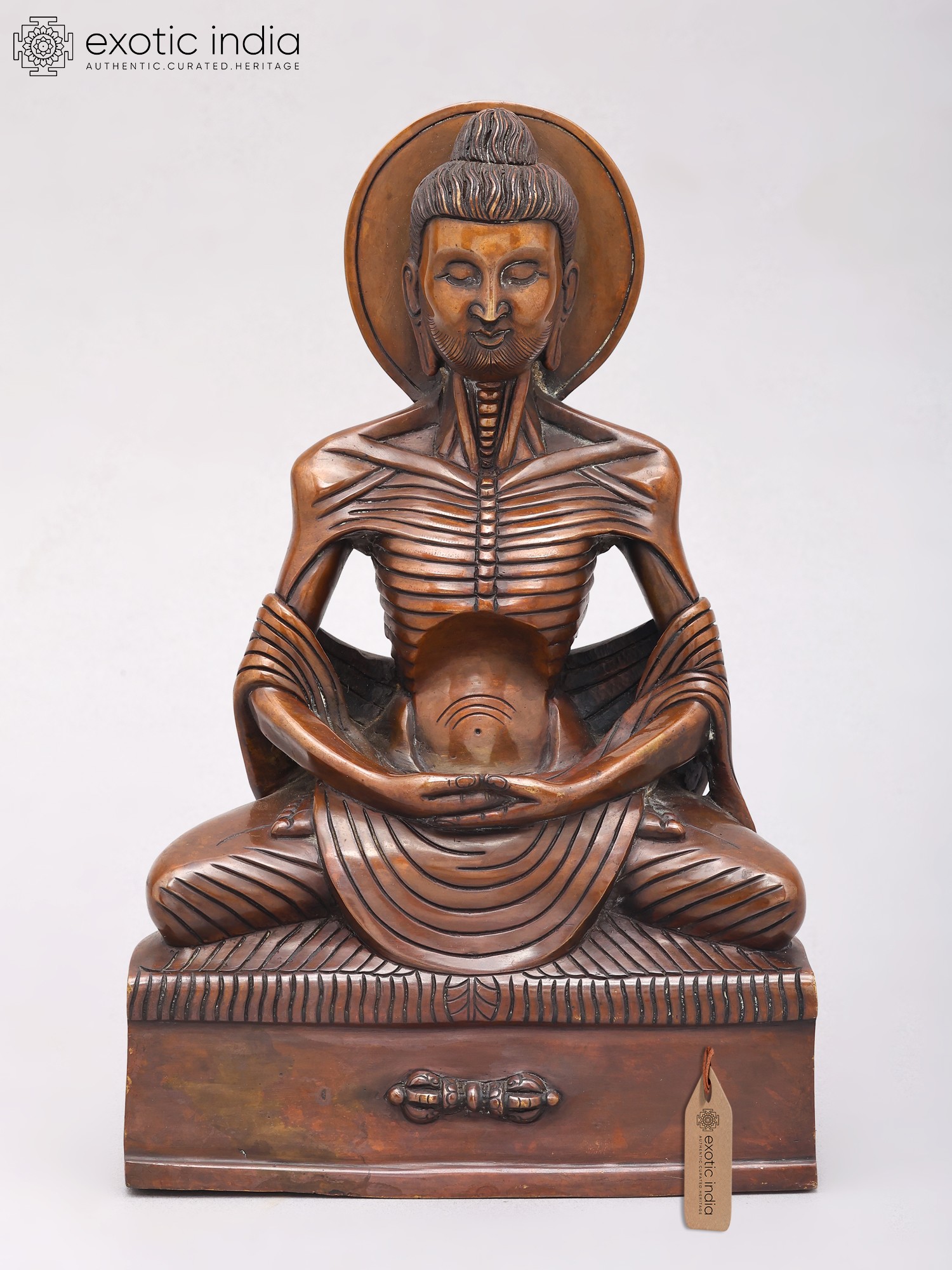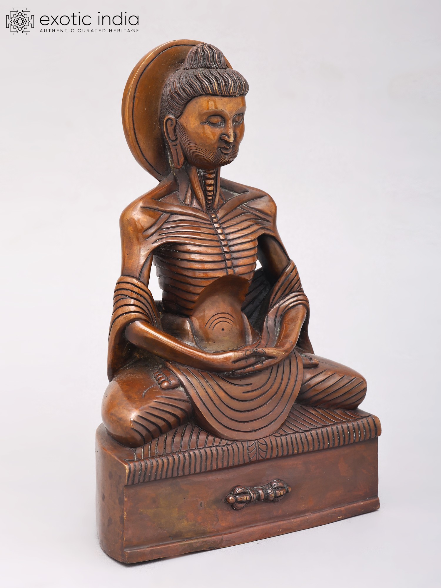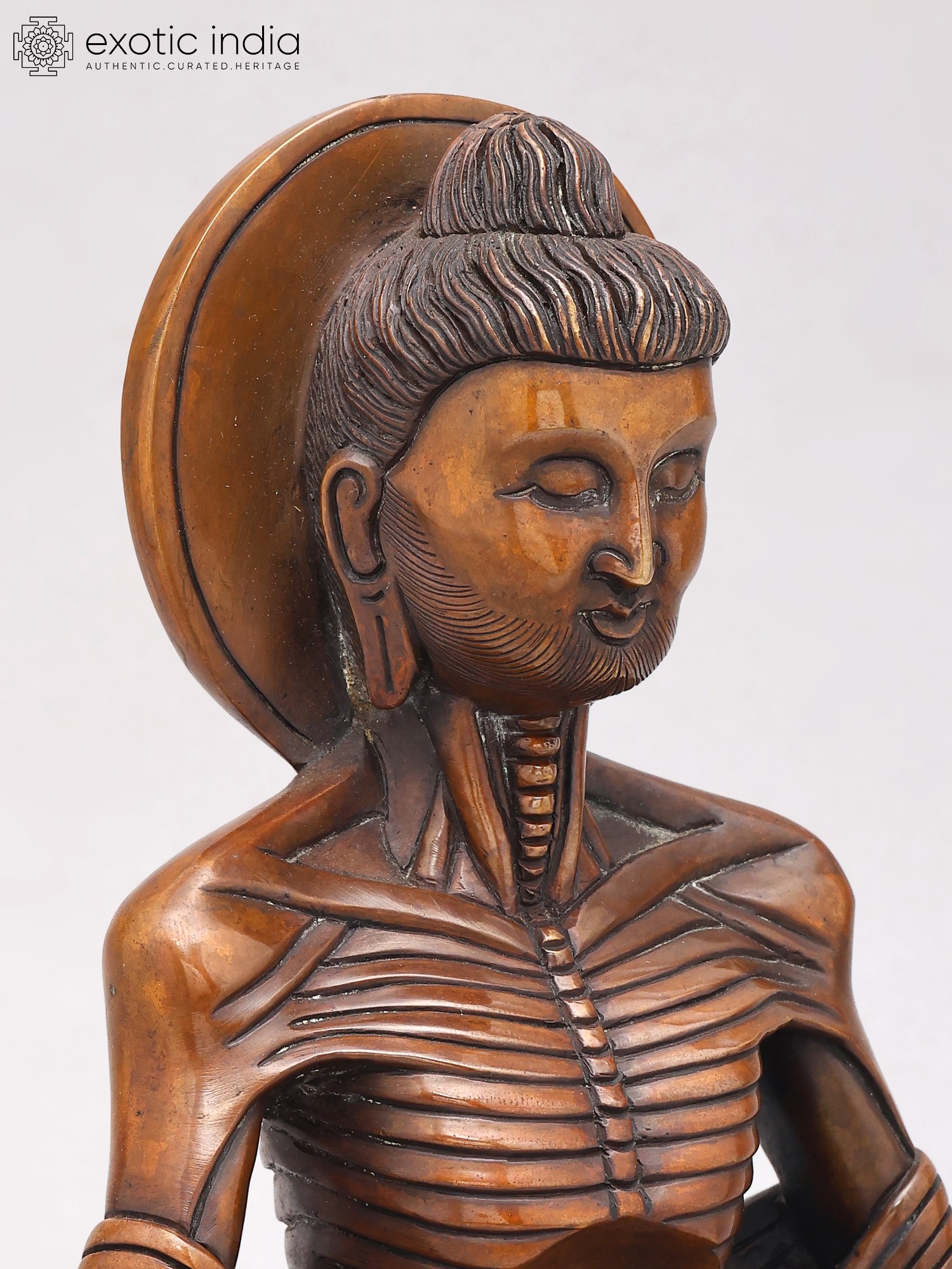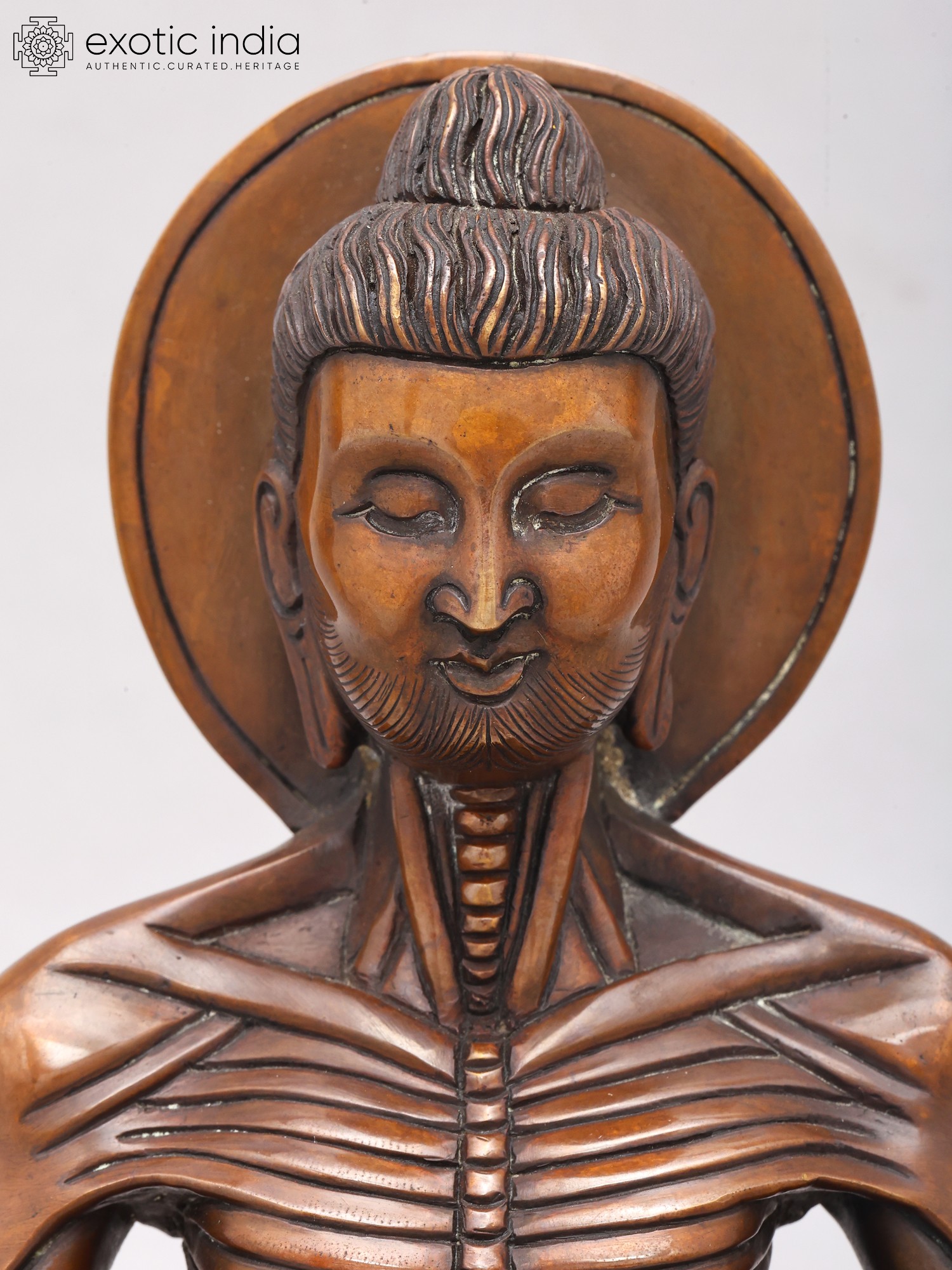 This striking copper statue depicts the Buddha in a state of profound asceticism, a poignant representation of his early years of intense spiritual discipline. Before achieving enlightenment, Siddhartha Gautama, the prince who would become the Buddha, subjected himself to rigorous fasting and self-mortification for years. This period of extreme austerity was an attempt to understand and overcome suffering through the complete denial of worldly pleasures and physical needs. This sculpture captures that pivotal moment, embodying the immense willpower and unwavering dedication that led to his ultimate awakening. The artist's skill is evident in the meticulous rendering of the emaciated form. Every rib is clearly defined, a testament to the Buddha's extreme fasting. His sunken cheeks, hollowed eyes, and visible bone structure speak volumes about the immense physical hardship he endured. Yet, despite the outward signs of suffering, his face radiates an inner peace and serene contemplation. This juxtaposition of extreme physical deprivation and profound spiritual tranquility is the essence of this powerful depiction. The serene expression suggests that even in the depths of self-denial, he found a path toward inner liberation. ––––––––––