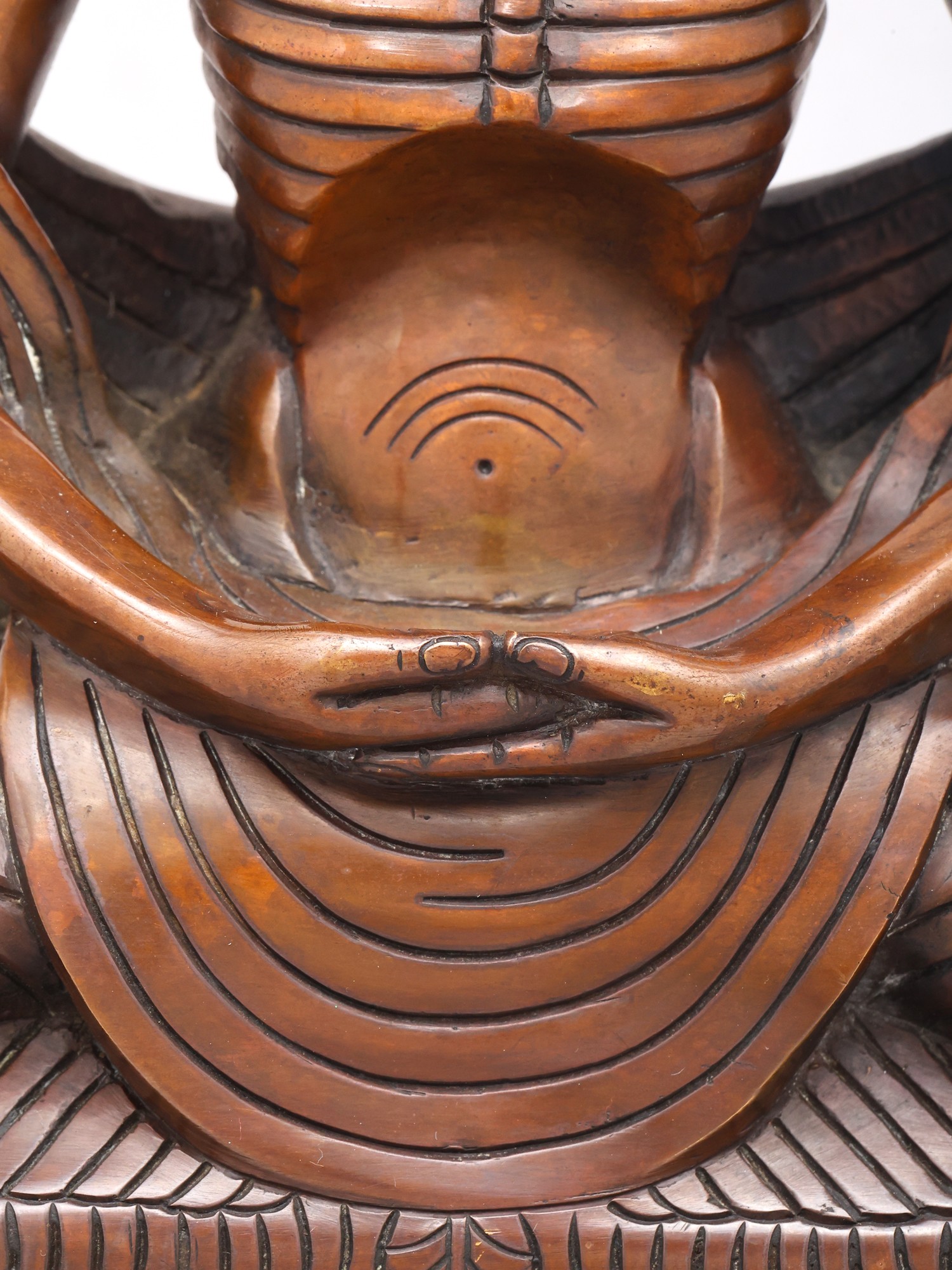 Handcrafted in Nepal, a land steeped in spiritual tradition and artistic heritage, this statue is a beautiful example of Nepalese craftsmanship. The use of copper lends a rich, enduring quality to the artwork. The details, from the serene face with closed eyes, hinting at deep meditation, to the intricately folded robes and the patterned base, showcase the dedication and artistry of the artisans. The base itself is adorned with symbols that hold significance in Buddhist cosmology, further enriching the spiritual narrative of the piece. This statue serves not only as a decorative item but also as a potent reminder of the Buddha's journey and the universal principles of self-discipline, perseverance, and the pursuit of inner peace. It is a piece that invites contemplation and embodies a profound spiritual message, making it a meaningful addition to any sacred space or personal collection.