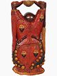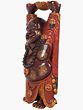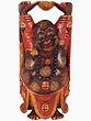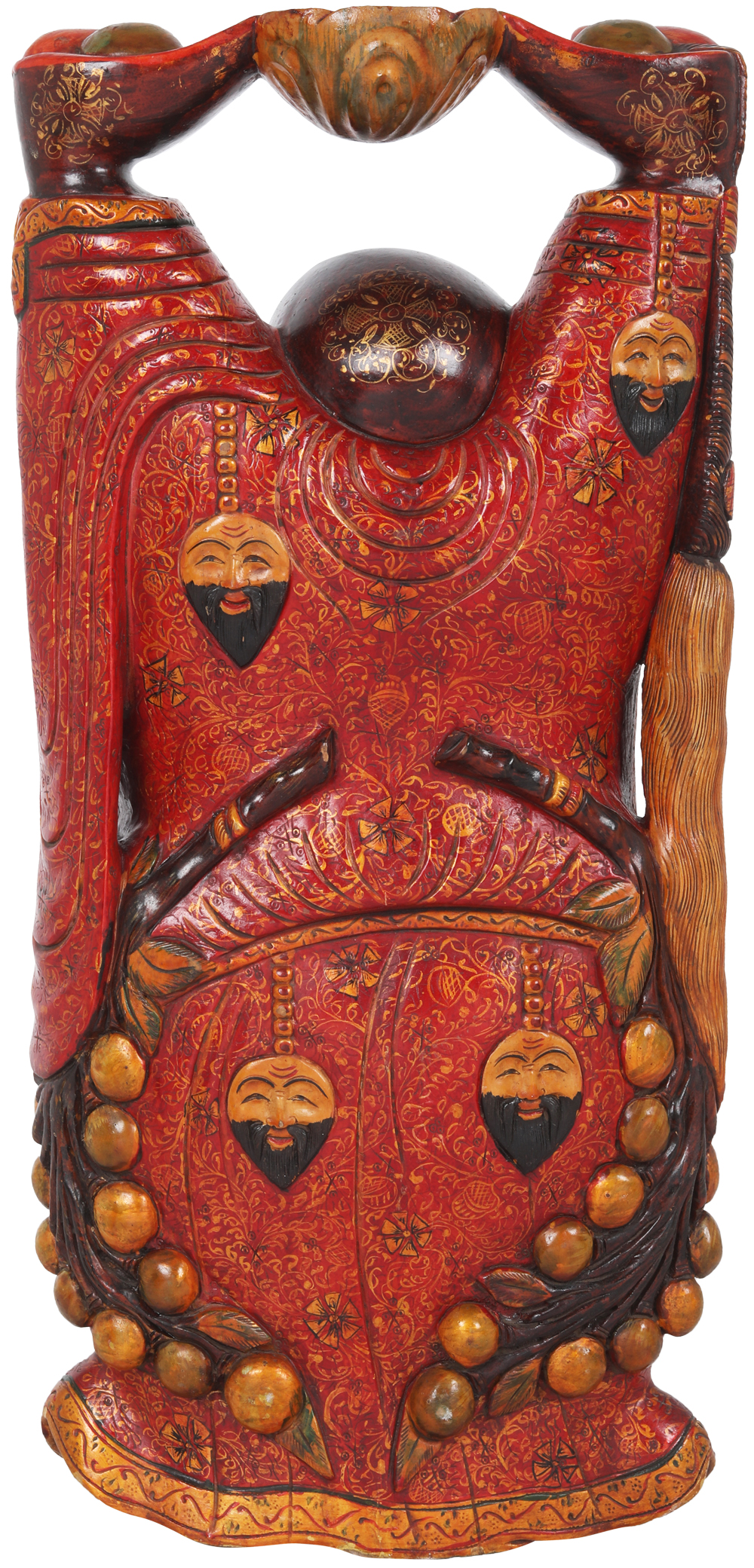 The sculpture shown here is carved in wood in a realistic posture in a blend of red, yellow, gold, and wine shade. Laughing Buddha holds a great significance in feng shui; he stands erect with his hands up and palms facing upward holding a lotus carved bowl and an ingot (ball) in each open palm symbolizing abundance and prosperity. It is said that if you rub his oversized belly, you can be an achiever of good luck. He is garbed in a multi-shaded robe, scored gracefully in a plethora of stylized floral patterns; his robe falls beautifully on his legs from the front in a flower petal style. Entire body is beautifully decorated with large floral golden patches accentuating the elegant and divine carving.