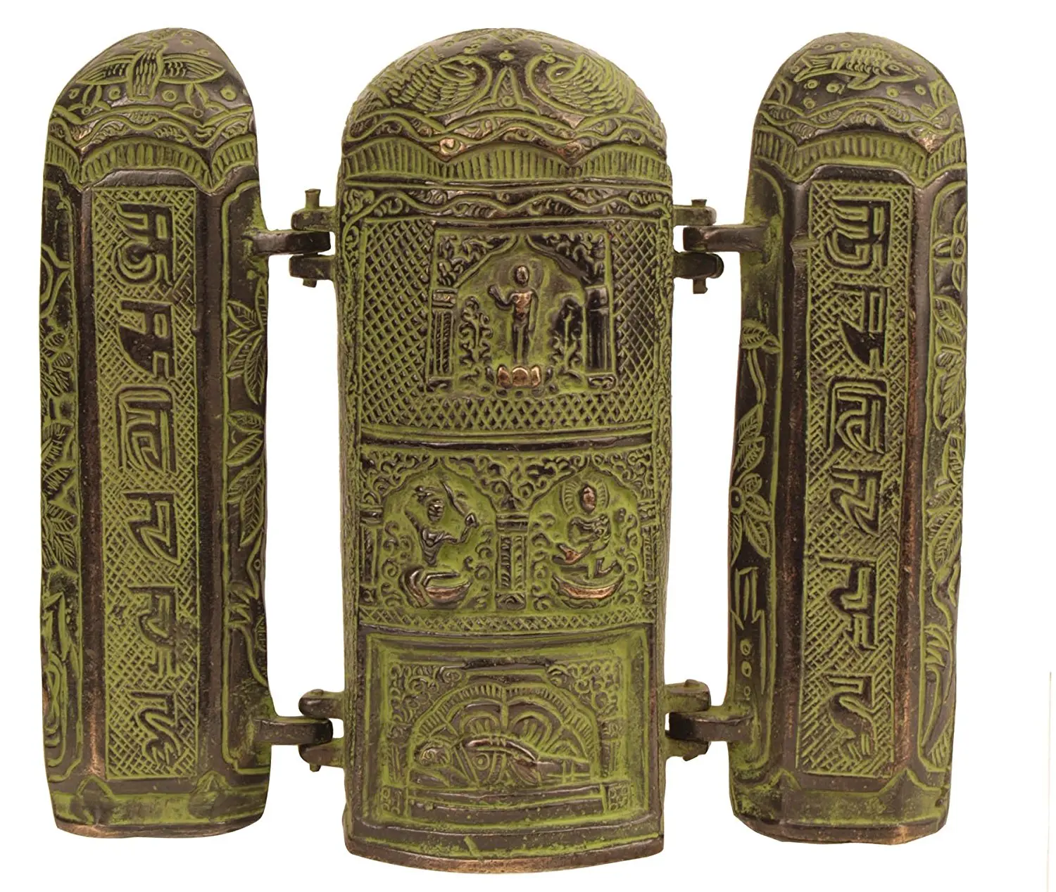 What makes this shrine particularly captivating are the movable doors that flank the central chamber. These doors are not mere functional elements; they are intricately carved with powerful imagery. Each door features a majestic, serpentine creature, possibly a Naga, a mythical serpent often associated with water, fertility, and protection in Hindu and Buddhist lore. These Nagas, rendered in raised relief, appear to be coiled guardians, their scaled bodies intricately detailed, their heads held high as if in vigilant watch. The symbology of the Naga reinforces the sacredness of the space and suggests protection against negative influences. The ancient tales speak of Nagas being protectors of treasures, and here, they guard the ultimate treasure: the wisdom of the Buddha. The green patina applied to the exterior of the shrine, including the doors, adds a rich, earthy depth, evoking the ancient patina often found on revered bronzes and statues that have been subjects of veneration for centuries.