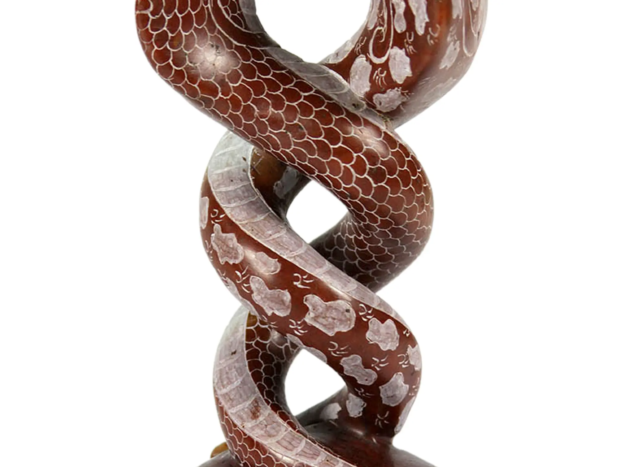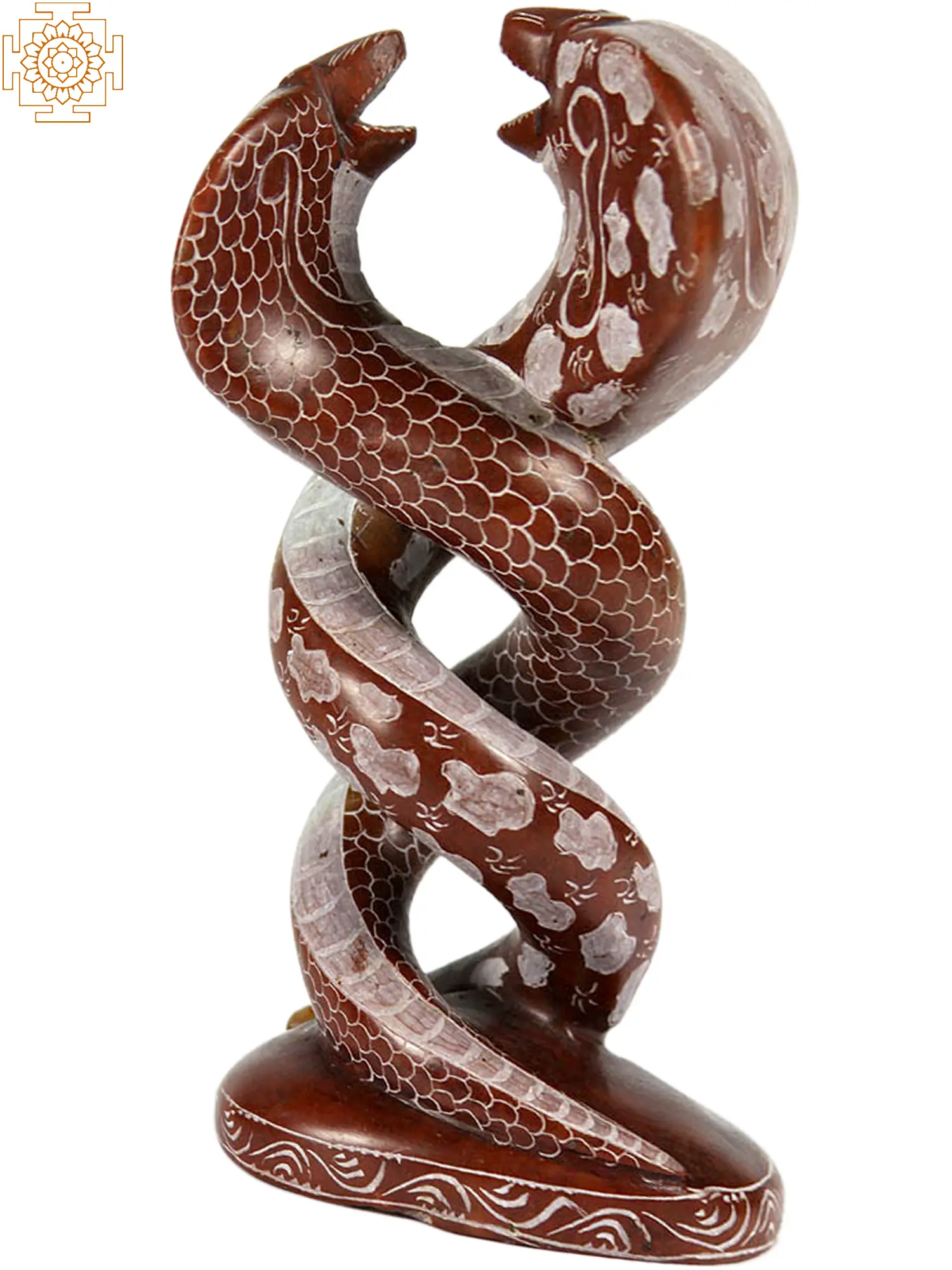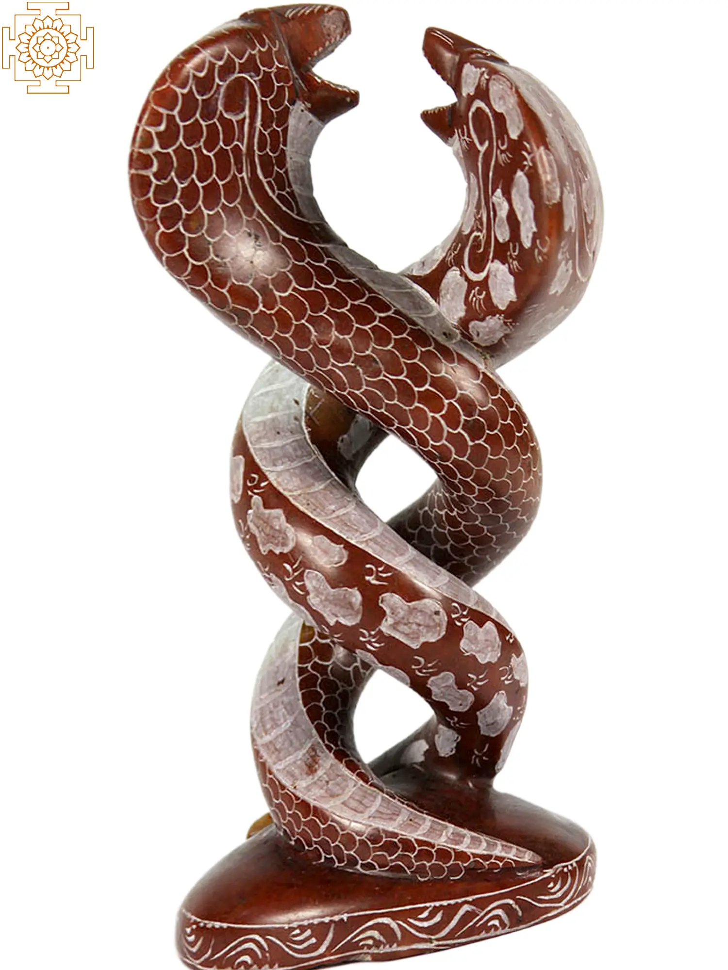 In Hindu and Buddhist traditions, serpents, or Nagas, are revered as powerful and wise beings. Often depicted as guardians of sacred treasures and cosmic energies, they are associated with water, fertility, and the earth. Nagas are not simply animals but possess divine qualities and the ability to shape-shift. They are often depicted with human-like features, symbolizing their intelligence and spiritual insight. The entwined serpent motif is particularly potent, resonating with ideas of duality, balance, and the union of opposing forces. It evokes the Kundalini energy, a dormant spiritual power believed to reside at the base of the spine, often depicted as a coiled serpent. This sculpture serves as a beautiful representation of the journey towards enlightenment and self-realization, encouraging the harmonious integration of the physical and spiritual realms.