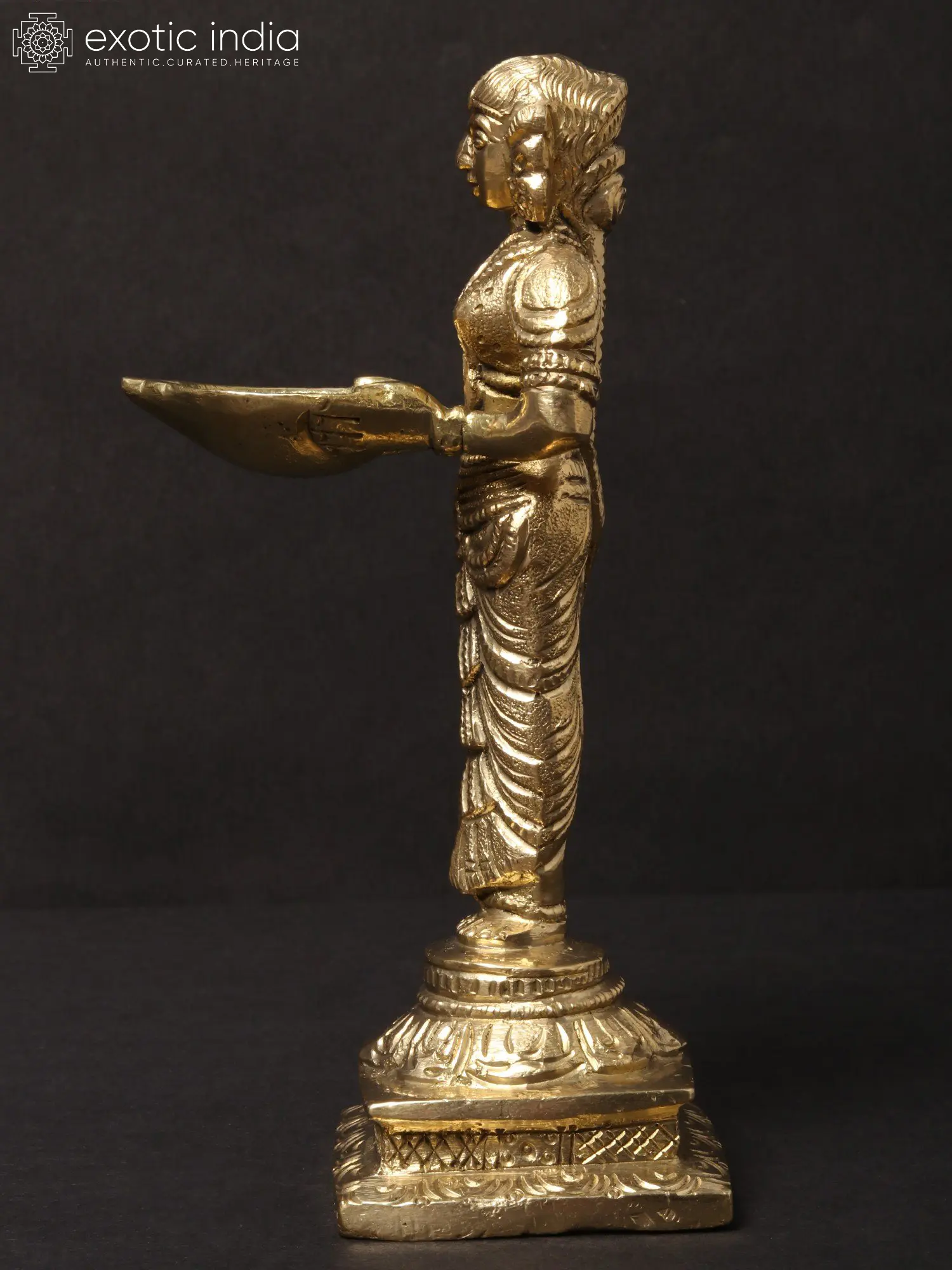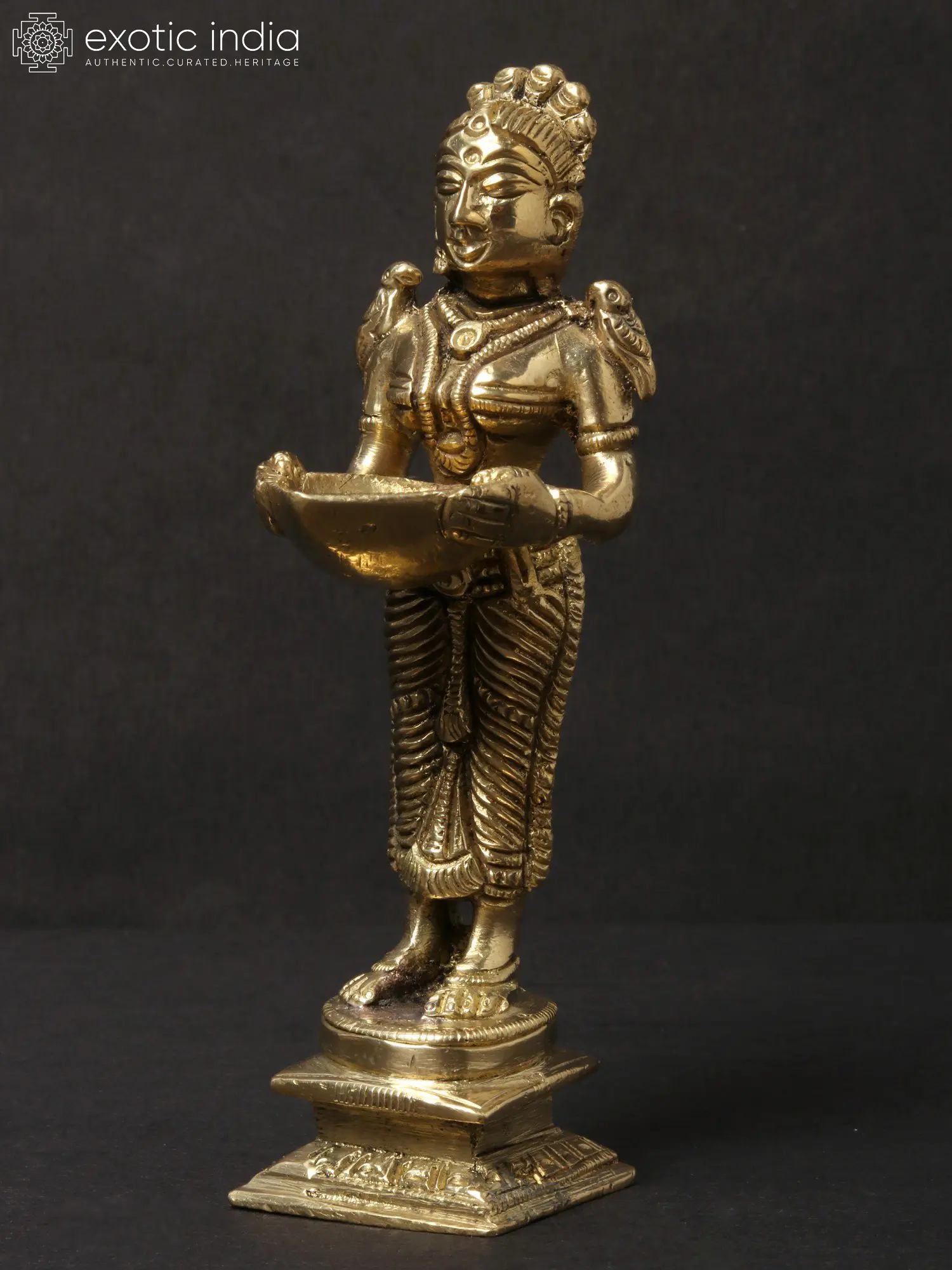 This elegant Paavai Vilakku (oil lamp) in gleaming brass celebrates Deep Lakshmi, a radiant form of the auspicious Goddess Lakshmi. Lakshmi, the embodiment of wealth, prosperity, and good fortune, is often depicted holding lotus flowers (symbolised by the lamp's design). The act of lighting the Paavai Vilakku with oil (dipa) is considered an offering to Lakshmi, inviting her blessings of abundance and illuminating the path toward success.
