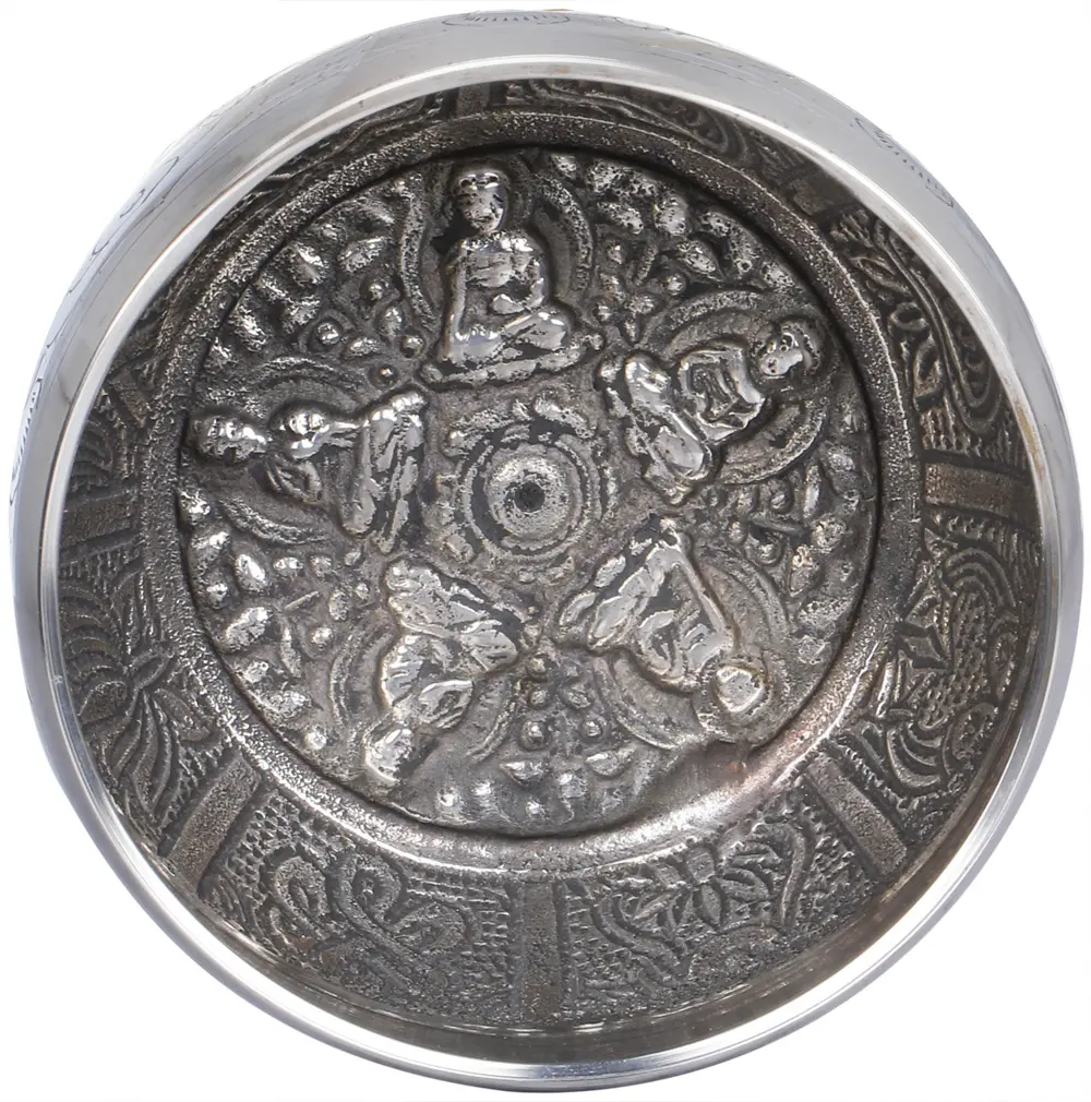 The Five Dhyani Buddhas, also known as the Jinas, are central figures in Vajrayana Buddhism, representing different aspects of enlightened consciousness. These five celestial Buddhas—Vairocana, Akshobhya, Ratnasambhava, Amitabha, and Amoghasiddhi—symbolize the five wisdoms and the five aggregates of existence. Each Dhyani Buddha is associated with a specific color, direction, element, and emotion, offering a profound cosmology for understanding the universe and the path to liberation. This singing bowl, inspired by their presence, serves as a reminder of these fundamental principles and the potential for awakening within each individual. The symbolic representation of these enlightened beings, subtly integrated into the bowl's design, enhances its spiritual significance, making it a powerful tool for meditation and self-discovery. ––––––––––––––––––