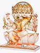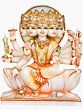 This marble image, a highly intricate form for a female divinity in a medium like stone, the ten arms branching over a single torso, and five faces, practically one neck holding them, represents the five-faced and ten-armed goddess Gayatri. Gayatri is more often revered in Hindu pantheon as one of the goddesses in Shaivite line, though here in this marble statue most of the attributes that she is carrying, mainly, disc, lotus, mace and conch, relate to Vaishnavite stream. Besides the normal right and left hands held in ‘abhay’ and ‘varad’ and aforementioned other four specific to the images of Lord Vishnu, the goddess is holding in rest of her hands a bowl, rod, noose and bow – other divine attributes held by various gods of either stream. Apart, she is seated on a full-blown large lotus, another Vaishnava feature of the image. The goddess has been represented as seated in ‘lalitasana’ – sitting posture revealing rare beauty, on a large lotus laid over a rectangular platform.