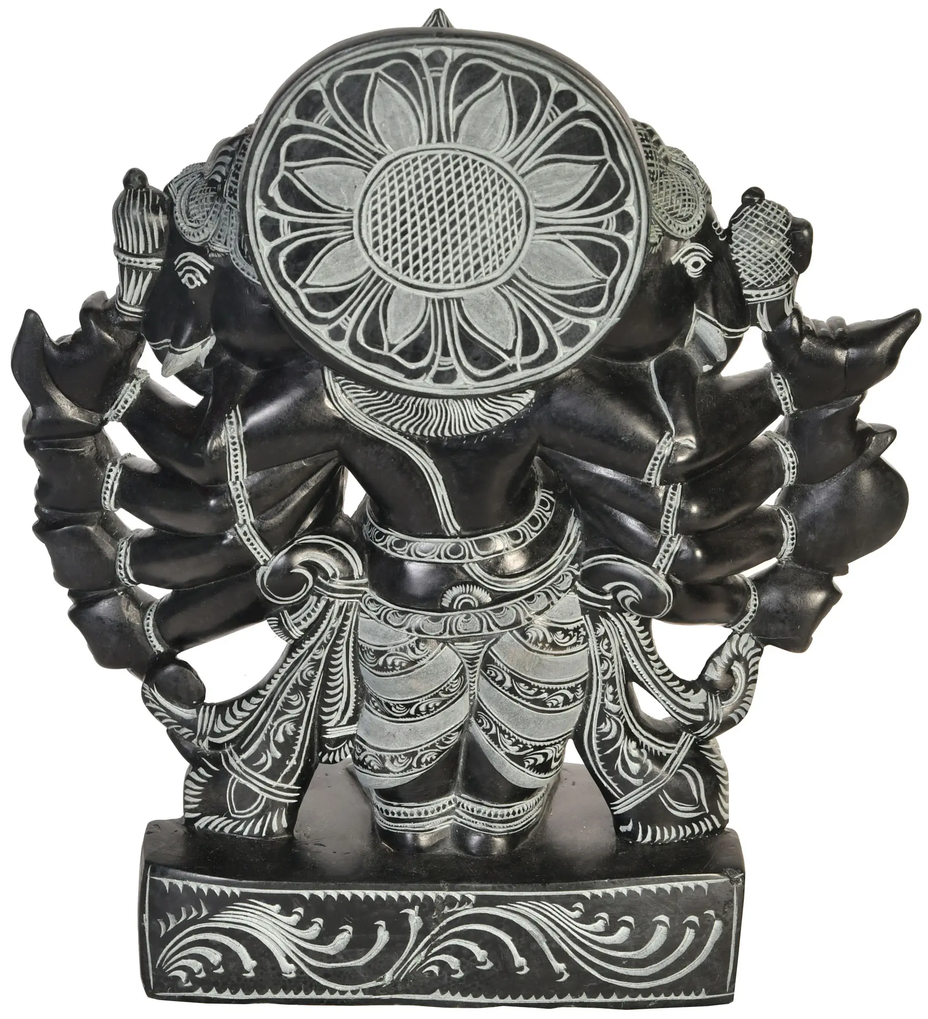 This exquisite sculpture captures the formidable and benevolent presence of Lord Ganesha, the remover of obstacles and the patron of new beginnings. Crafted from the dark, rich hues of Katappa stone, this magnificent piece emanates an aura of ancient wisdom and divine power. The artistry, hailing from the renowned sculptural traditions of Mahabalipuram, is evident in every meticulously carved detail, from the intricate ornamentation to the serene yet commanding expressions on each of the five divine faces. –––––––––––––––––––