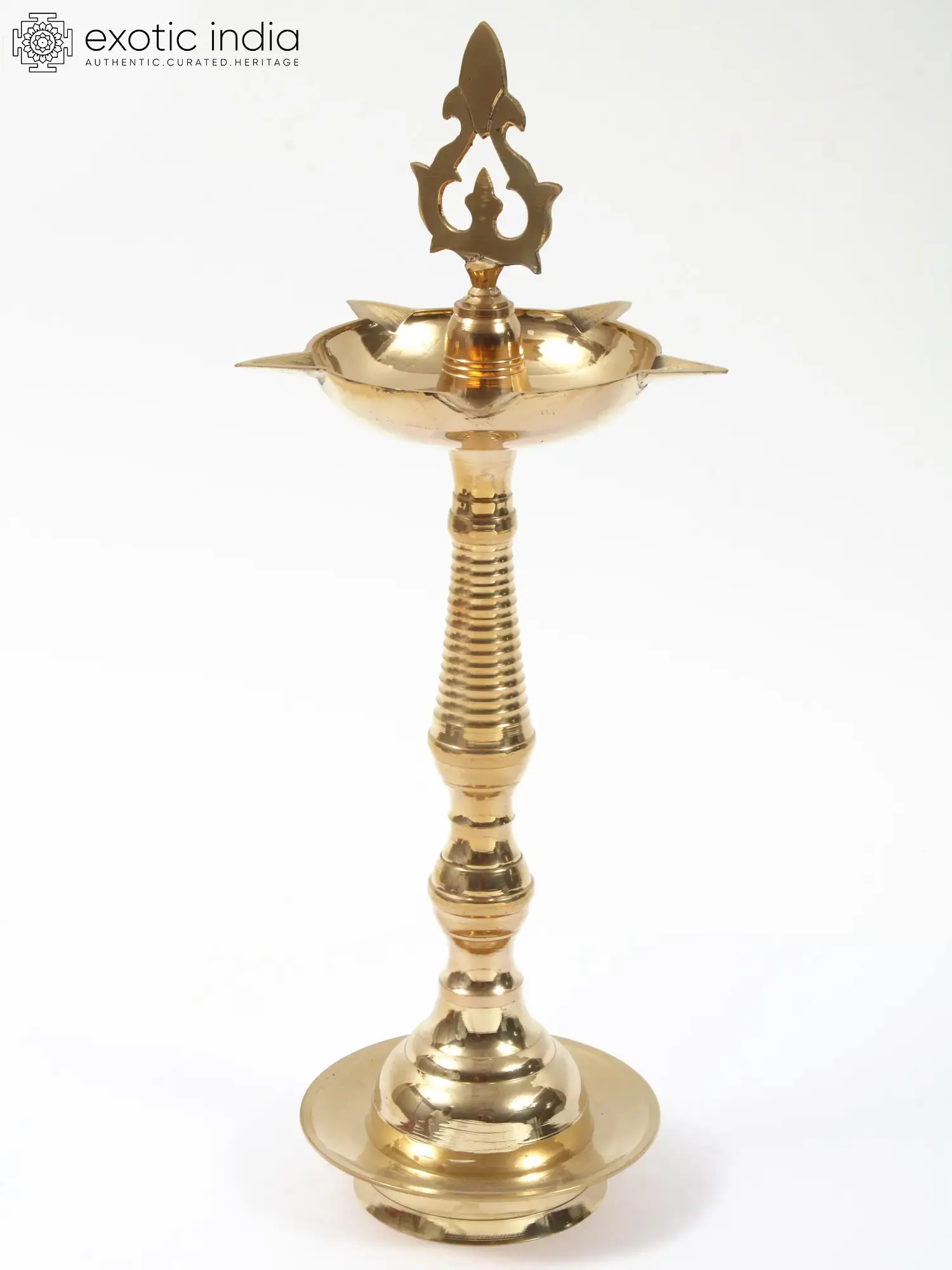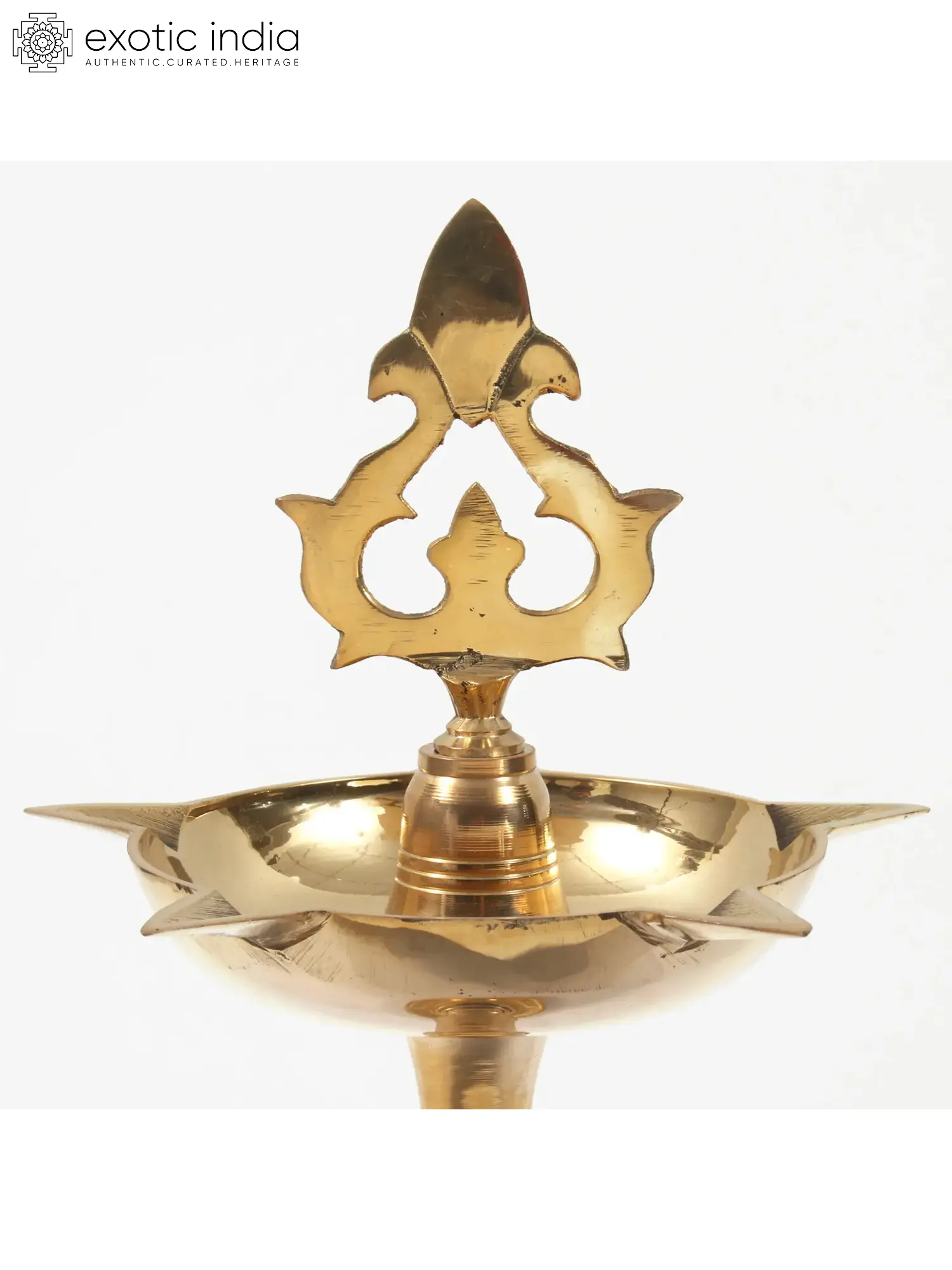 Kuthu Vilakkus are an intrinsic part of Southern India‘s cultural heritage, for ages they have been used in various rites and rituals and are said to invocate the divine through the way they’re designed to illuminate according to the Agama Shastras. Made in solid gold-plated brass this Panchmukhi deepam (five-wicked lamp) has a Kalasha (sacred pitcher) gear. A perfect addition to your space for practicing spirituality!